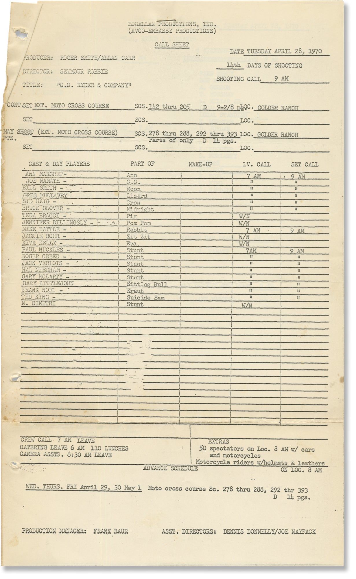Los Angeles: Rogallian Productions, 1970. Fourth Draft script for the 1970 film, seen here under the working title "C.C. Ryder and Company." Bound in with the script is a two-page call sheet.