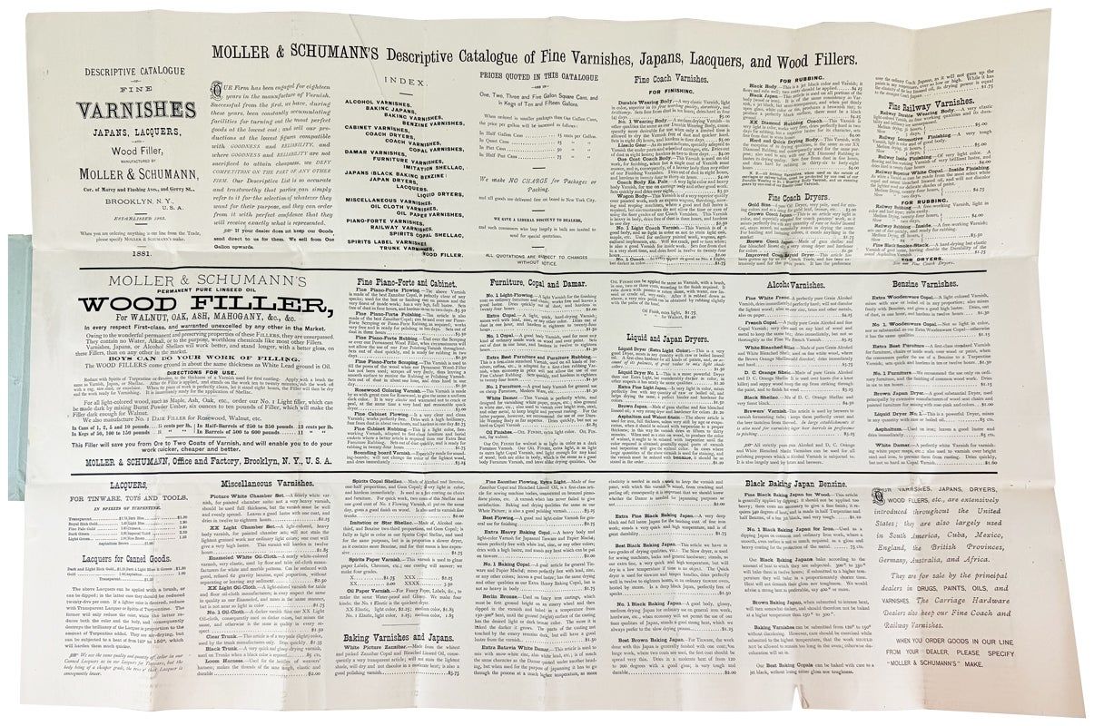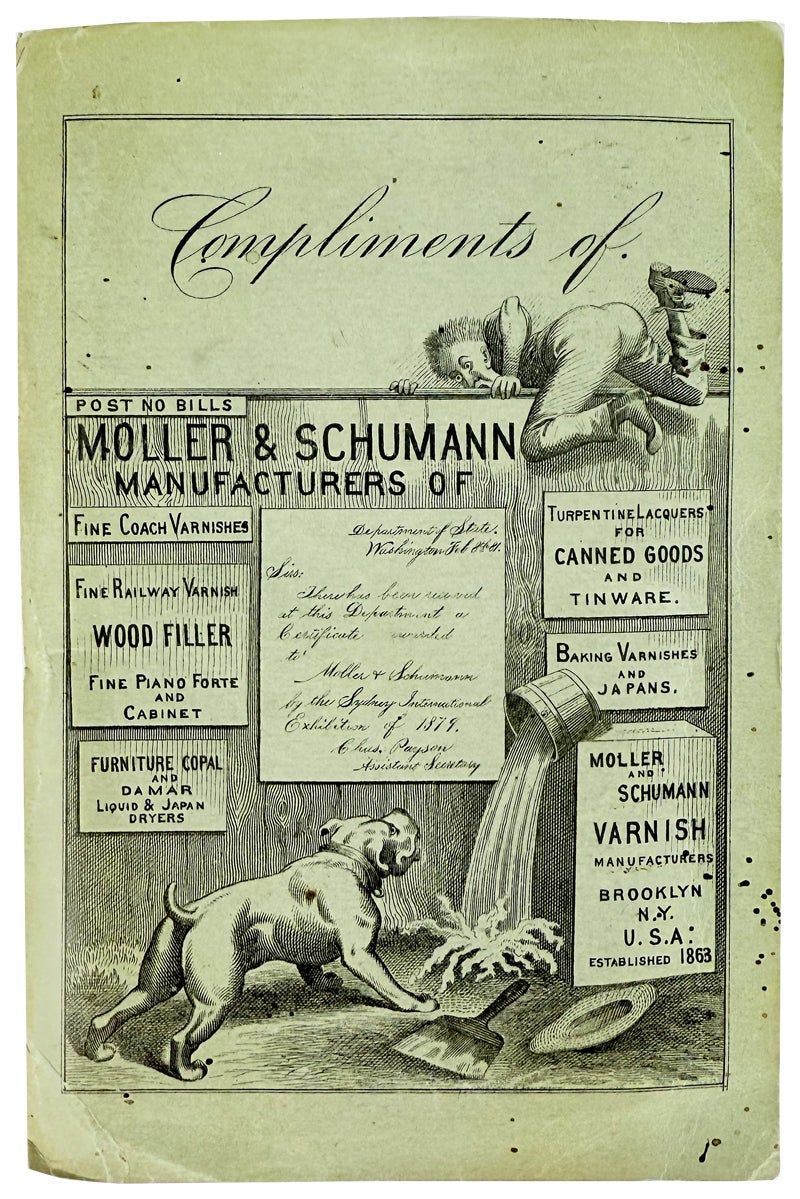 Brooklyn, NY: Gaylord Watson / Moller & Schumann, 1881. Very Good. Brooklyn, NY: Gaylord Watson / Moller & Schumann, 1881. Original engraved hand-colored map (ca. 40.5x60cm) folded into original blue-green pictorial card wrappers (16x10cm); map verso provides a complete catalog of the varnishes manufactured by Brooklyn company Moller & Schumann. Minor wear and scattered spotting to wrapper margins, brief split to a couple map folds, else a Very Good or better, bright and sound example.