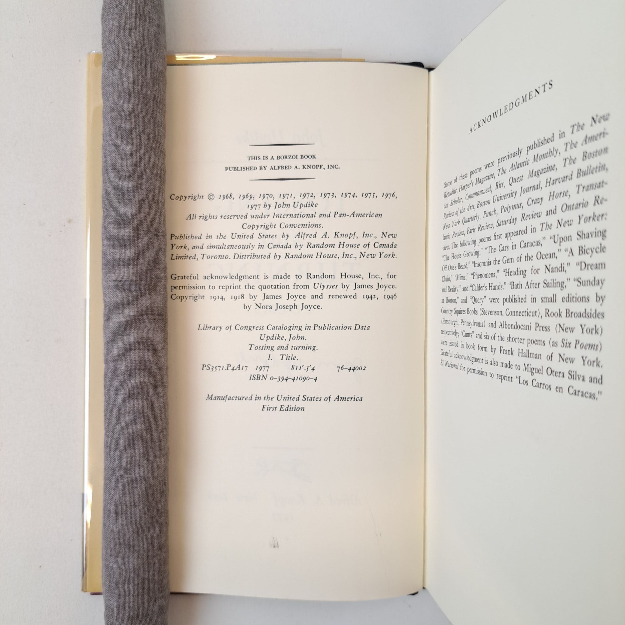New York, New York: Alfred A. Knopf, 1977. First Edition, First Printing. Hardcover. Octavo, 90 pages. In Very Good condition with Very Good condition dust jacket. Spine is cream with black and dark purple lettering. Dust jacket protected by mylar covering, price uncut: "$7.95" on front flap, and has mild general age-toning. Boards have mild discoloration along spine head and tail. Textblock head edge dyed navy blue. Signed flat on title page by John Updike. Shelved Room C. 1398151. Special Collections.