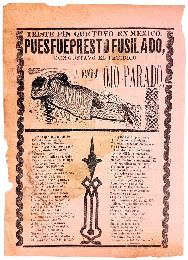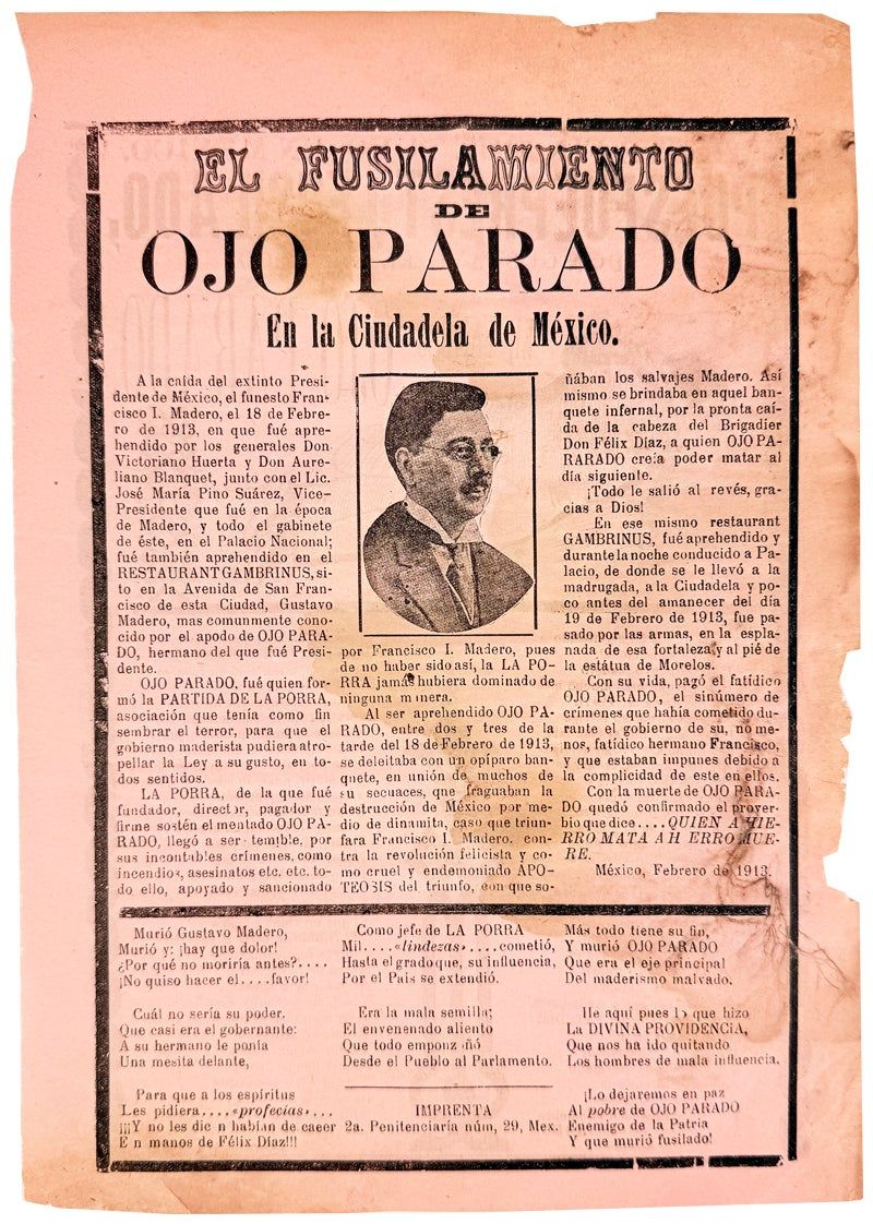 Elegy to the recently-murdered Gustavo A. Madero (1875-1913), also known as "Ojo Parado" due to his glass eye. Madero was brother of Mexican president Francesco I. Madero. During the coup d'etat of 1913 Madero was arrested and handed over to followers of the rebellion's leader Felix Diaz, who tortured and killed him. The verso of this broadside features an illustration attributed to Jose Guadalupe Posada showing the prostrate Madero after his murder--this illustration would have had to be recycled, given that Posada died a month before Madero's demise. The verso is adorned with a small photographic portrait of Madero surrounded by text describing the events leading up to his death.