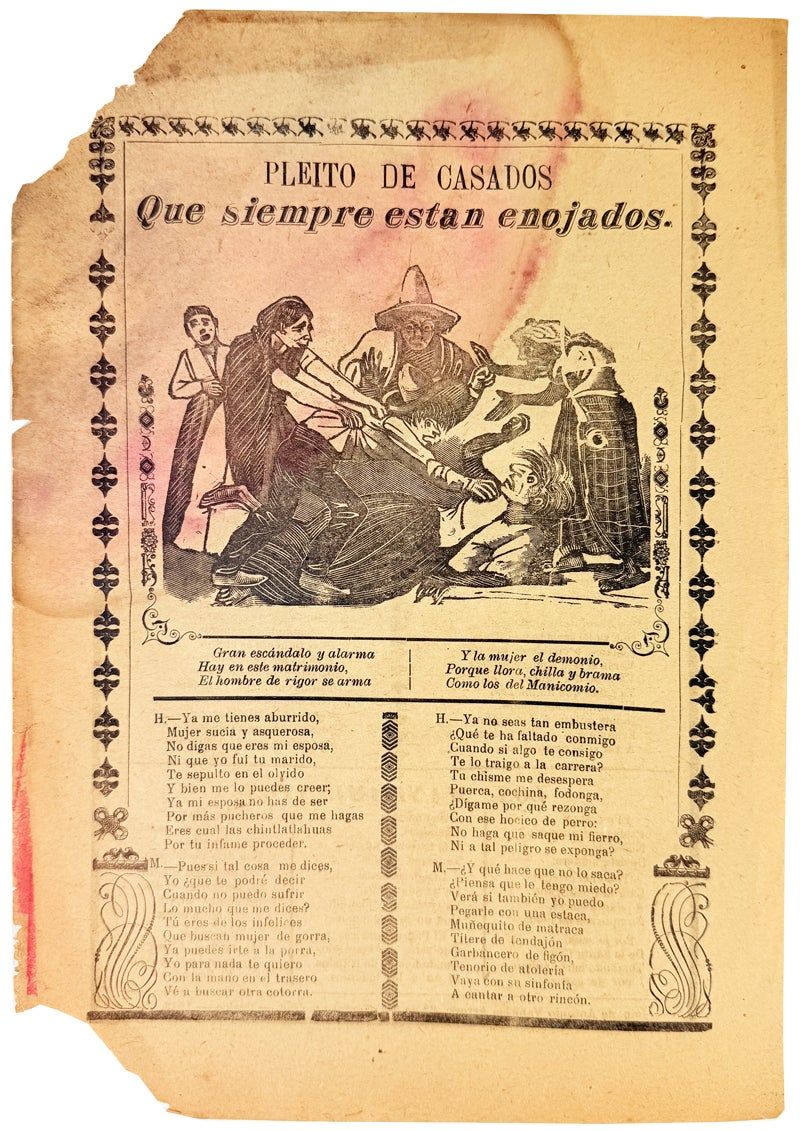 Attributed to Jose Guadalupe Posada or possibly his less sophisticated contemporary Manuel Manilla, both of whom contributed hundreds of cuts for the penny newspapers and poetry broadsheets printed by Antonio Vanegas Arroyo.