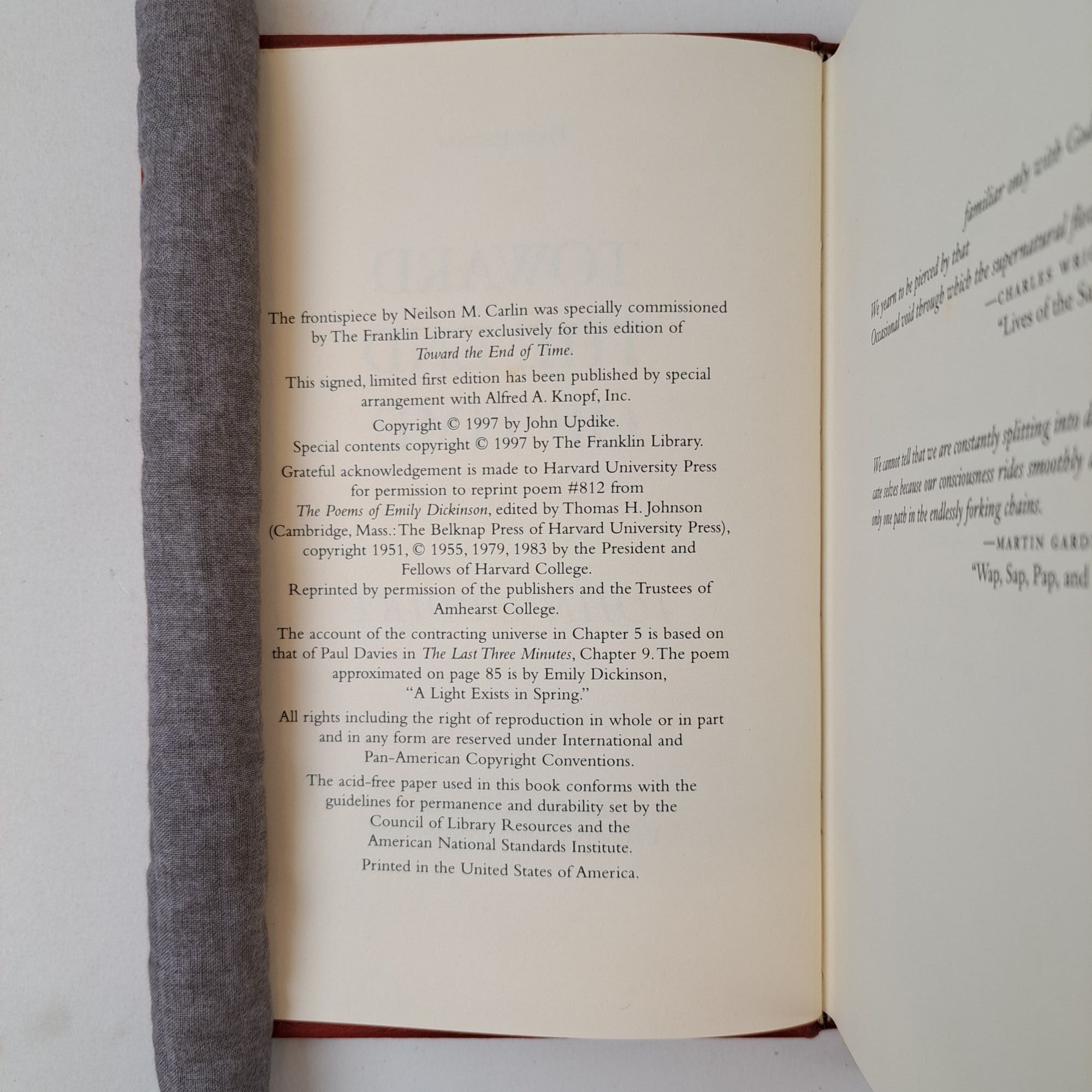 Franklin Center, Pennsylvania: The Franklin Library, 1997. Limited Edition one/1,400. Hardcover. Octavo, 334 pages. In Very Good condition. Spine is red with gilt lettering and details. Fully bound in red leather, mild fraying to the end of sewn-in ribbon bookmark. Textblock edges are gilded; interior has marbled endpapers, mild foxing along publisher's limitation page, and pencil indentation from previous seller's pricing along limitation page head edge. Signed flat by John Updike on publisher's limitation page. Shelved Room C. 1398171. Special Collections.