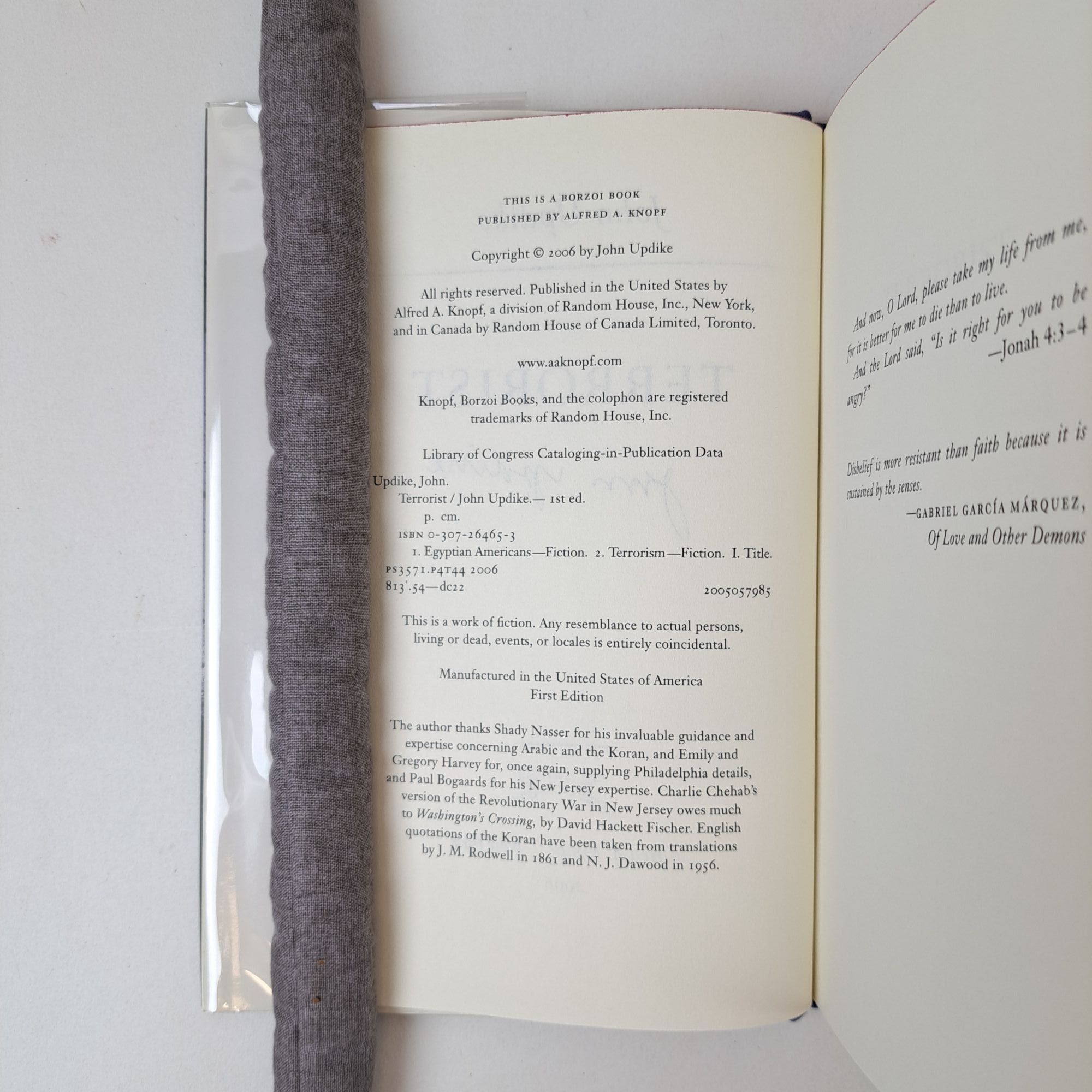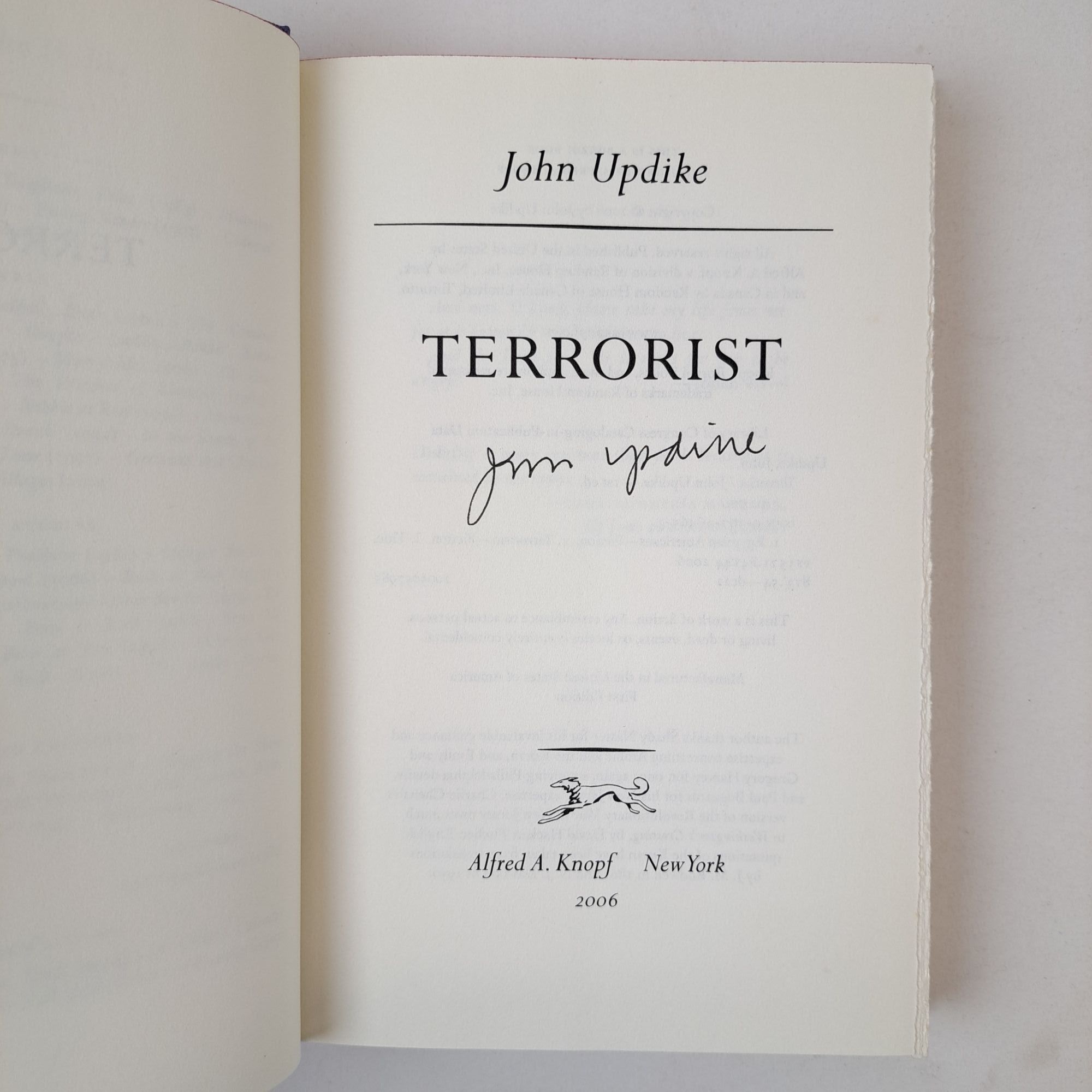 New York, New York: Alfred A. Knopf, 2006. First Edition, First Printing. Hardcover. Octavo, 310 pages. In Very Good condition with Very Good condition dust jacket. Spine is black and purple with white lettering. Dust jacket protected by mylar covering, price uncut: "$24.95" on front flap, Boards have mild shelving wear along spine tail. Textblock head edge dyed magenta. Signed flat on title page by John Updike. Shelved Room C. 1398177. Special Collections.