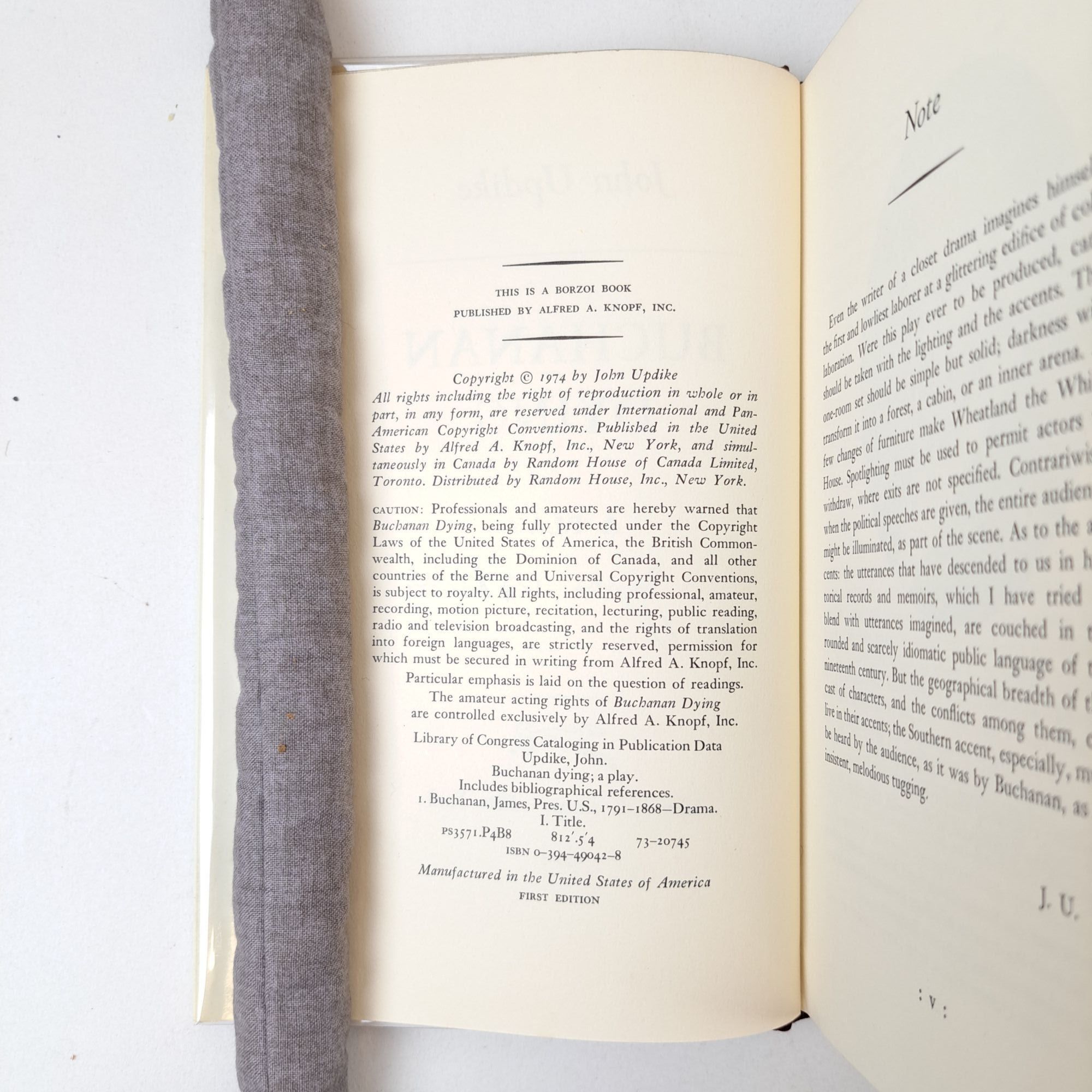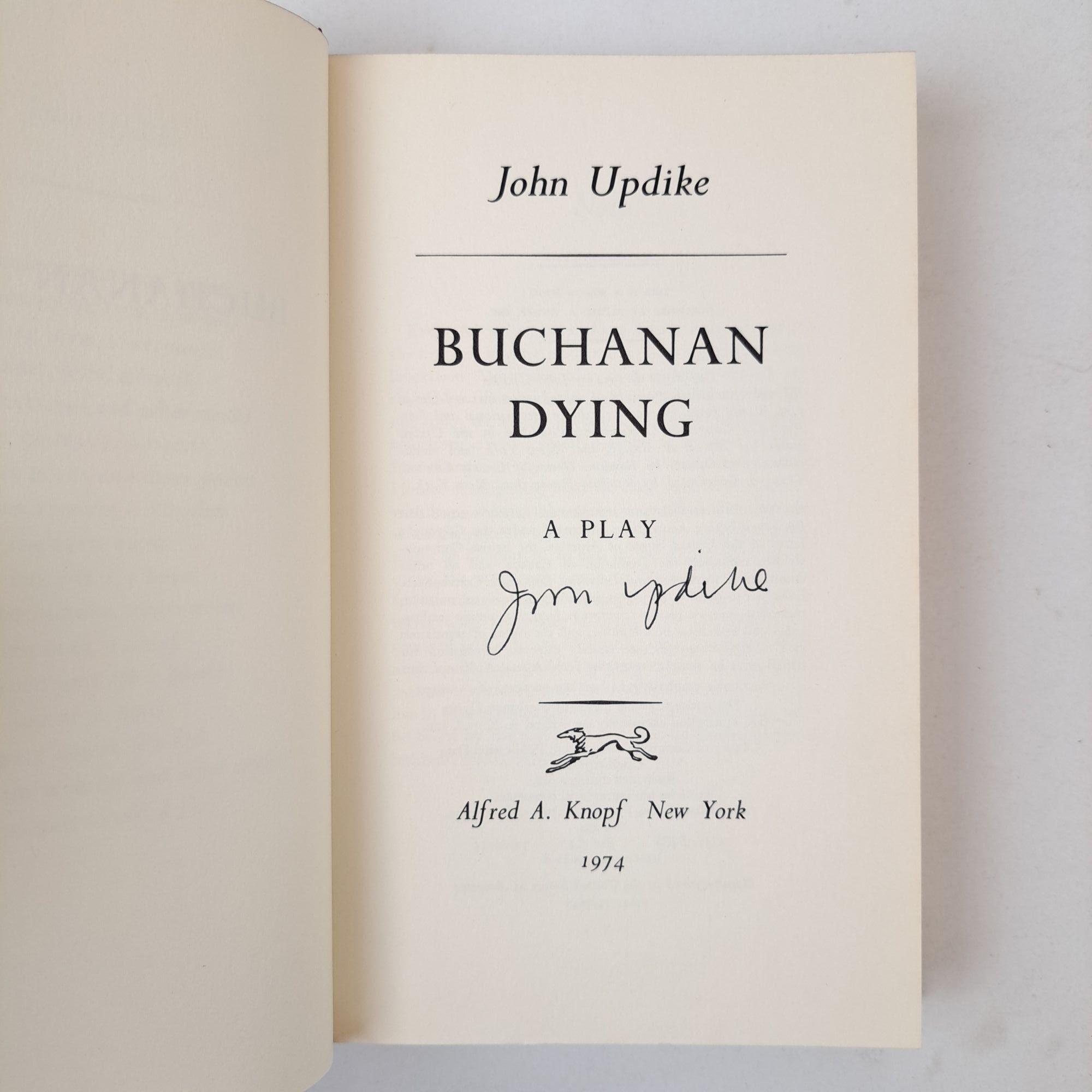 New York, New York: Alfred A. Knopf, 1974. First Edition, First Printing. Hardcover. Octavo, 262 pages. In Very Good condition with Very Good condition dust jacket. Spine is black with white and red lettering. Dust jacket protected by mylar covering, price uncut: "$6.95" on front flap. Boards have mild shelving wear along spine tail. Textblock head edge dyed gray, publisher's red stamp remainder mark on tail edge; pictorial endpapers. Signed flat on title page by John Updike. Shelved Room C. 1398178. Special Collections.