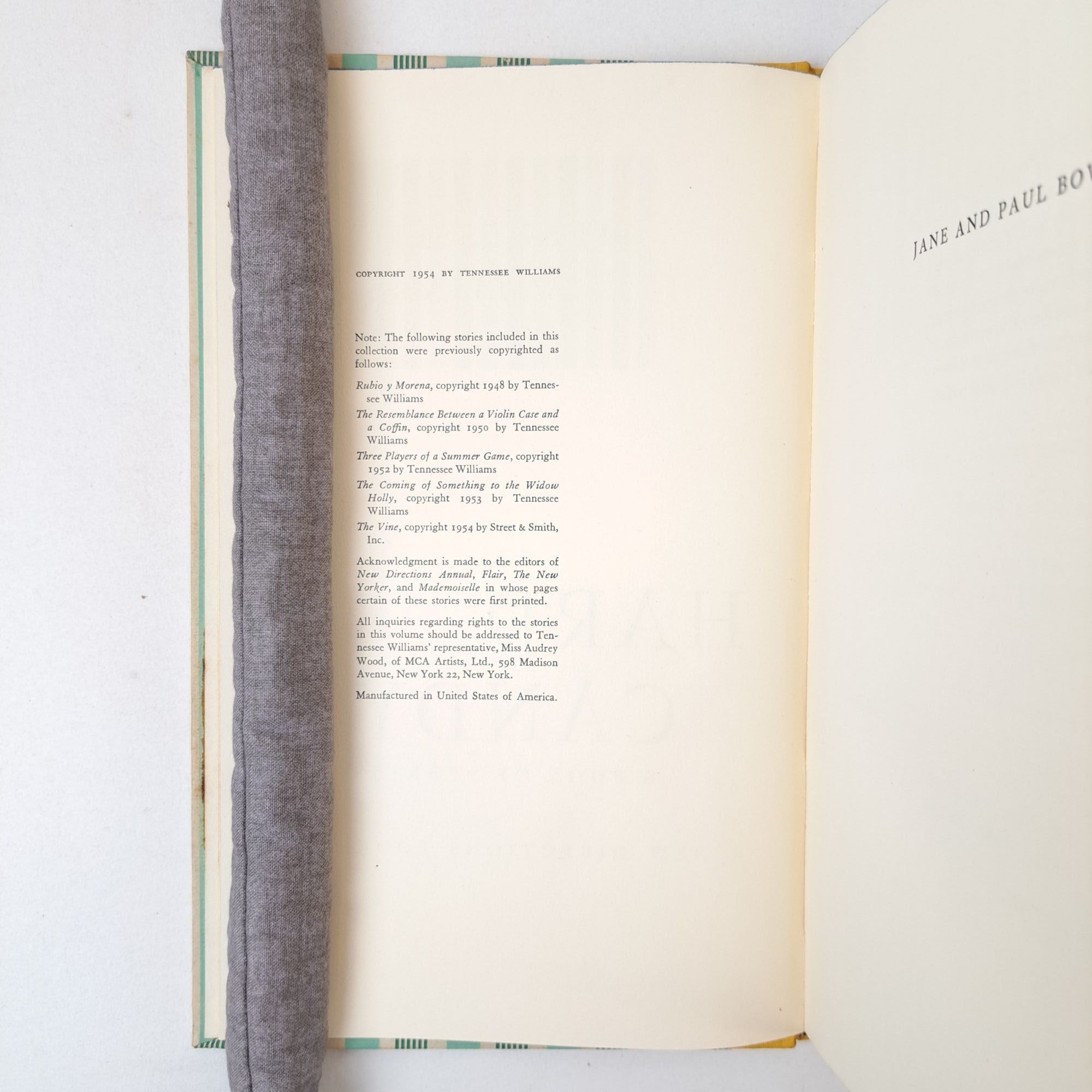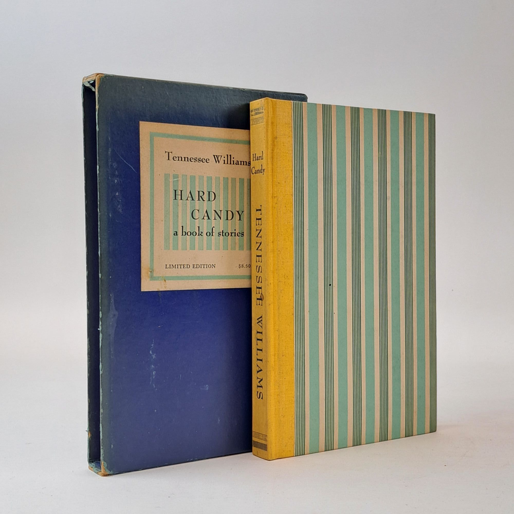 New York, New York: New Directions, 1954. Limited Edition. Hardcover. Octavo, 220 pages. In Very Good minus condition with Very Good minus condition slip case. Spine is yellow with black lettering. Slip case has mild age-toning and soiling to paper label, moderate shelving wear and surface tearing along extremities, moderate discoloration along front head and open edges, and moderate general scuffing. Boards have mild general soiling and moderate speckled staining along quarter-cloth binding. Textblock head edge dyed royal blue and has mild discoloration; interior has mild staining along hinges between endpapers. Shelved Room C. This is the true first edition of HARD CANDY, predating the trade edition. 1398182. Special Collections.
