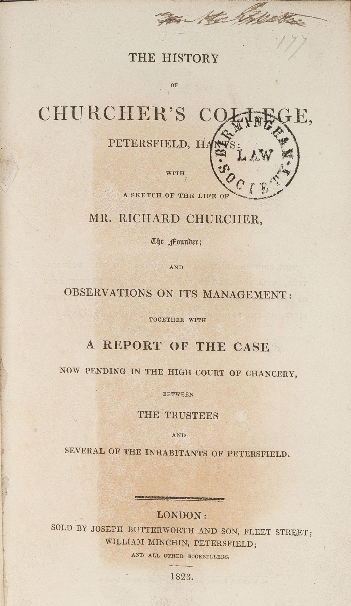 1823. London: Joseph Butterworth, 1823.. London: Joseph Butterworth, 1823. Atcheson, Nathaniel [1771-1825], Attributed. The History of Churcher's College, Petersfield, Hants: With a Sketch of the Life of Mr. Richard Churcher, The Founder; And Observations on Its Management: Together with A Report of the Case Now Pending in the High Court of Chancery, Between The Trustees and Several of the Inhabitants of Petersfield. London: Sold by Joseph Butterworth and Son, Fleet Street; William Minchin, Petersfield; and all other booksellers, 1823. viii, lx, 310 pp. Tables (1 folding). Octavo (8-1/2" x 5-1/4"). Later pebbled cloth, gilt institutional name and seal to boards, gilt title to spine, endpapers renewed. Moderate rubbing and light shelfwear to extremities, front joint starting, chipping to head of spine, spine ends and corners bumped and lightly worn, library bookplate and small shelf label to front pastedown, annotation attributing the work to "N. Atcheson" to verso of front free endpaper. Light toning to interior, ink library stamps to title page and several other leaves, crack in text block between pp. 280-281, all leaves secure. Struck-through presentation inscription "From the Editor" to head of title page. $125. * Churcher's College was founded in 1722 to educate and train local boys for service in the East India Company. The school still operates as a private co-educational day school today.