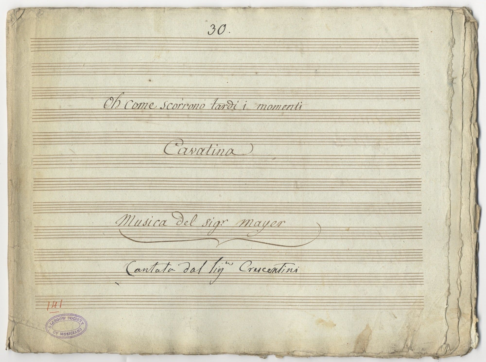 With small oval handstamp of the Glasgow Society of Musicians and "141" in contemporary manuscript to lower inner corner of title; "30" in contemporary manuscript to upper center of title.