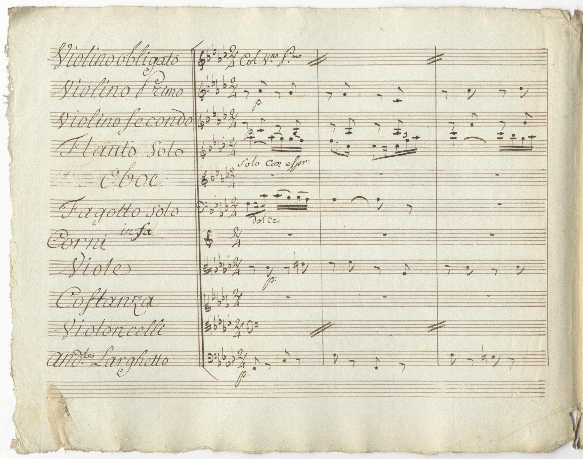Scored for soprano accompanied by obbligato violin, first and second violins, solo flute, oboes, solo bassoon, horns, violas, and cellos.