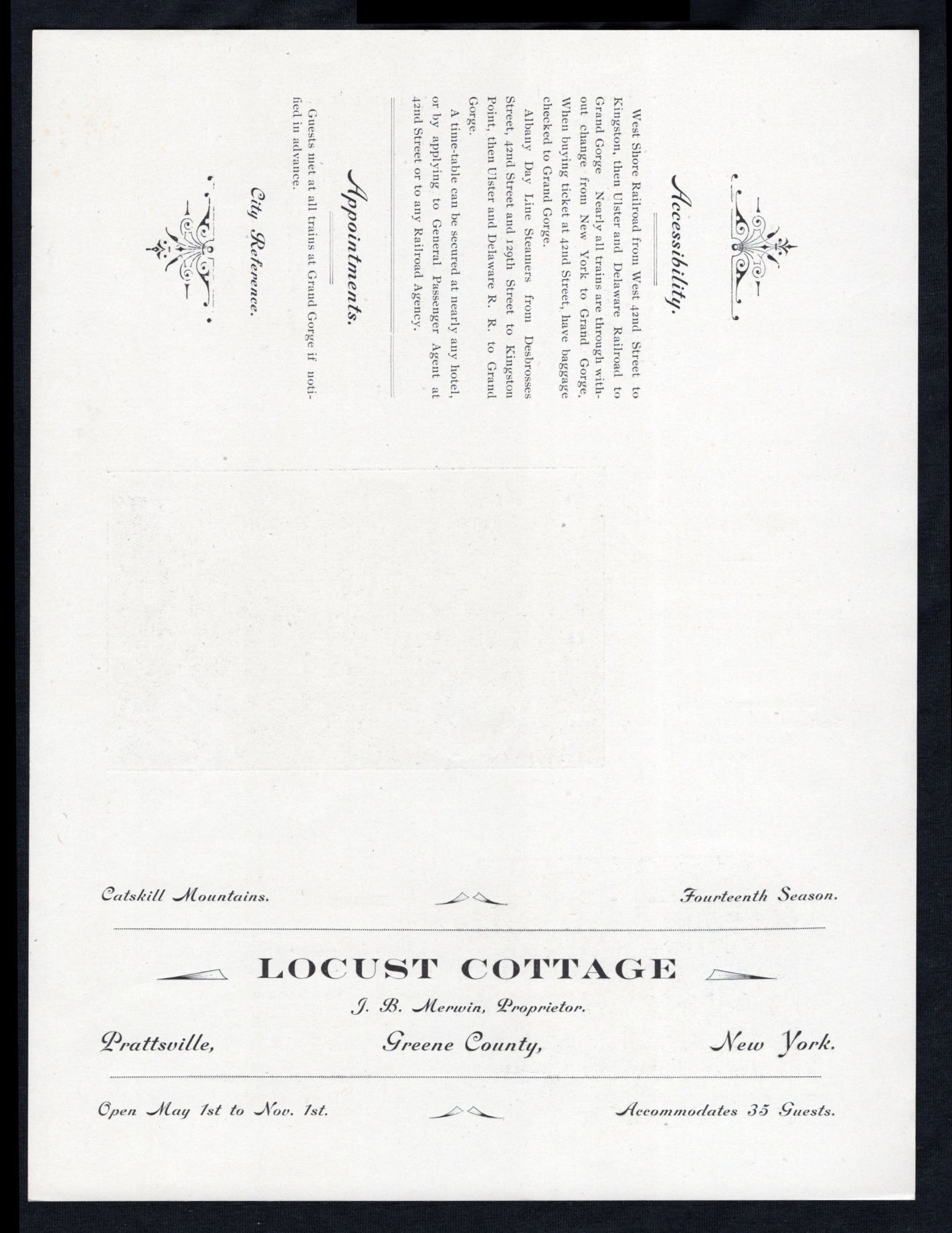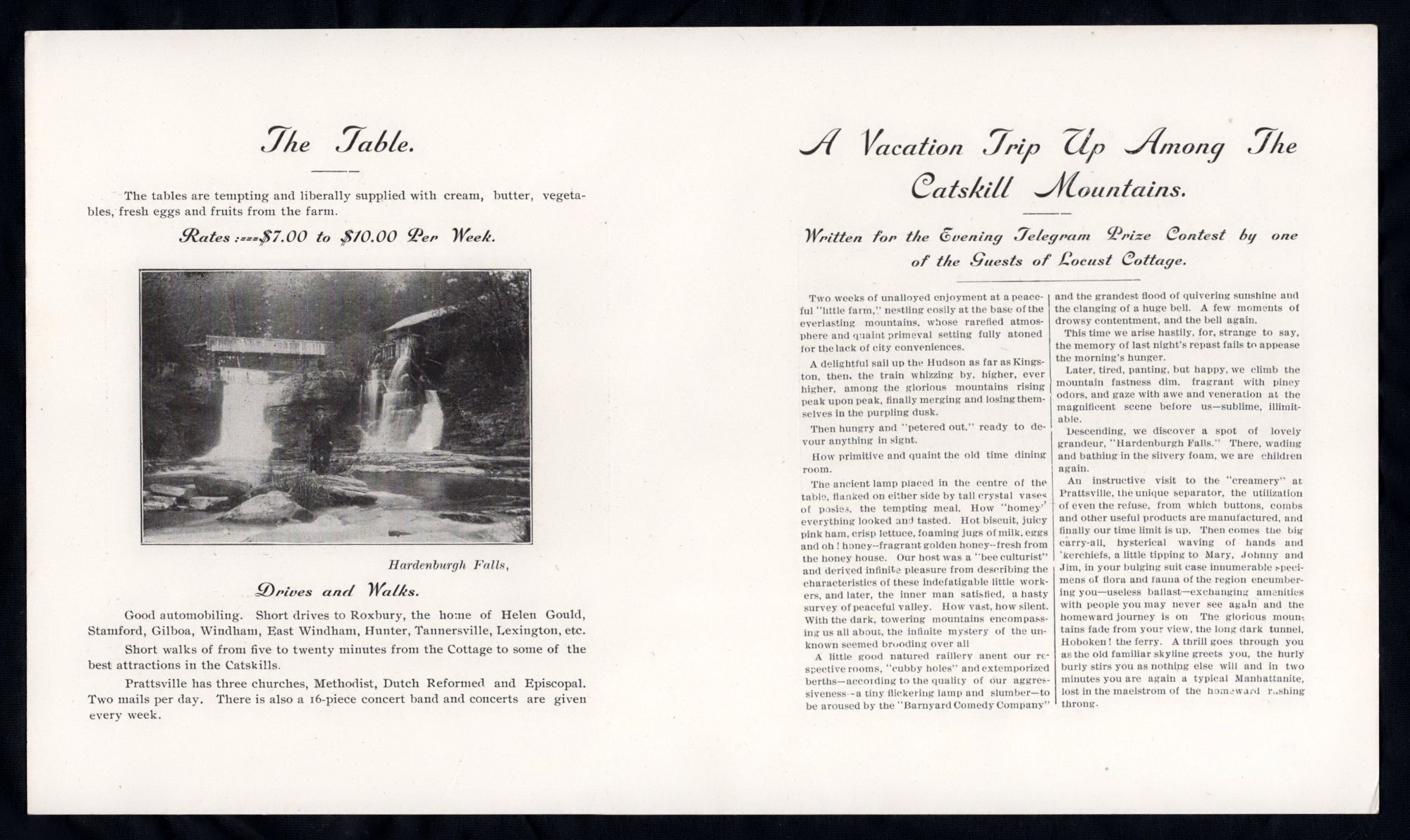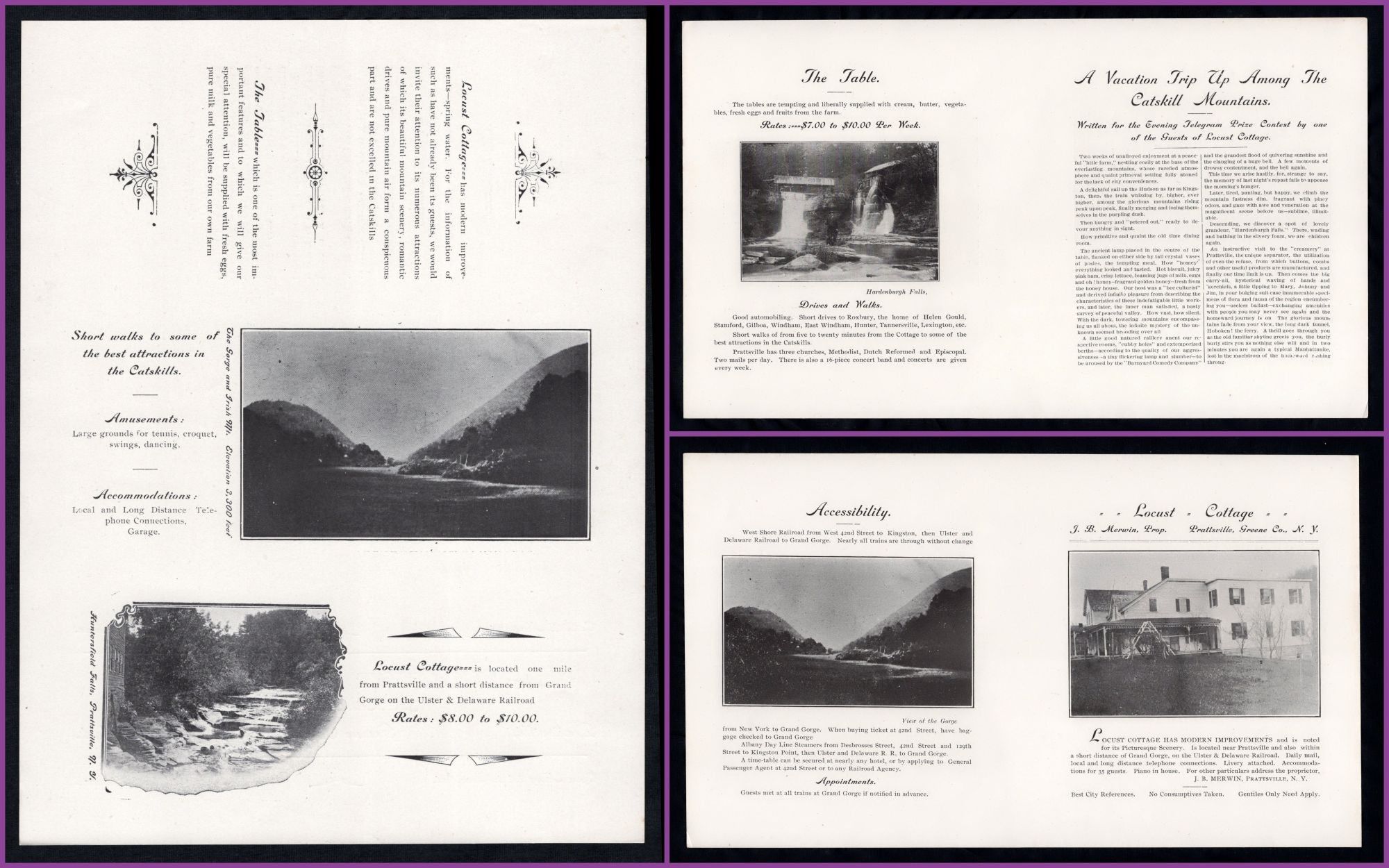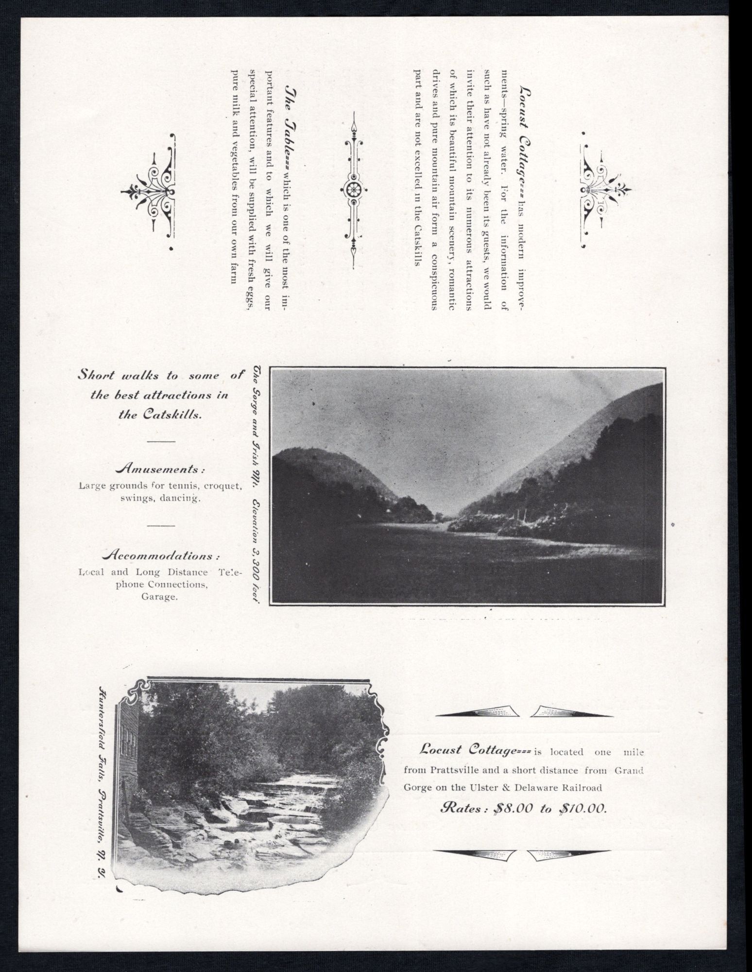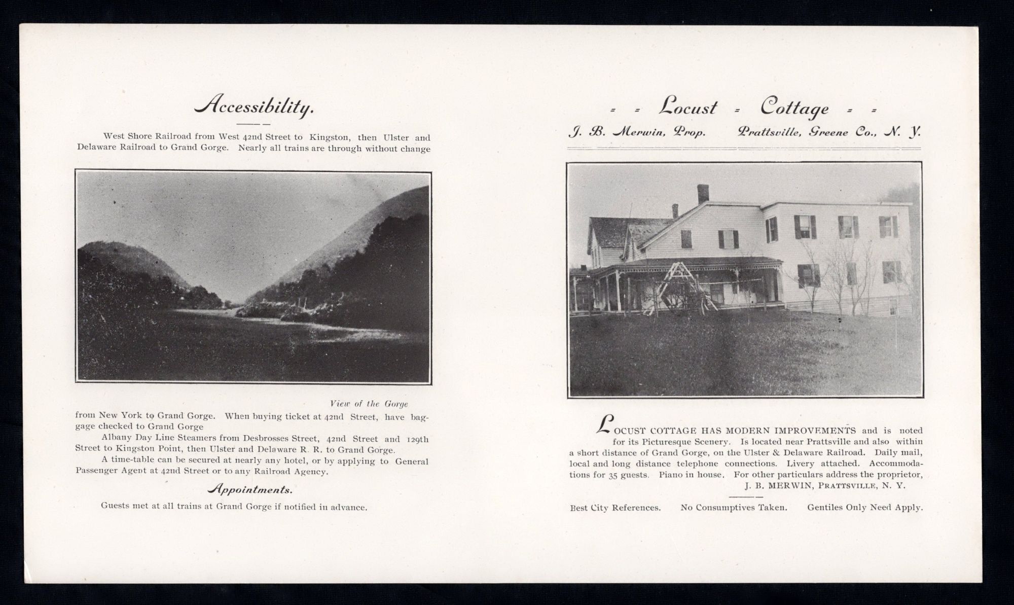 Prattsville, NY: Locust Cottage, 1920. General wear.. Two unfolded brochures for Locust Cottage under the proprietor J. B. Merwin. The cottage was a small resort located in Prattsville, NY within the Catskill Mountains that was for "Gentiles Only". The two brochures describe an idyllic setting with "beautiful mountain scenery, romantic drives and pure mountain air" with "large grounds for tennis, croquet, swings and dancing," as well as "telephone connects, [and] garage". Only one of the brochures specifically note "Gentiles Only", as well as "no consumptives". Between the two brochures there are five (5) black and white printed photographs (of which one is a duplicate), that depict the cottage and local scenery. As for dating, it appears, based on the earliest newspaper ads found, that Locust Cottage was established in or around 1906, and since according to one of the brochures this was for the 14th season, which would put that item around 1920. Newspaper ads also note that around 1915, the cottage underwent some renovations, bring the total amount of guests it was able to accommodate from 25 to 35 people and a garage was added, so the remaining brochure cannot be from prior to that. Additionally, the two brochures are most likely from different seasons, since the rates alter between the two. Both brochures are unfolded: one was supposed to fold into a tri-fold brochure, with the only supposed to be a single fold brochure. Single page, double sided (both). Measures 12" x 17 (unfolded) and 10 1/2" x 8" (unfolded).