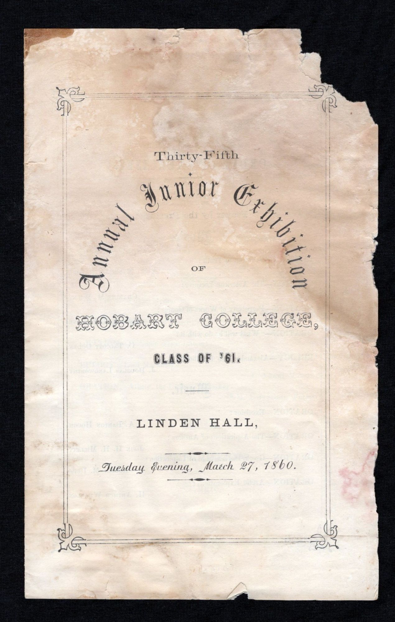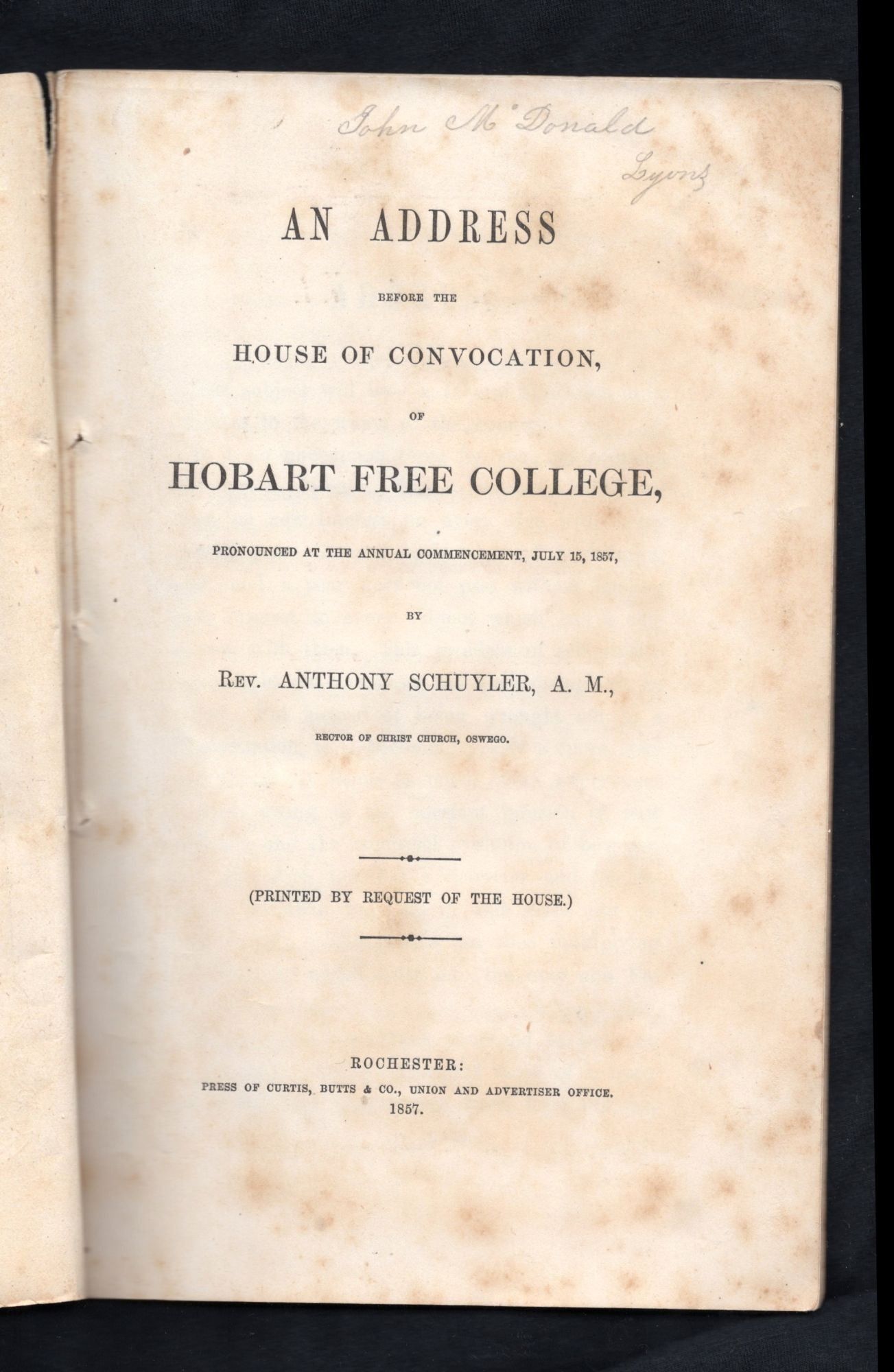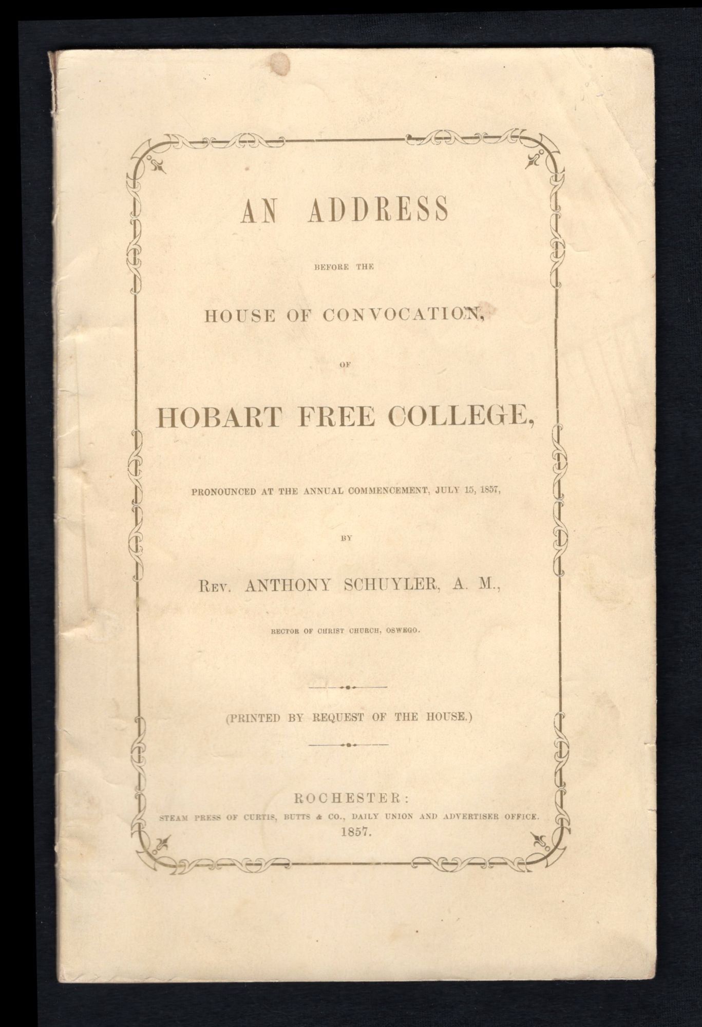 Rochester, NY & Granville, OH: Steam Press of Curtis, Butts & Co, 1862. Overall, generally wear. Both programs have moderate toning, and edge. In particular the Hobart's Junior Exhibition, has damage and tears along the top and right edge (see pictures). Inscribed.. The trio of items dating from 1857-1862 relates to two different colleges, Hobart Free College (now known as Hobart and William Smith Colleges) in Geneva, NY and Denison University in Granville, OH. The first item is entitled: "An Address Before the House of Convocation of Hobart Free College, Pronounced at the Annual Commencement, July 15, 1857, by Rev. Anthony Schuyler, A. M., Rector of Christ Church, Oswego", and contains the full transcript of the address which was on the subject of a Liberal Education and its relations to the "wants of the country". The address relates the current challenges in the country, how that relates to the scholar, and the wish for a "popular education system". The address ends with the conclusion that "such are the influences into the midst of which the scholar is to go forth. It is easy for him to perceive the he lives not to seize the richest trophies, nor to receive the loudest plaudits of his time. But he lives to utter a truth." Note: Publishers is located in Rochester, NY. 29 pgs. Printed wrappers. String binding. OCLC 18 (Dec. 2020). Measures 8 3/4" x 5 3/4". The second item is a program for the 35th Annual Junior Exhibition at Hobart College on March 27, 1860, featuring the class of 1861. The exhibition featured a series of orations with breaks for music. Some of the titles of the speeches are: "Perpetuity of Works of Genius", "The Aspirations of Authors", "Arctic Explorations", and "American Scenery". Each page features a simple, decorative border. Single fold, double sided. OCLC 0 (Dec. 2020). Measures 8 1/2" x 5 1/4" (folded), 10 1/2" x 8 1/2" (unfolded). The last item is a program for the "Exhibition of the Franklin Literary Society of Denison University" on February 28, 1862. The program has seven different presentation, including an open salutation (in Greek), orations, poetry readings, and a discussion on whether or not "a man is justifiable in obeying a law which he believes to be unjust". The program has a decorative filigree border. Single fold program. OCLC 0 (Dec. 2020). Measures 6 3/4" x 4 1/4" (folded), 8 1/2" x 6 3/4" (unfolded). Hobart Free College [for Men] is located in Geneva, NY, that was started in 1822, though there were several attempts in earlier years to start the school that did not succeed. Originally the school was called Geneva College, but was renamed in 1852 in honor of its founder Bishop John Henry Hobart (1775-1830). In 1908, under Hobart Free College, William Smith College for Women was founded, and in 1943 the college was recognized as an independent college, coequal with Hobart. Today, the colleges are separate but do share resources and often are referred to as one, known as the Hobart and Smith Colleges.