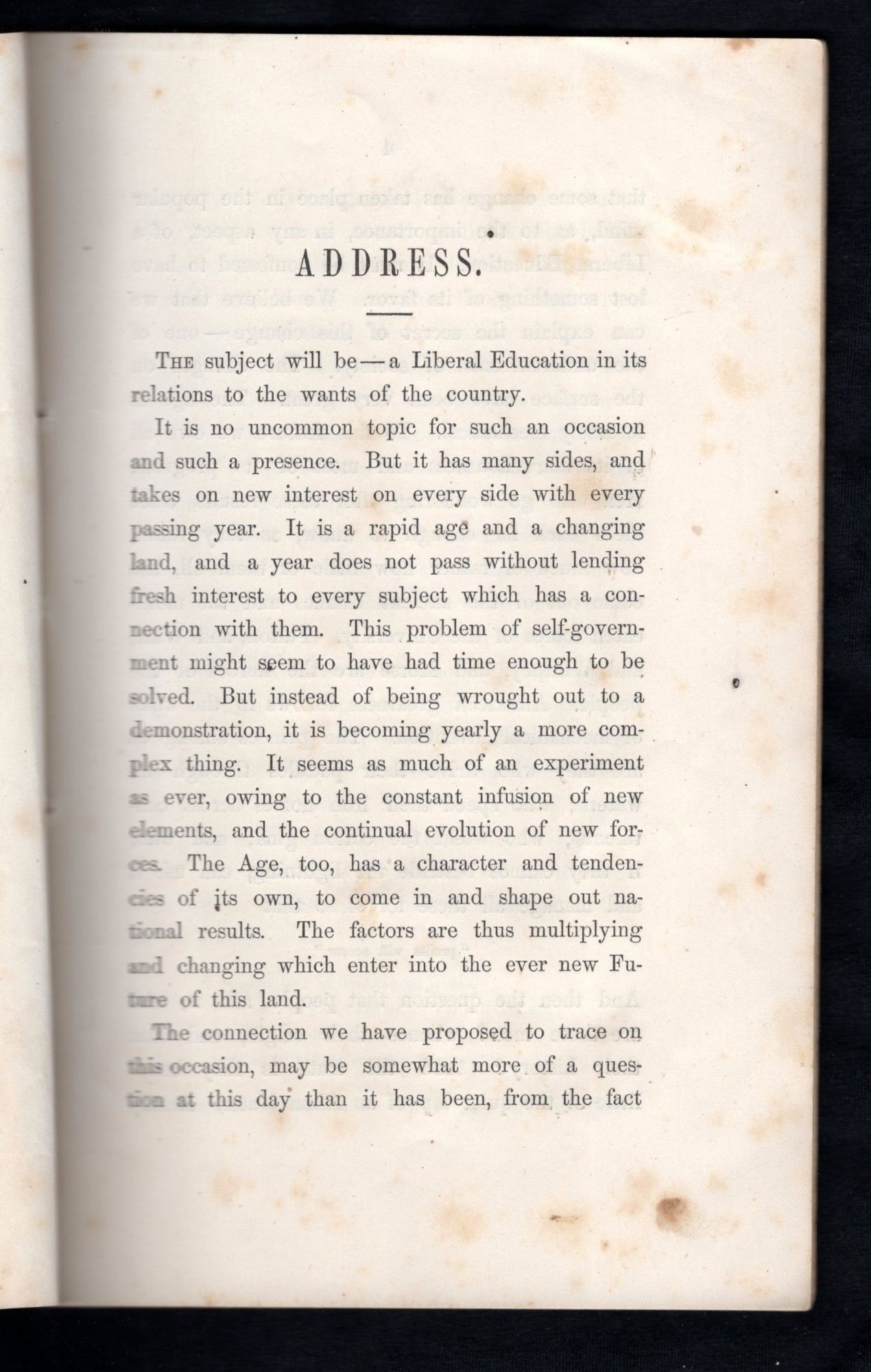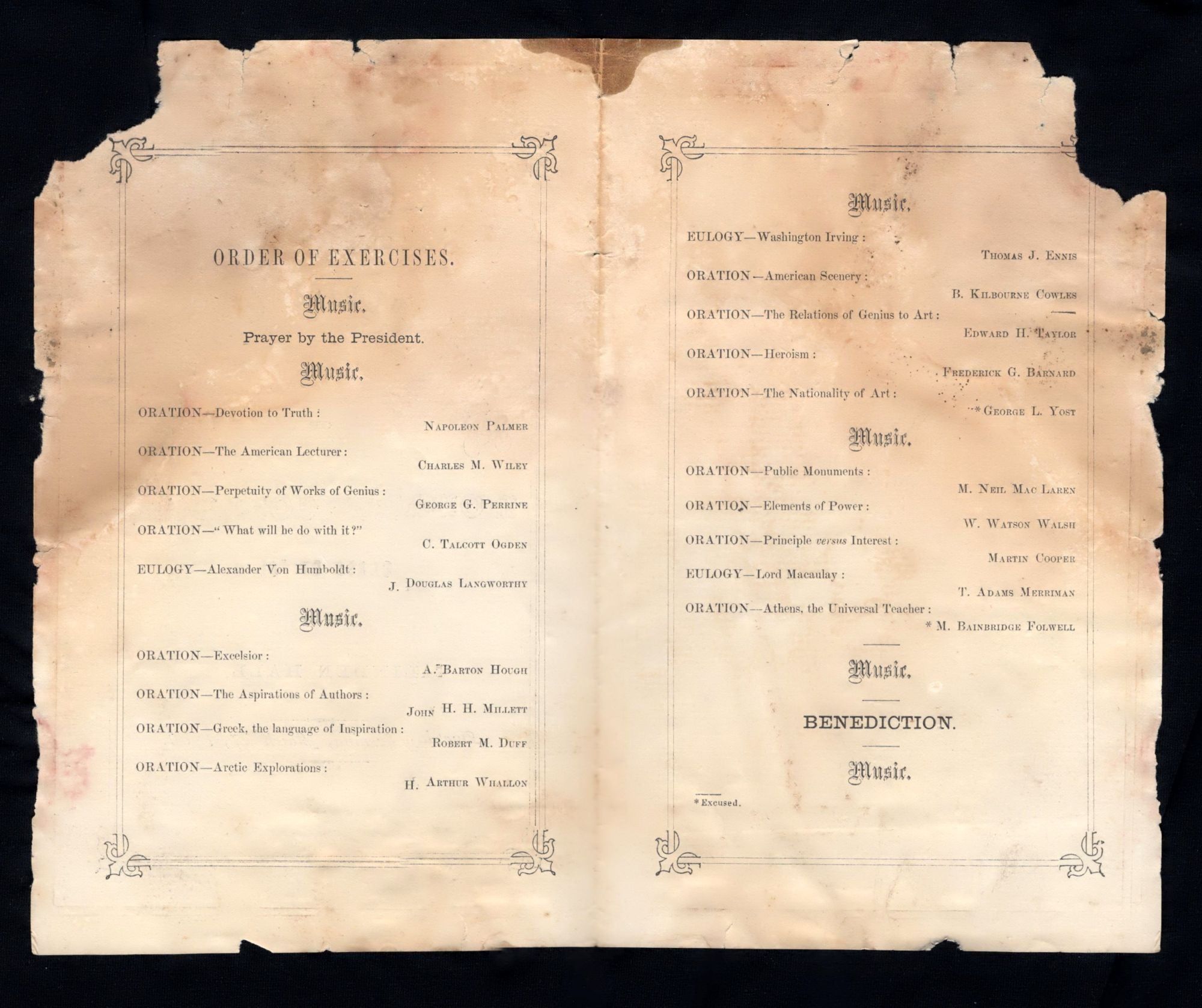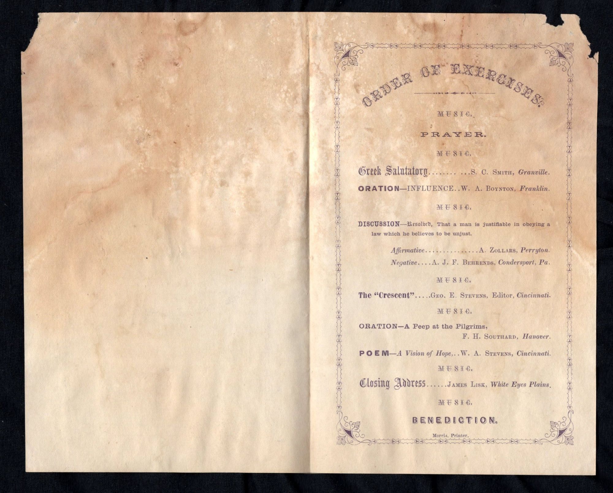 Rochester, NY & Granville, OH: Steam Press of Curtis, Butts & Co, 1862. Overall, generally wear. Both programs have moderate toning, and edge. In particular the Hobart's Junior Exhibition, has damage and tears along the top and right edge (see pictures). Inscribed.. The trio of items dating from 1857-1862 relates to two different colleges, Hobart Free College (now known as Hobart and William Smith Colleges) in Geneva, NY and Denison University in Granville, OH. The first item is entitled: "An Address Before the House of Convocation of Hobart Free College, Pronounced at the Annual Commencement, July 15, 1857, by Rev. Anthony Schuyler, A. M., Rector of Christ Church, Oswego", and contains the full transcript of the address which was on the subject of a Liberal Education and its relations to the "wants of the country". The address relates the current challenges in the country, how that relates to the scholar, and the wish for a "popular education system". The address ends with the conclusion that "such are the influences into the midst of which the scholar is to go forth. It is easy for him to perceive the he lives not to seize the richest trophies, nor to receive the loudest plaudits of his time. But he lives to utter a truth." Note: Publishers is located in Rochester, NY. 29 pgs. Printed wrappers. String binding. OCLC 18 (Dec. 2020). Measures 8 3/4" x 5 3/4". The second item is a program for the 35th Annual Junior Exhibition at Hobart College on March 27, 1860, featuring the class of 1861. The exhibition featured a series of orations with breaks for music. Some of the titles of the speeches are: "Perpetuity of Works of Genius", "The Aspirations of Authors", "Arctic Explorations", and "American Scenery". Each page features a simple, decorative border. Single fold, double sided. OCLC 0 (Dec. 2020). Measures 8 1/2" x 5 1/4" (folded), 10 1/2" x 8 1/2" (unfolded). The last item is a program for the "Exhibition of the Franklin Literary Society of Denison University" on February 28, 1862. The program has seven different presentation, including an open salutation (in Greek), orations, poetry readings, and a discussion on whether or not "a man is justifiable in obeying a law which he believes to be unjust". The program has a decorative filigree border. Single fold program. OCLC 0 (Dec. 2020). Measures 6 3/4" x 4 1/4" (folded), 8 1/2" x 6 3/4" (unfolded). Hobart Free College [for Men] is located in Geneva, NY, that was started in 1822, though there were several attempts in earlier years to start the school that did not succeed. Originally the school was called Geneva College, but was renamed in 1852 in honor of its founder Bishop John Henry Hobart (1775-1830). In 1908, under Hobart Free College, William Smith College for Women was founded, and in 1943 the college was recognized as an independent college, coequal with Hobart. Today, the colleges are separate but do share resources and often are referred to as one, known as the Hobart and Smith Colleges.