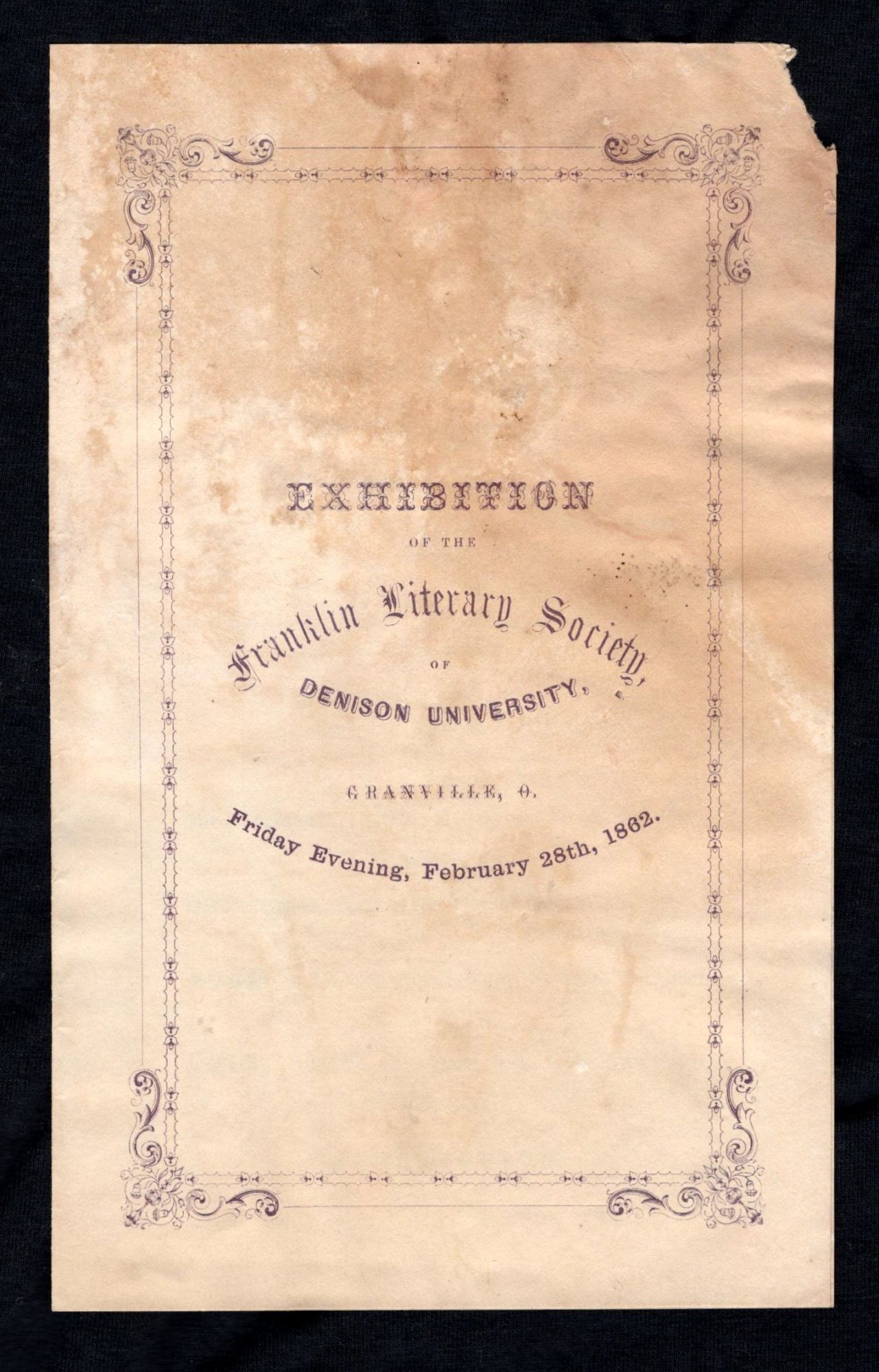 Denison University is a private liberal arts college located in Granville, OH, which was founded in 1831 by Baptists who had settle in the area. In its early years it was known by several names, such as the Granville Literary and Theological Institution and Granville College. It was renamed in the 1850s, after one of its more key donors, William S. Denison. Granville Female Seminary (also known as Shepardson College for Women), which was started in 1832, was incorporated into Denison University in 1900. The university is still in existence today. The Franklin Literary Society was chartered at Denison in 1843, and eventually would merge with another literary (Calliopean Literary Society), to be known as the Franco-Calliopean Literary Society. At some point in the early 1900s, the society was disbanded.