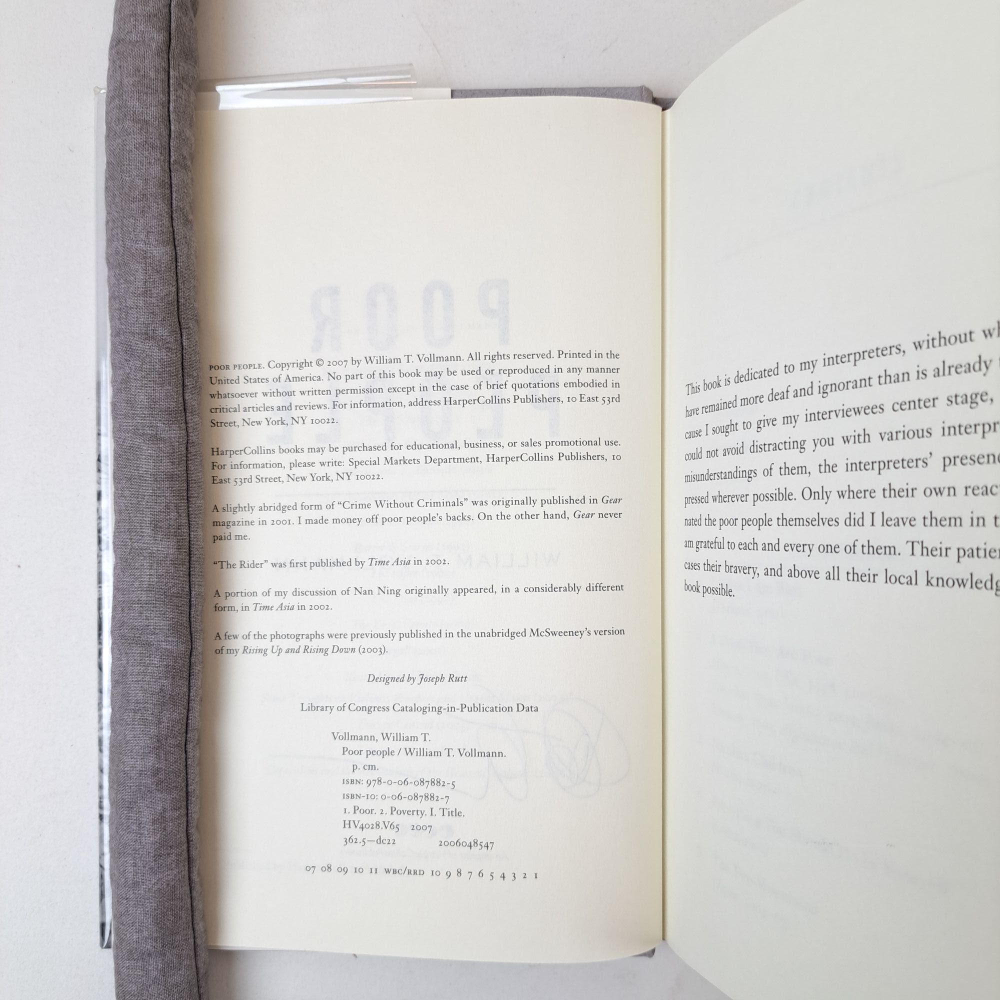 New York, New York: Ecco, 2007. First Edition, First Printing. Hardcover. Octavo, 127 pages. In Very Good condition with Very Good condition dust jacket. Spine is gray with olive green and dark red lettering. Dust jacket protected by mylar covering, price uncut: "$29.95" on front flap. Boards have mild shelving wear and creasing along spine tail and to front tail joints. Textblock head and fore edges have mild foxing. Signed flat on title page by William T. Vollman. 1398252. Special Collections.