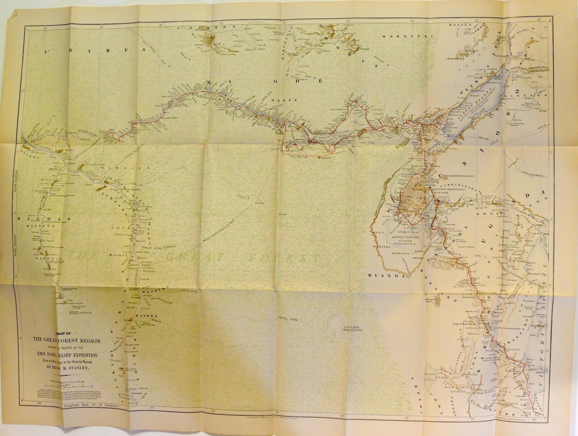 New York: Charles Scribner’s Sons, 1890. First American Edition. Hard Cover. Very Good binding. Large 8vo’s; in the publisher’s decorative green cloth binding; with titling on the upper board and spine in gilt; the bindings have modest wear. Volume I has a trivial stain to the lower board. A previous owner name on the first blank pager of Volume I; Volume 2 there is a trivial spot of loss to the spine; three maps in the rear of the set.~~Stanley’s account of one of the last of the 19th century expeditions by Europeans into the interior of the African continent. A presentable copy of the First American edition. Complete with all illustrations and maps including the two large folding maps, the Map of the Route of the Emin Pasha Relief Expedition through Africa; and the Map of the Routes of the Emin Pasha Relief Expedition from the River Congo to the Victoria Nyanza. The maps have some separation at the folds. ~. Very Good binding.