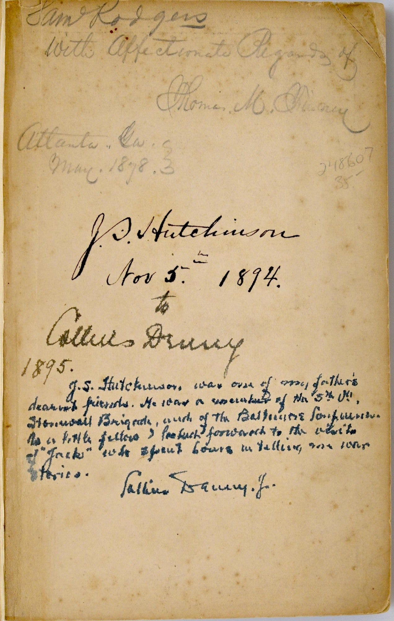 New York: Nelson & Phillips, 1876. First Edition. Hard Cover. Very Good binding. 8vo.; in brown flexible cloth boards titled in gold to the upper board; 87 pages; rebacked with new brown japanese tissue.~~This copy with the signature of J. S. Hutchinson, dated November 5th, 1874, and a later gift inscription to “Collins Denny, 1895.” Collins Denny was a Bishop in the Methodist Episcopal Church South. His son, Collins Denny, Jr. added a note (in part erroneous): “J. S. Hutchinson was one of my father’s dearest friends. He was a member of the 5th Virginia Stonewall Brigade”. In fact, while Hutchinson served under Stonewall it was not in Stonewall Brigade, but rather in the 10th Virginia. He was wounded at the First Battle of Winchester, and then captured at the Bloody Angle at Spotsylvania.~~There is also a prior insciption from Thomas M. Finney to Sam Rodgers, dated Atlanta, Ga. May 1878. This is undoubtedly the Thomas Finney who penned “The Life and Labors of Enoch Mather Marvin, Late Bishop of the Methodist Episcopal Church, South”. ~~An uncommon piece of Methodist history, with intriguing provenance. Very Good binding.