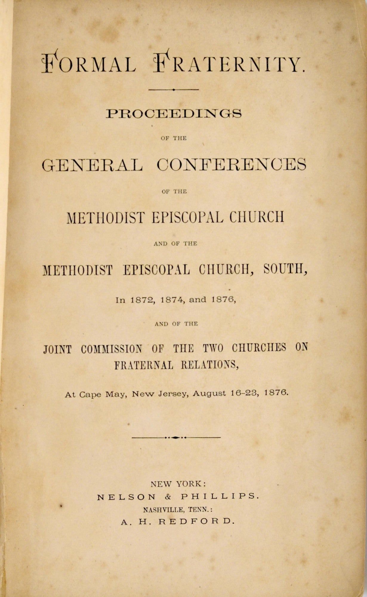 [RELIGION] [10th VIRGINIA] FORMAL FRATERNITY. PROCEEDINGS OF THE GENERAL CONFERENCES OF THE METHODIST EPISCOPAL CHURCH AND OF THE METHODIST EPISCOPAL CHURCH SOUTH, IN 1872, 1874, AND 1876 AND OF THE JOINT COMMISSION OF THE TWO CHURCHES ON FRATERNAL RELATIONS, AT CAPE MAY, NEW JERSEY, AUGUST 16-23. 1876