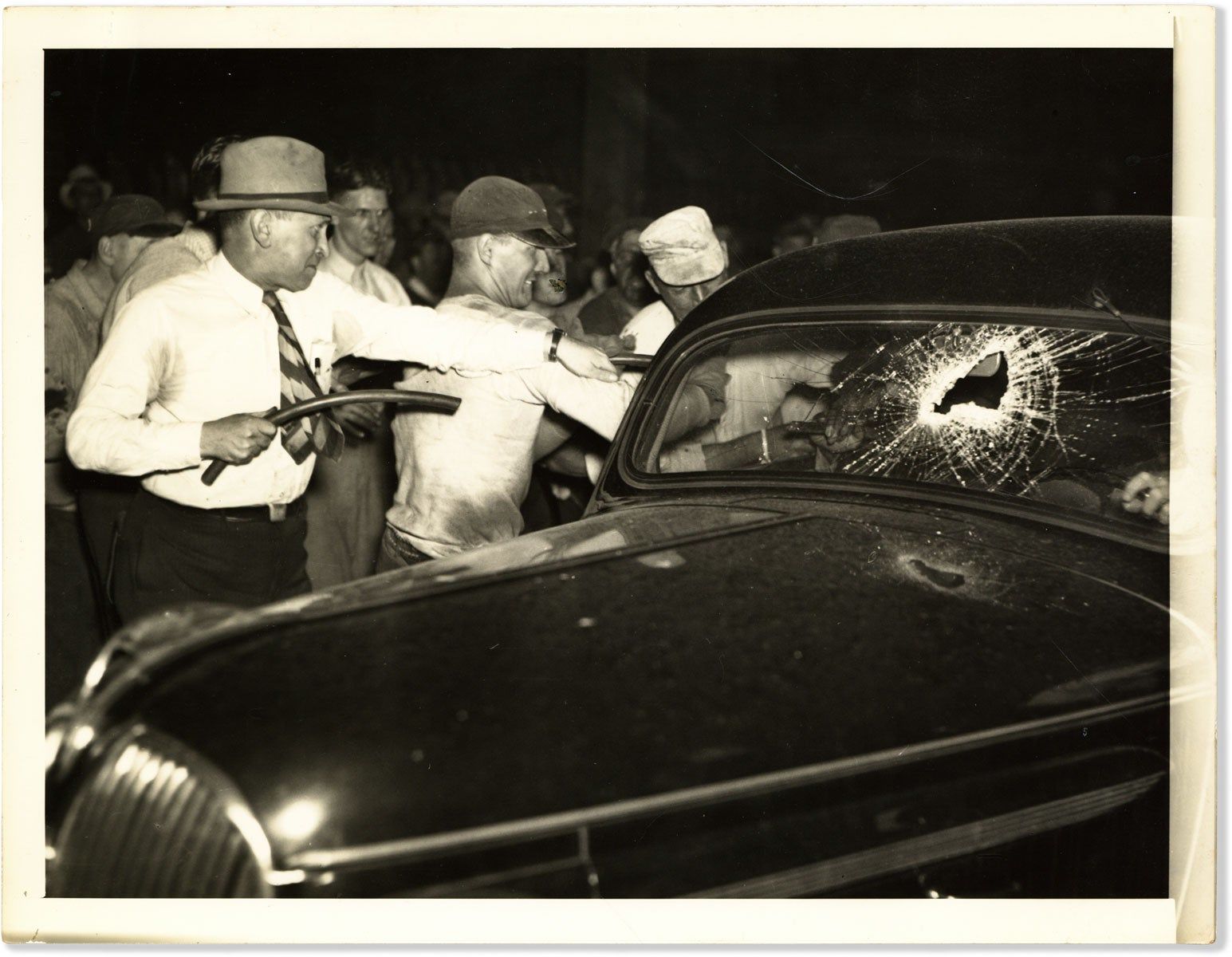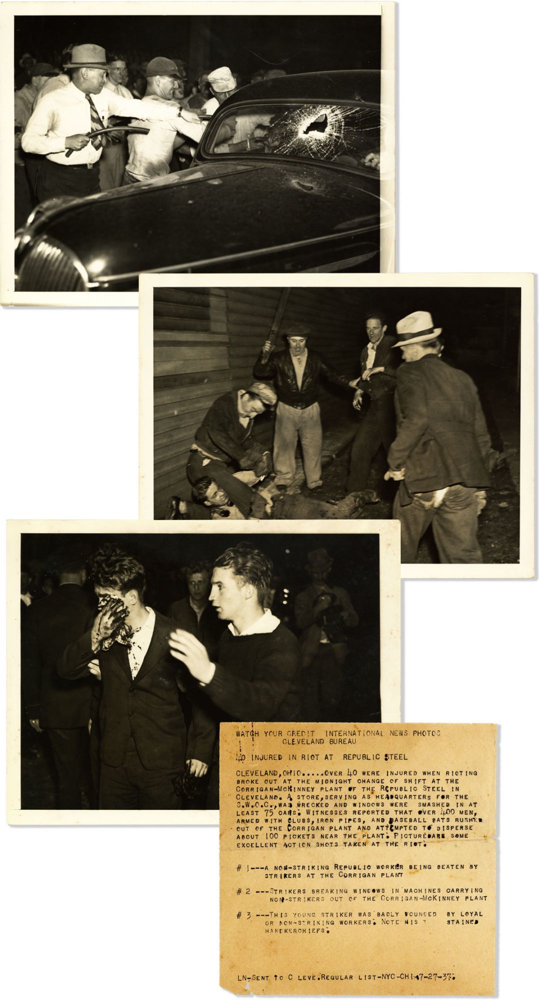 Three images from the violent clashes between Congress of Industrial Organizations union men striking for better working conditions at the "Little Steel" mills in Cleveland, and the carloads of scab workers driven in by the management to break the strike. The violence accelerated to such a level, as these images testify, that the Governor of Ohio, Martin Davey, felt the need to bring in the National Guard.