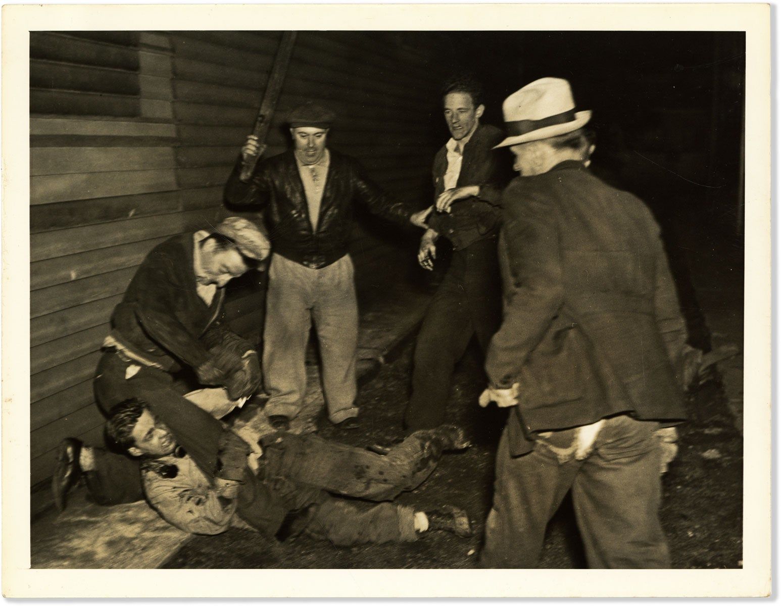 The actual facts of the violent clashes of the night of the 26th of July 1937 hinge around the fact that Republic Steel, facing months of lost revenue at Corrigan-McKinney and their other plants, built a small private army of "paramilitaries" undeterred from the backlash of the previous month's "Women's Day Massacre" where Cleveland cops had fired live ammunition into a group of strikers, killing one and injuring several others. The rented strikebreakers, armed with weapons manufactured using the mill equipment, stormed out of the factory buildings and laid into the strikers with no regard for life or limb. Eighty strikers were seriously injured, once the police arrived upwards of a dozen known union men were arrested, and the man in charge of city security in Cleveland, the fabled Elliot Ness, issued a series of empty ultimatums to the "agitators" that, if they didn't lead to the abandonment of his political ambitions, certainly contributed to his disillusionment. In a climate where people were becoming increasingly aware that their political leaders could all be bought and paid for, the brutal stamping the union men took starting looking more like abuse of power than quelling a riot. These images are certainly indicative of the brutality and violence, but how and with what purpose they would be presented to their audience is really the question.