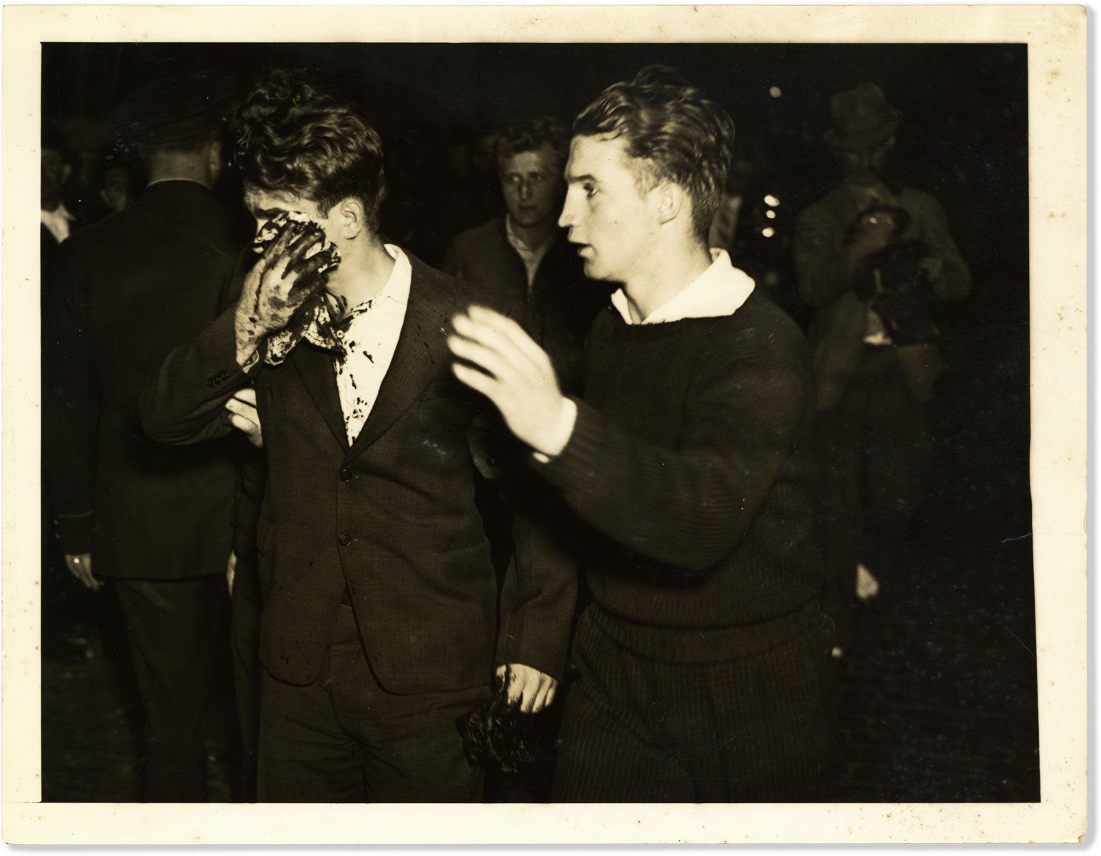 Image #1 depicts a bleeding man, with what look to be welding goggles around his neck, struggling on the ground being beaten by 4 others, one of whom is wielding a two by four; #2 has a group of clearly enraged men armed with lead pipes, destroying the windshield of a car that is clearly occupied; #3, the final image of the triptych shows a young man in a dark suit bleeding heavily from the face and being escorted away by a clearly concerned comrade.