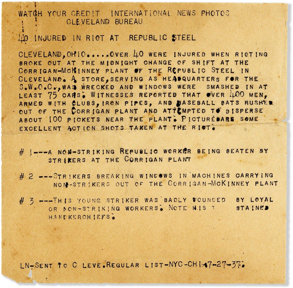 40 Injured in Riot at Republic Steel" Three International News Photo Images of 1937 Cleveland Steel Strike Violence