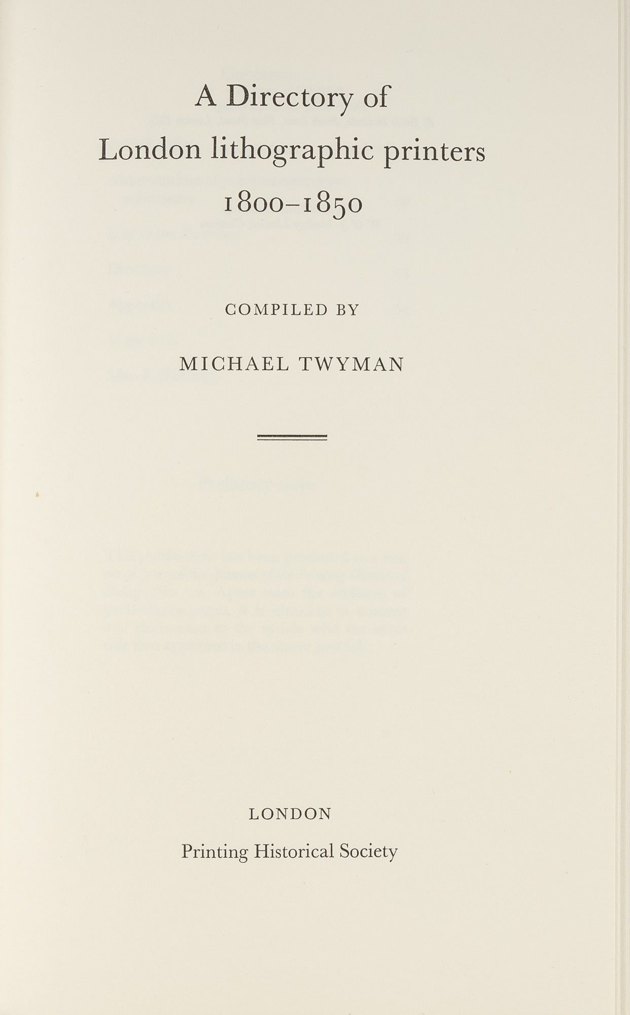1976. Twyman, Michael. A Directory of London Lithographic Printers, 1800-1850. London: Printing Historical Society, [1976]. 55 pp. Illustrations. Blue clothbound hardcover with gilt stamped spine. Fine. Internally clean. $15. * The book chronicles the early and mid-19th-century boom of lithography in London, a period when the printing technique was developing rapidly following its invention around 1796.