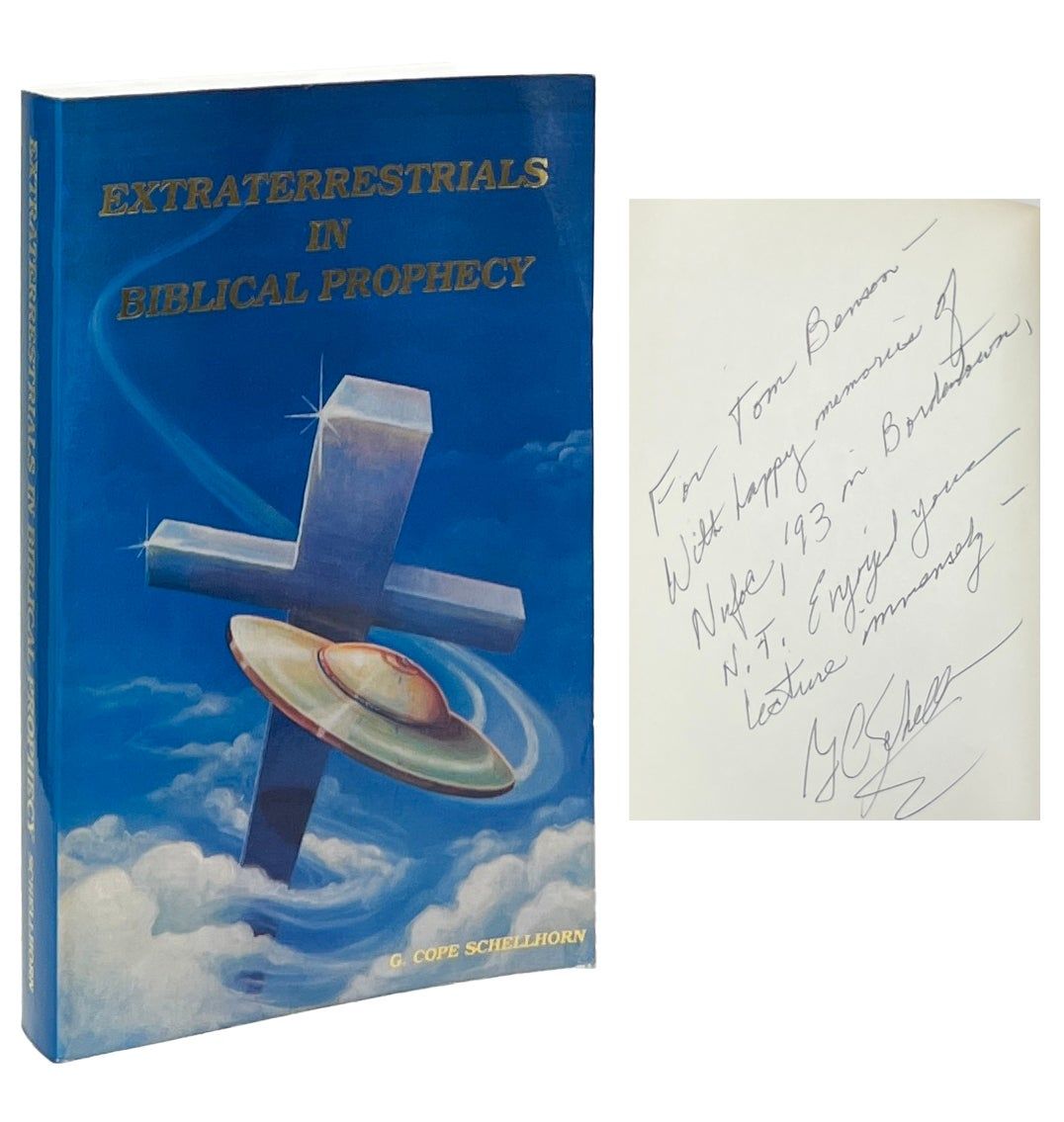 Madison: Horus House Press, Inc, 1990. First Edition. Paperback. Very Good. Inscribed inside the front cover by Schellhorn to ufologist Tom Benson. Very Good. Wraps bumped at the edges, curled at the fore-edge. Square and firmly bound, a few stains at the edges, three pages uncut, clean otherwise. Schellhorn's work in the ancient aliens vein that "suggests extraterrestrial visitors have long been occupied with visiting our planet, biologically engineering the development of man and directing certain control cultures such as the early Hebrews." From the collection of ufologist Tom Benson.