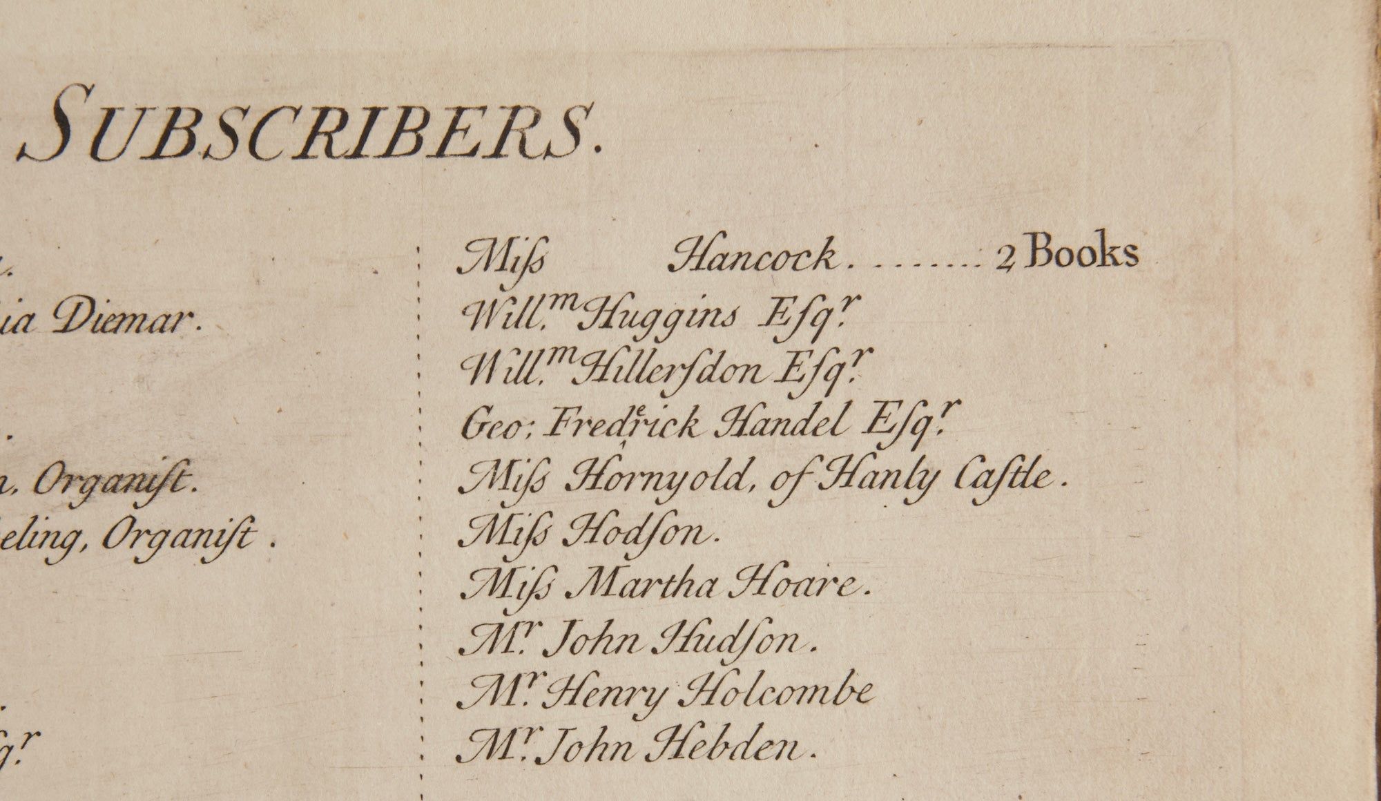 Subscribers include composers Pietro Castrucci, Willem de Fesch, Maurice Greene, Geo: Frederick Handel Esqr., Chas. Jennings, John Frederick Lampe, Johann Christoph Pepusch, and Peter Prelleur.