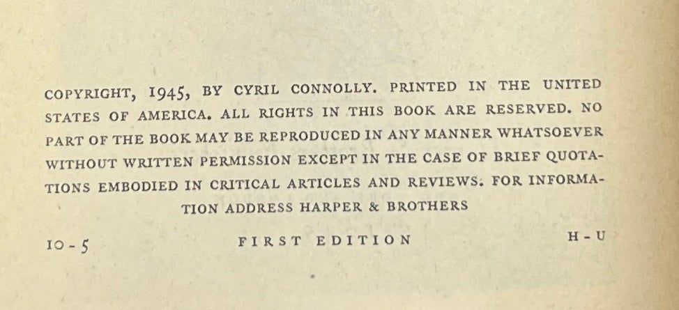 New York: Harper and Brothers, Publishers, 1945. First Edition. Hardcover. Near Fine/Good. Near Fine in a Good jacket, unclipped ($2.50), generally toned, chipped and with some closed tears and creases at the edges and folds. Black cloth, toned to match the chips of the jacket, with green ink rules and gilt lettering on the spine and front board. Square and firmly bound with a faint green topstain, clean internally. Connolly's work that contains "the doubts and reflections of a year[...]an experiment in self-dismantling.