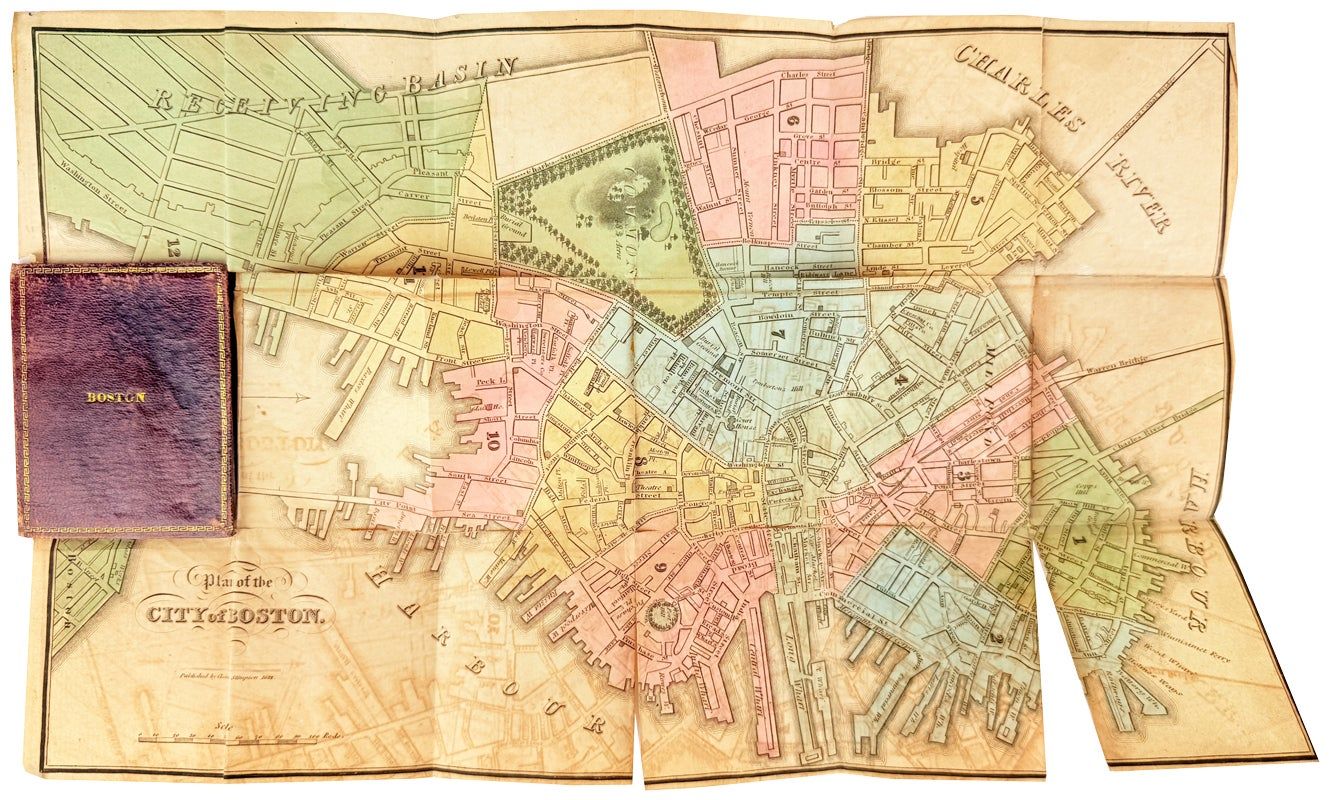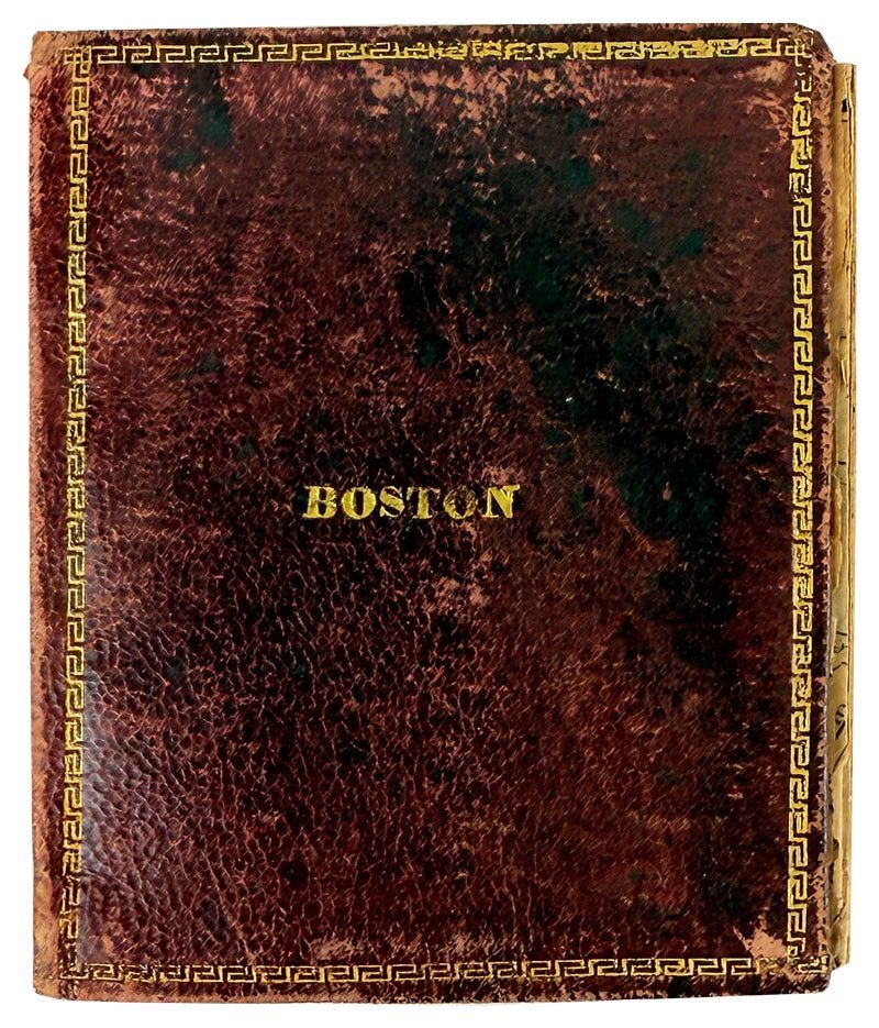 Boston: Charles Stimpson, 1832. Good +. Boston: Charles Stimpson, 1832. First Edition. Hand-colored map (22x36cm) folded down into original gilt-tooled maroon morocco binding (8x6.5cm). Map quite fragile with extensive splitting and occasional old tape repairs along verso folds though image is complete; light rubbing to leather margins, else a Good, still bright example of this scarce little map of Boston.