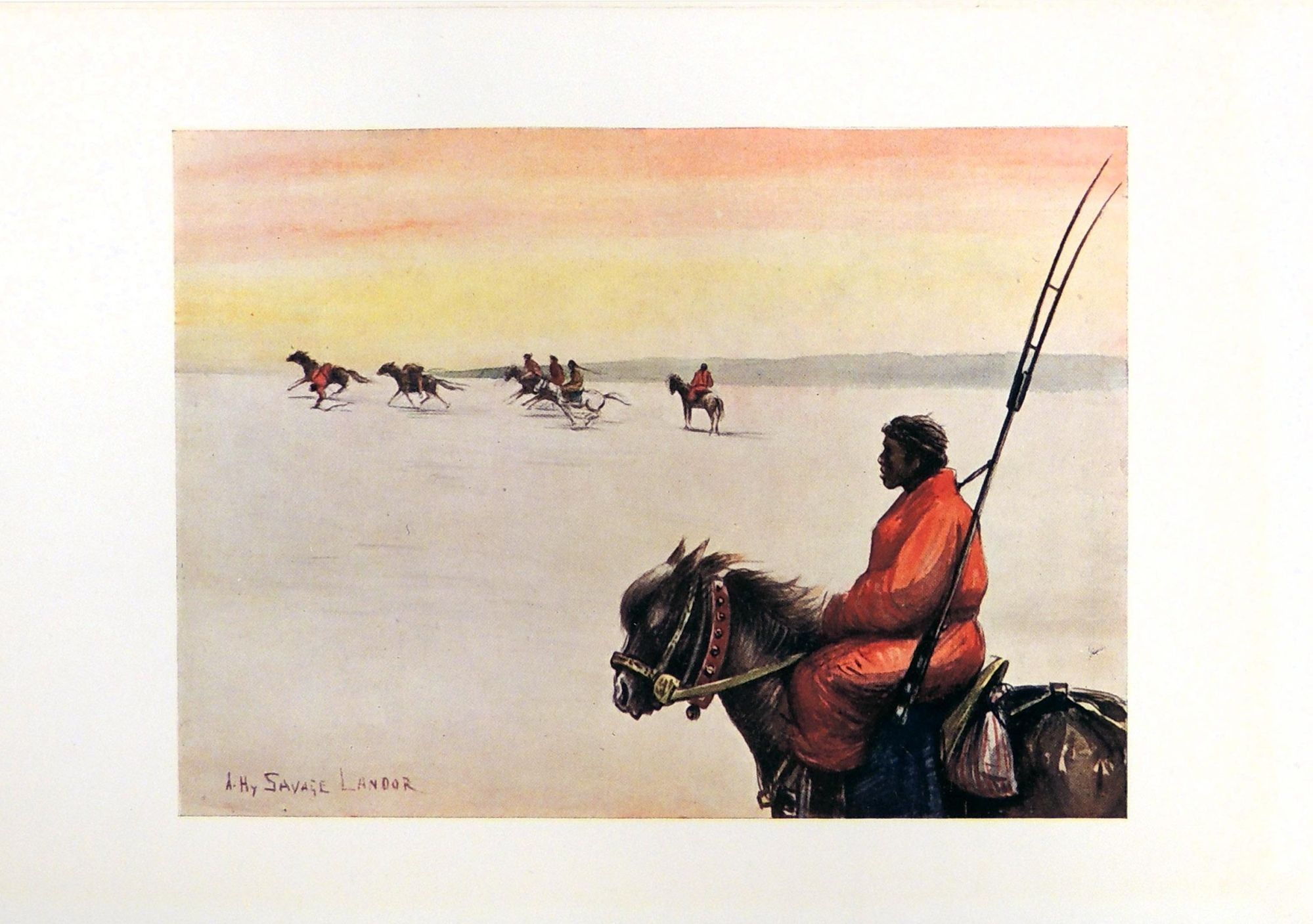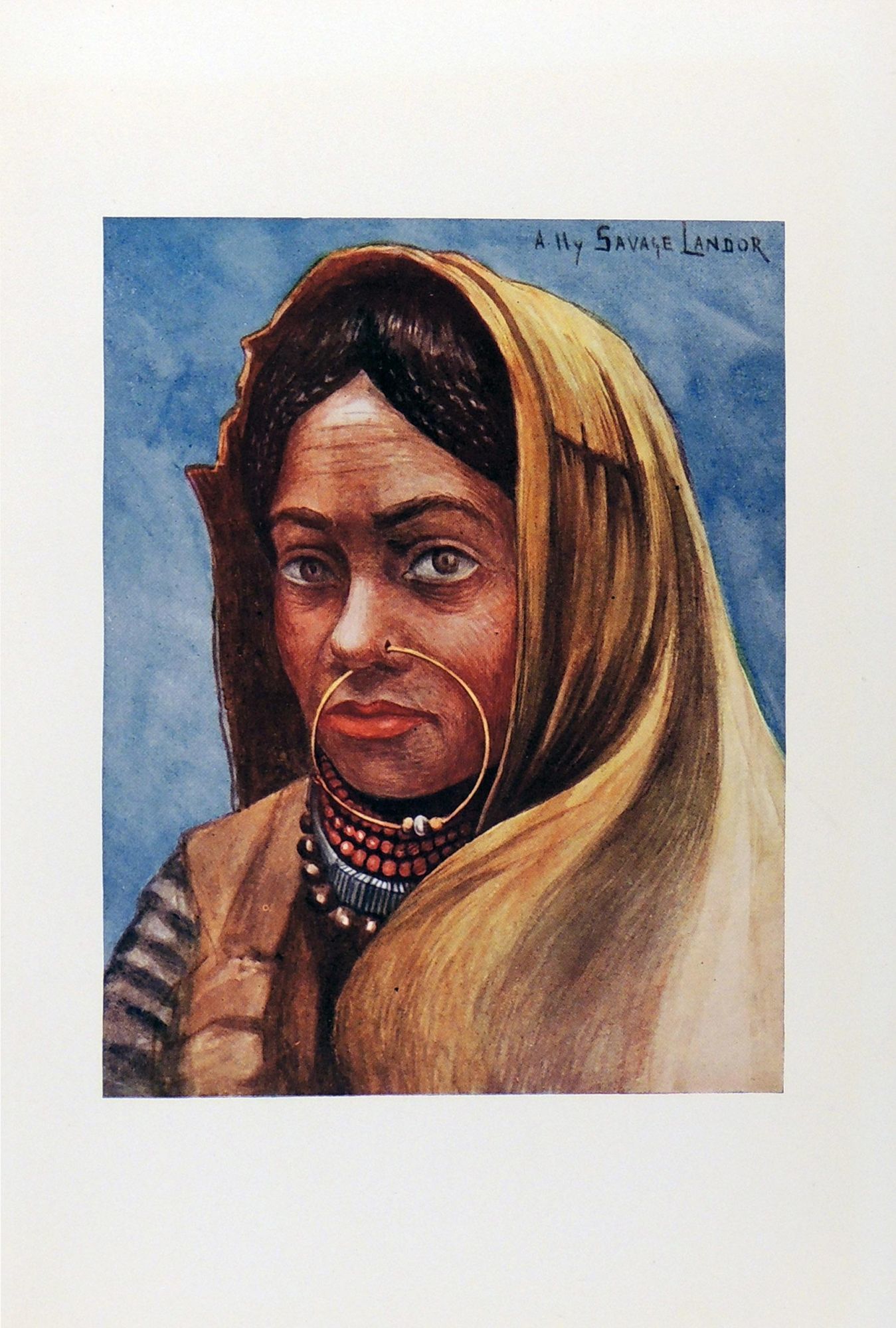 This book is emblematic of Landor's work, and includes 75 color copies of his illustrations. Bound in dark blue cloth with a black design over a gilt symbol. Binding is bumped and a bit frayed and the top and bottom edges of the spine are torn, particularly the top edge. Free endpaper is partly detached and pastedown and endpapers are faded with darkening along the edges. Ownership signature in ink on front pasatedown.Front hinge is cracked and there is a split along a few of the signatures where book was opened flat. Interior pages are generally clean and bright, and the illustrations are protected by tissue paper. Very good condition. Measures 6.25 x 9 inches. 233 pages including index, and a foldout "sketch" map of glaciers and peaks explored by Landor, protected by a torn sheet of tissue paper. Includes four pages of publisher advertisements. TRAVEL/051525.