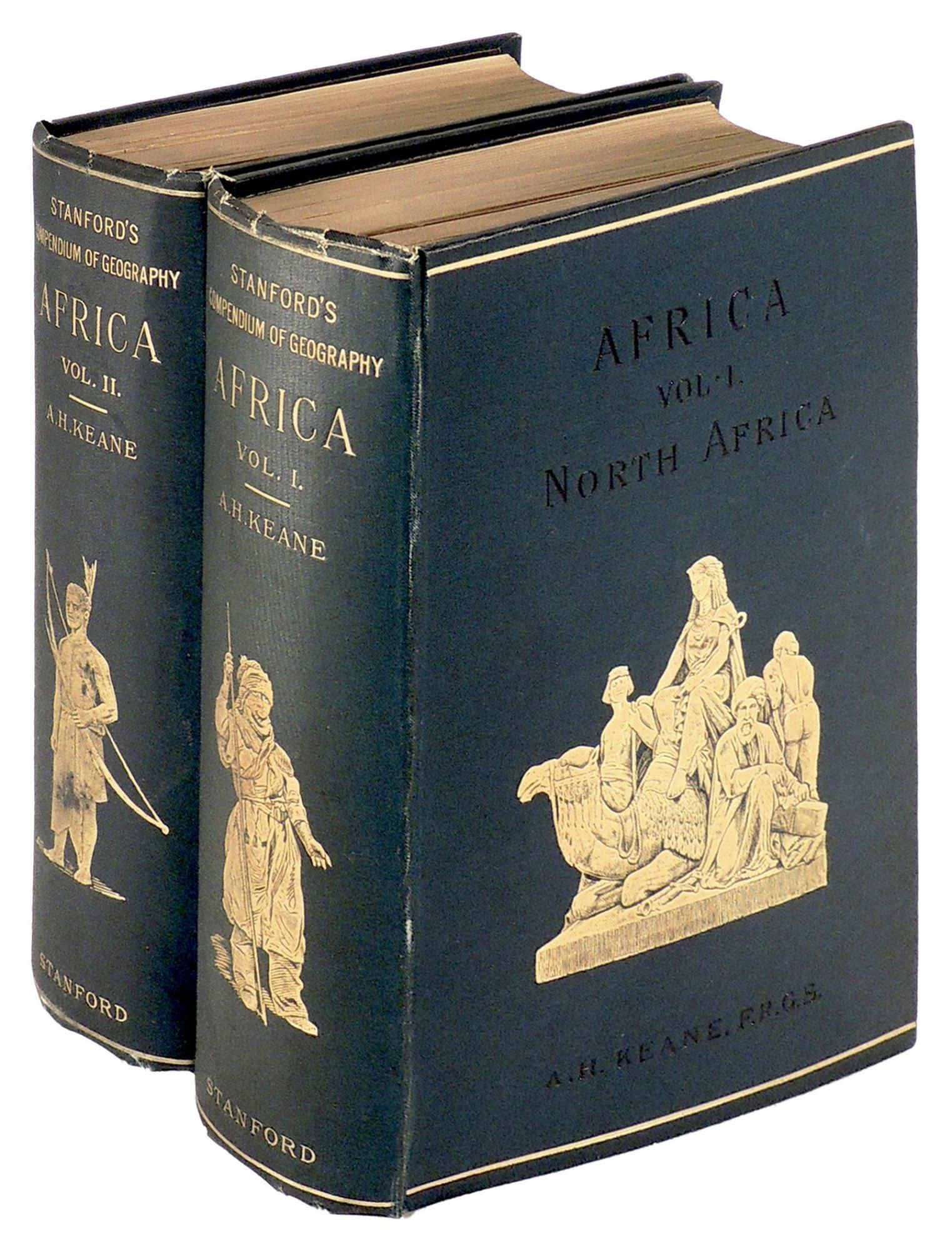 London: Edward Stanford, 1895. Hardcover. Near Fine. Hardcover. This is a particularly beautiful two volume edition of Keane's comprehensive and fascinating descriptive history of north and south Africa. There is an unobtrusive stamp of the Literary & Historical Society of Quebec, Canada, almost the only indication that this set was in a library. The work is part of Stanford's Compendium of Geography and Travel. The publisher writes in the preface that this is a new issue of this series, the single volume previously through sufficient was replaced by two, each somewhat larger than that work. Augustus Henry Keane (1833–1912) was an Irish Roman Catholic journalist and linguist, known for his ethnological writings. He studied in Germany and taught at Hameln; and became a linguist. He taught languages including Hindustani at the Hartley Institute, Southampton; a chair of Hindustani was created for him at University College, London, in 1883, Keane's racial theories were published first in Nature in 1879–81. He affirmed the specific unity of human beings in his 1896 text Ethnology, even if his views had some other implications. He produced racial typologies, in his expository writings. Keane was out of step with the anthropology of the time, preferring linguistic data to that of physical anthropology and came to occupy a marginal position in the emerging scientific discipline.[ On the other hand, his efforts at popularizing anthropology were praised by Sir Harry Johnston. Keane's views were invoked by F. W. Bell in South Africa from 1908, with those of Robert Bennett Bean, and played a part in the move of the Transvaal Native Affairs Society towards a segregationist position. He was known for his sympathies displayed in The Boer States (1900). The stance taken by Keane, who has been described as a "virulent racist", was conveyed in person when he addressed the Transvaal Native Affairs Society in 1909. He cited Robert Wilson Shufeldt of Virginia, author of The Negro a Menace to American Civilization (1907), aiding the Bell faction against the moderates around Howard Pim. [from Wikipedia].