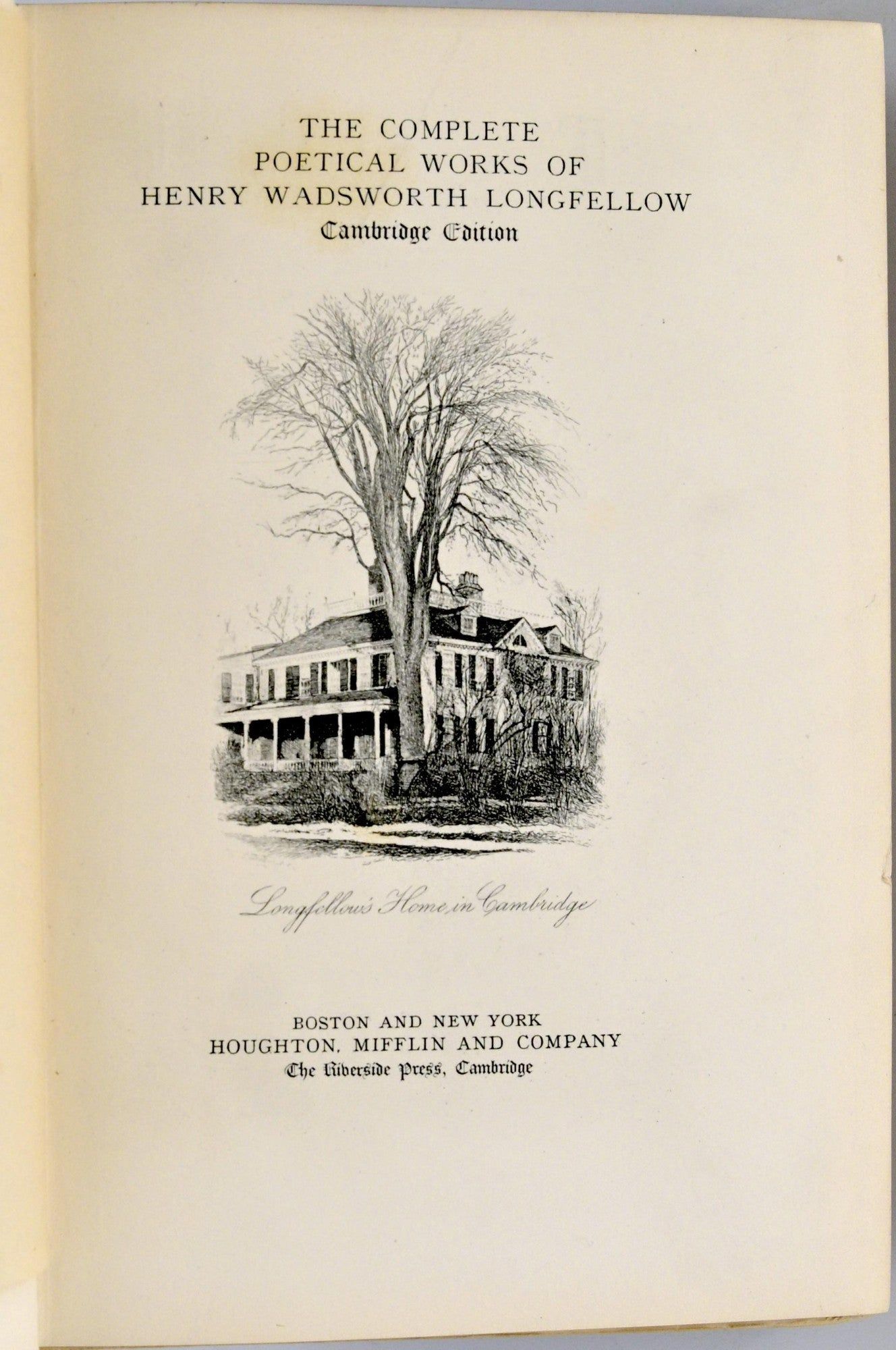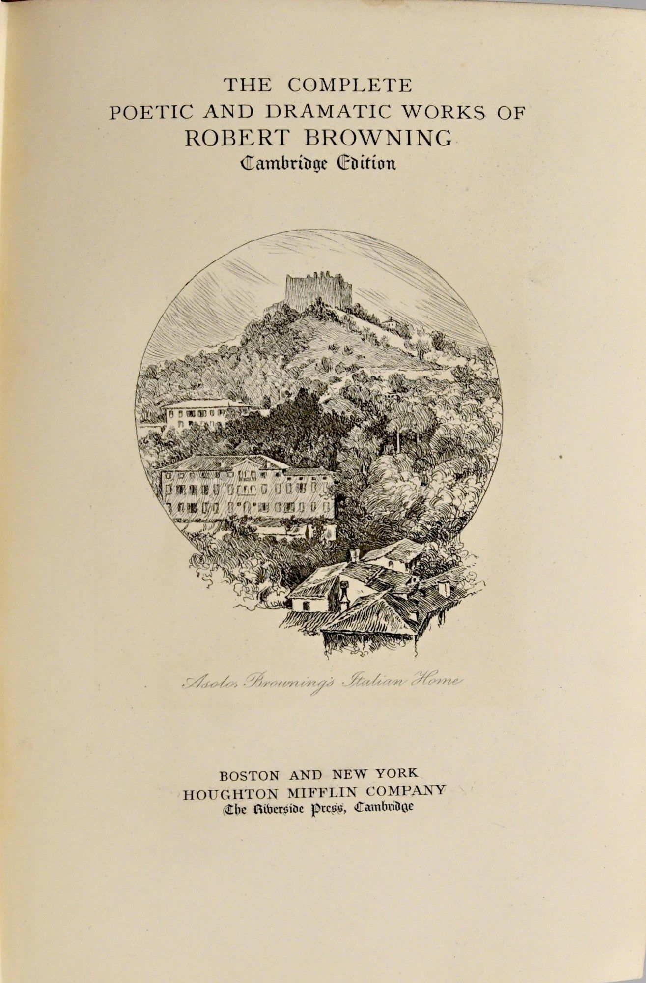 Boston: Houghton Mifflin and Company, 1895. Hard Cover. Very Good binding. Two copies of the Cambridge Editions by Houghton Mifflin, one being The Complete Poetical Works of Henry Wadsworth Longfellow and The Complete Poetic and Dramatic Works of Robert Browning, each with an engraved vigrnette on the title page.~~The two volumes are from the personal library of Rose D. Bowser, with her address in Richmond 513 N. Adams St. The Longfellow book is dated in her had, and the Browning she dated April, 1921.~~Rosa Bowser is listed in the Encylopedia of Virginia. She was an African American teacher in the Richmond schools and helped create the first progressional African American teacher’s association. She was an instrumental figure in a number of African American reform organizations including industrial schools for black children as well as organizations opposed to lynching. Very Good binding.
