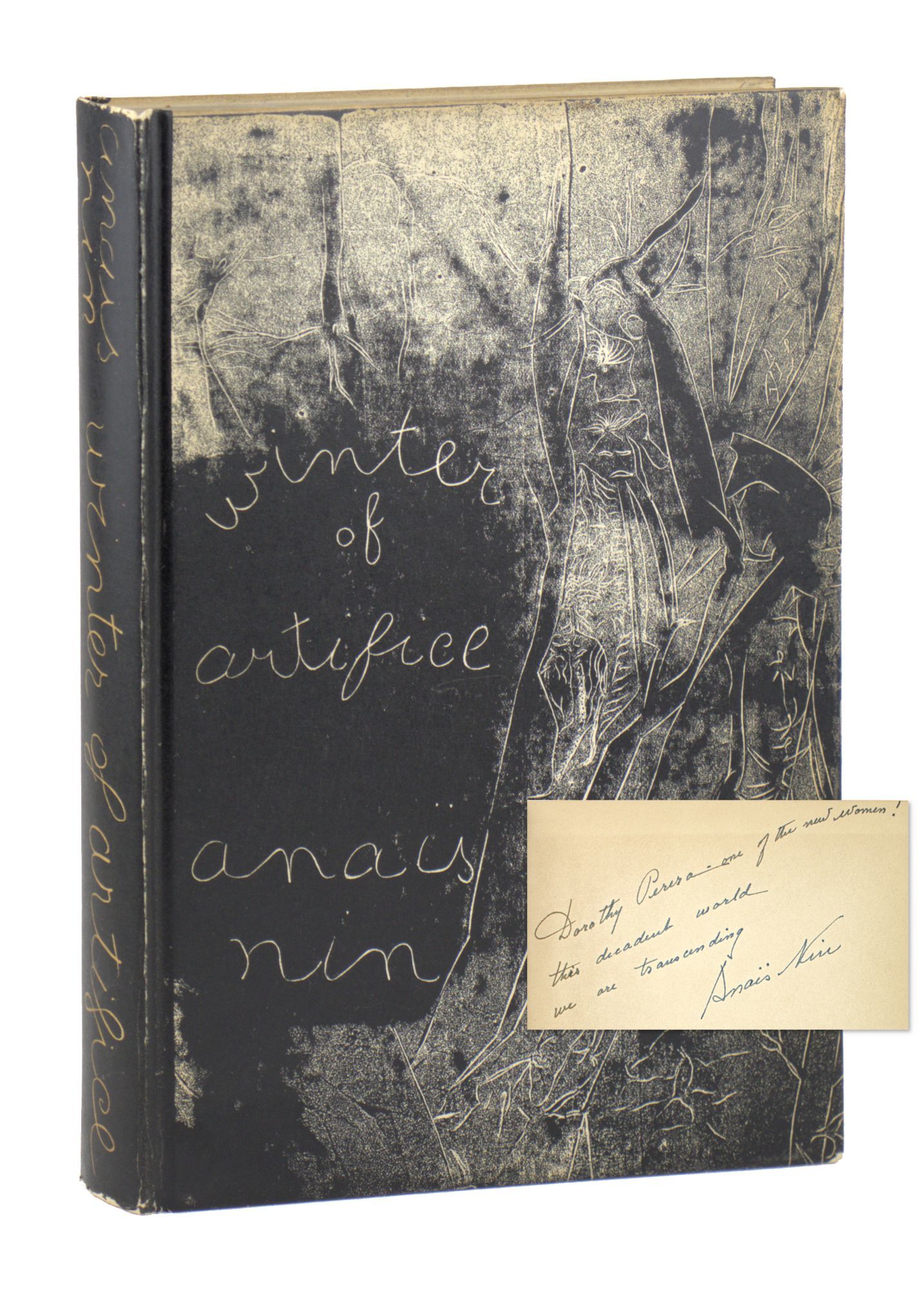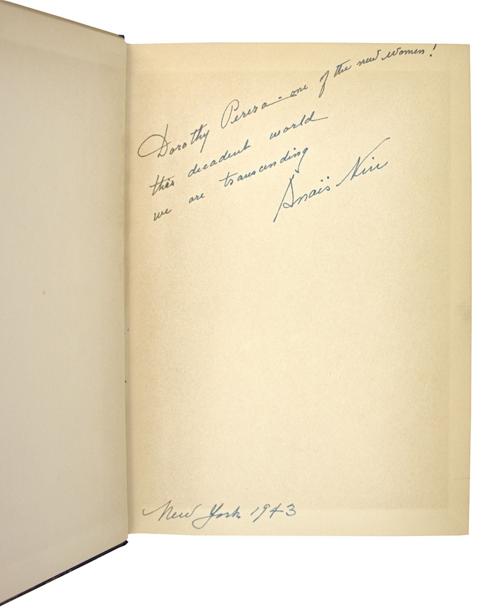 New York: Gemor Press, 1942. Very Good +. [New York]: [Gemor Press], n.d. [ca. 1942] First American Edition, Limited to 500 copies. Octavo (21.5cm); publisher's black pictorial paper-covered boards; [4],155pp.; copper engravings throughout. Brief rubbing to spine ends and corners, white spine titling browned, textblock lightly toned, else a Very Good or better example. Inscribed and signed by the author on front free endpaper: "Dorothy Perera - one of the new women! this decadent world we are transcending / Anaïs Nin / New York, 1943."