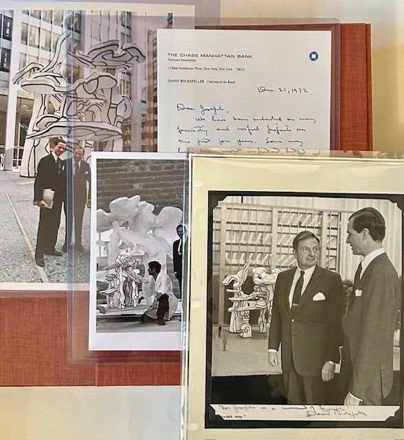 1972. Portfolio. Near Fine. A wonderful chronicling --through photos, letters and documents-- of the commission and the 1972 unveiling (both overseen by David Rockefeller, the CEO of Chase Manhattan Bank) of "Group of Four Trees", the first monumental sculpture specifically intended for the United States created by the great French painter and sculptor Jean Dubuffet (1901-1985). The portfolio includes: various original photographs of Jean Dubuffet and David Rickefeller (and his assistant Joseph Verner Reed, who would soon become the Under-Secretary General of the United Nations), either at Dubuffet's studio in France during the construction of "Group of Four Trees" or in more formal poses in front of the sculture in New York; signed letters (a TLS from Dubuffet including original snap shots attached, and an ALS from David Rockefeller to Joseph Verner Reed); The Chase Manhattan "Release" introducing the sculpture to the Chase community, an in-house biography of David Rockefeller, an in-house essay on Chase Manhattan's nascent art program and catalogues of both Jean Dubuffet himself and specifically "Group of Four Trees". All the separate pieces are clean and bright and in crisp, Near Fine condition. All housed in their russet cloth chemise and matching russet slipcase (with leather title label along the spine). A very impressive documentation of corporate art collecting at the highest level, with both Jean Dubuffet and David Rockefeller as the 2 towering principals in this particular instance.