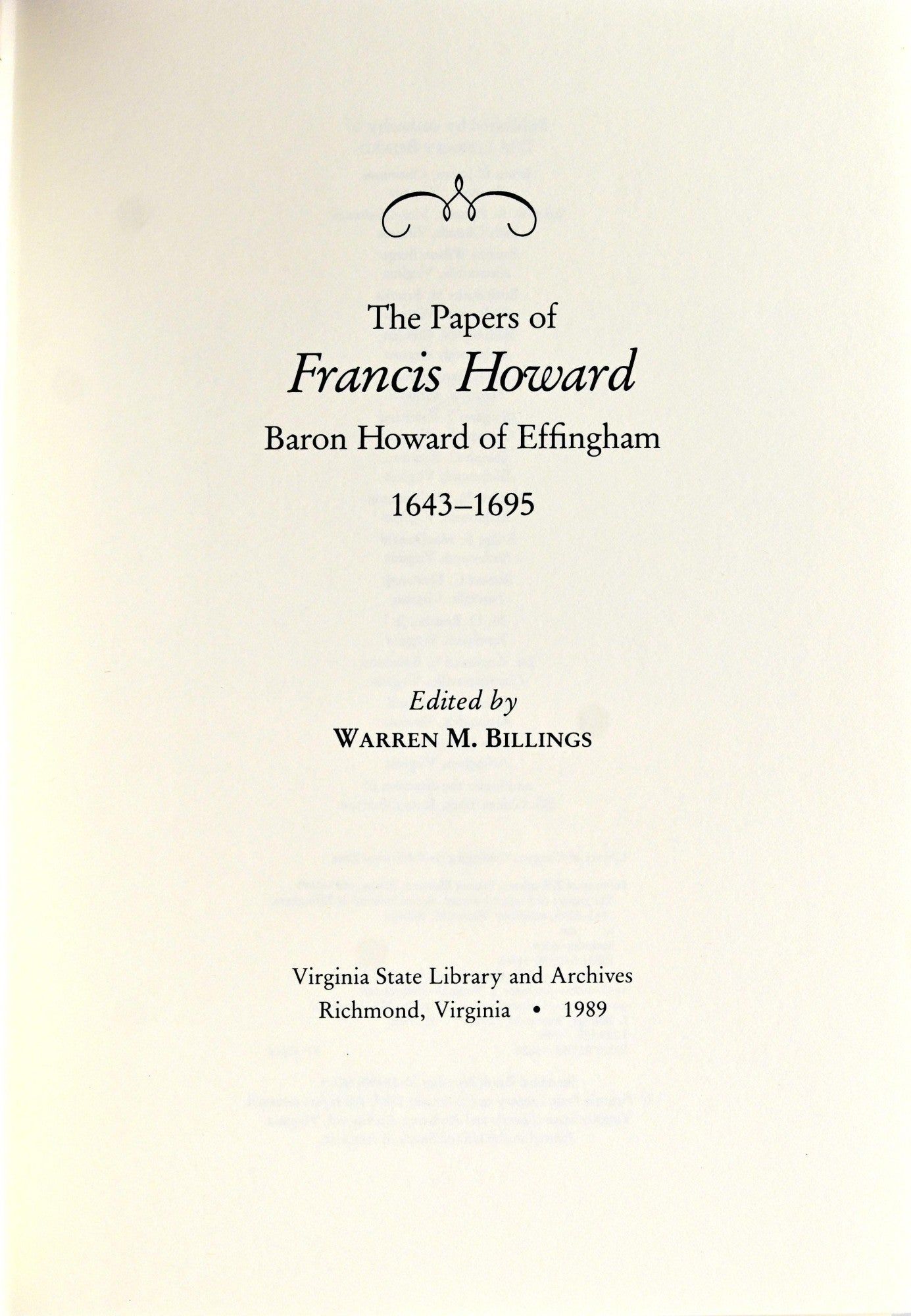 [SIGNED] [VIRGINIANA] THE PAPERS OF FRANCIS HOWARD BARON HOWARD OF EFFINGHAM 1643-1695