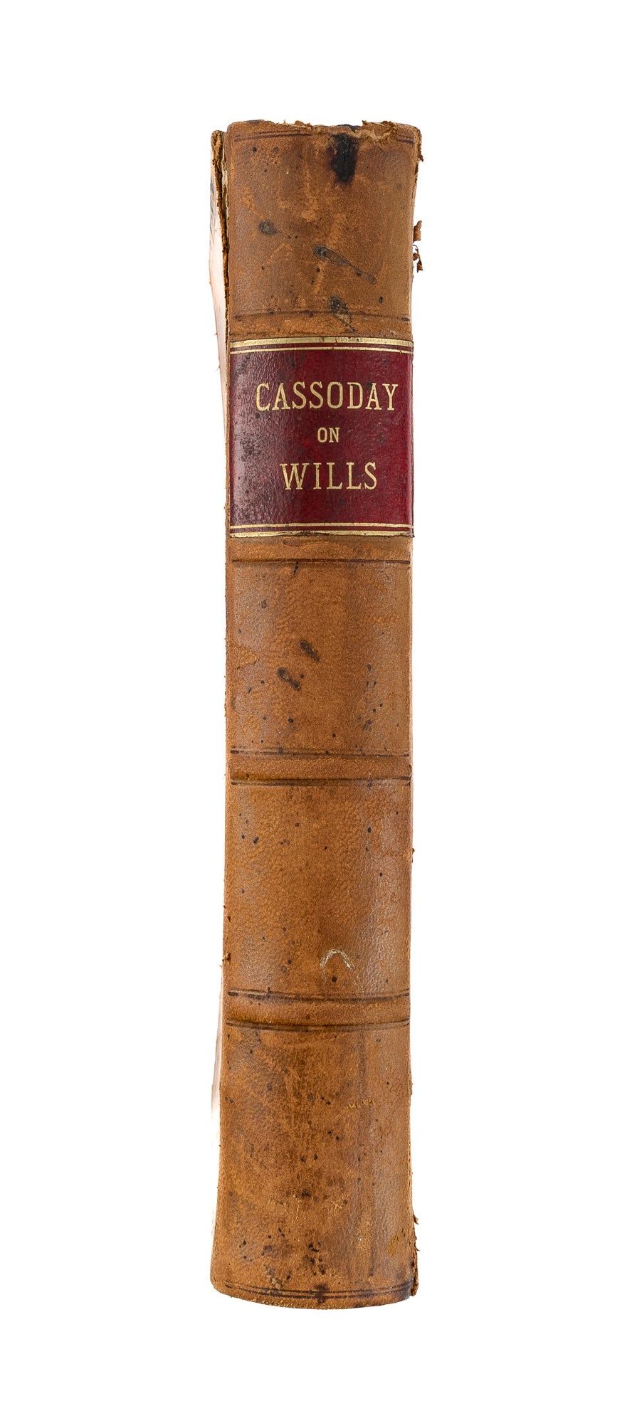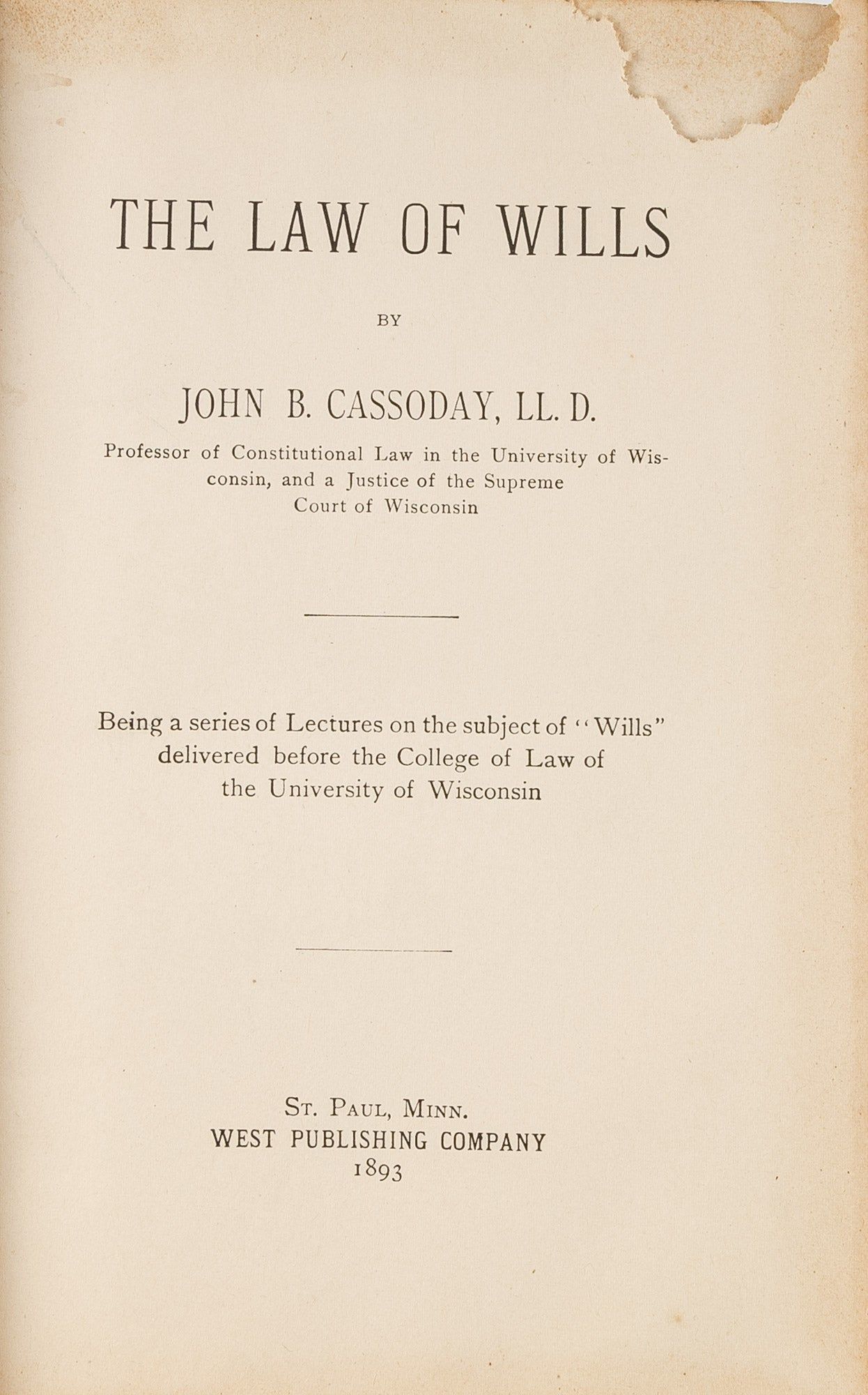 1893. Cassoday, John B[oliver], [1830-1907]. The Law of Wills: Being a Series of Lectures on the Subject of "Wills" Delivered Before the College of Law of the University of Wisconsin. St. Paul, Minn.: West Pub. Co., 1893. ix, 310 pp. Contemporary sheep with gilt red lettering piece to spine. Raised bands. Blind frames to boards. Worn and soiled with joints starting. Some offsetting to edges of endleaves. Front free endpaper, endleaf and title page torn. Some foxing, otherwise internally clean. $125. * Contents: Chapter 1: Introduction; Chapter 2: Execution of Written Wills; Chapter 3: The Witnesses and the Attesting Clause; Chapter 4: The Revocation of Wills; Chapter 5: The Right and Capacity to Make Wills; Chapter 6: Probate Jurisdiction; Chapter 7: General Principles of Construction.