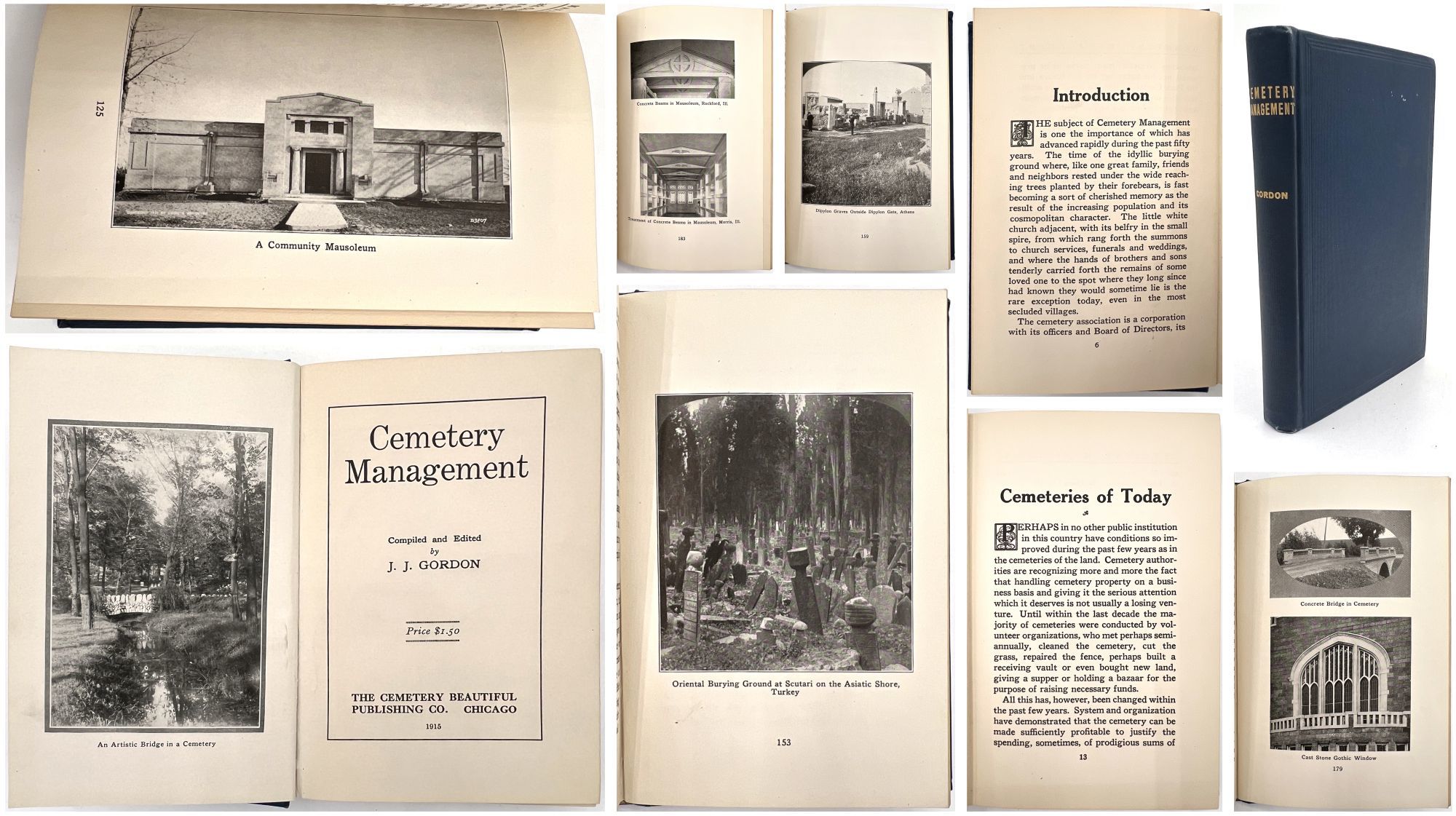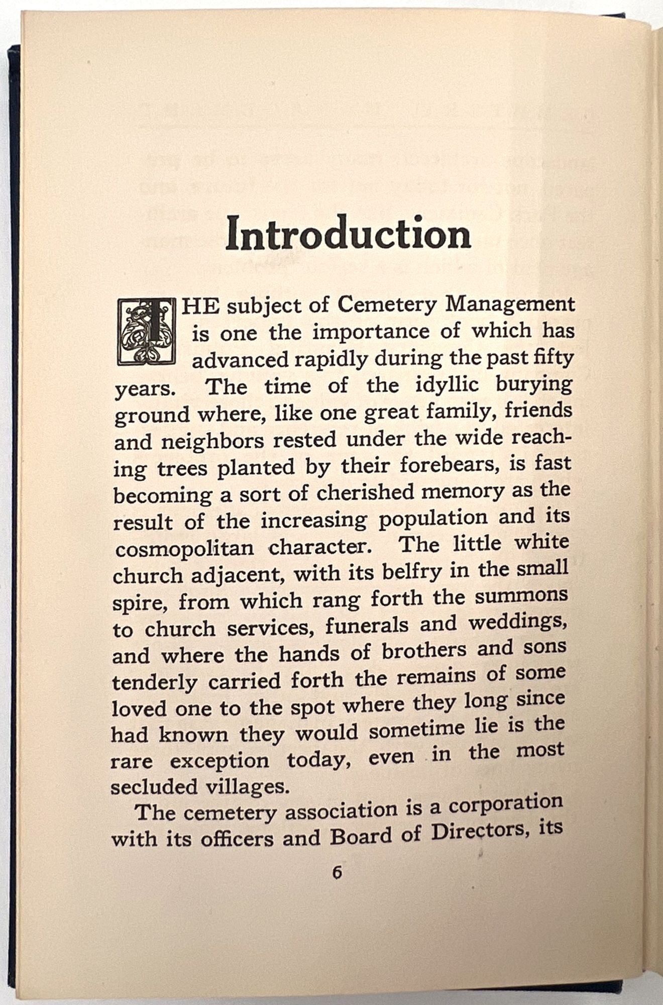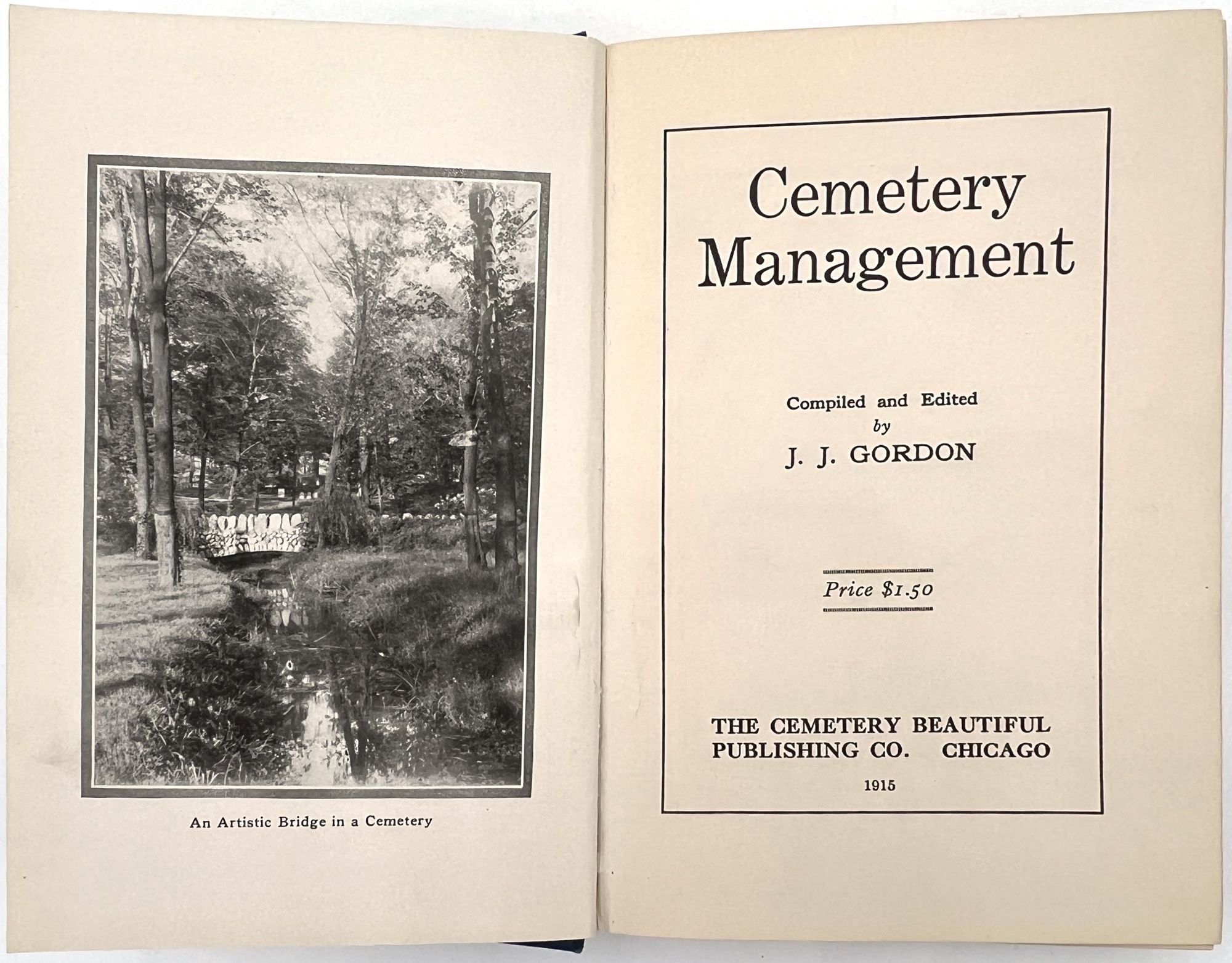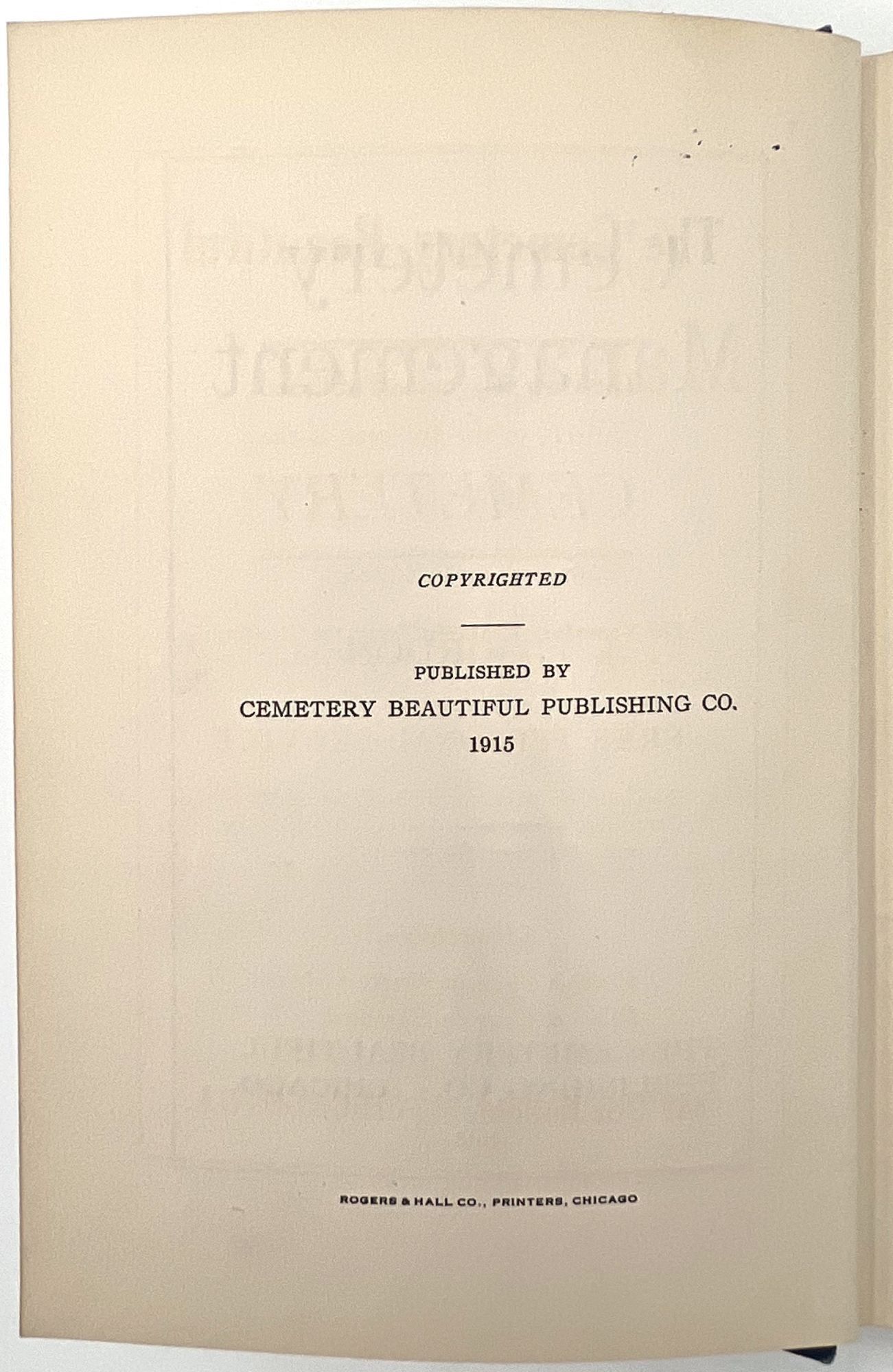 Chicago, Illinois: Cemetery Beautiful Publishing Co, 1915. Near-fine. Minor rubbing to extremities, upper hinge starting.. A scarce guide to cemetery management, covering the following topics: a history of cemeteries and interment; how to plan the perfect cemetery (location, topography, drainage, landscaping etc.); flowers; cremation; primate mausoleums; accounting for small cemeteries; perpetual care funds; organization and ownership; rules and regulations; and the use of automobiles in the cemetery. Single vol. (7.5" by 4.75"), pp. 204, original publisher's blue cloth stamped in gold on spine. Contemporary ownership inscription to front free endpaper ("Chas B. Joyce November 1 1917 Branford Illinois"). 3 copies on WorldCat only as of December 2023.