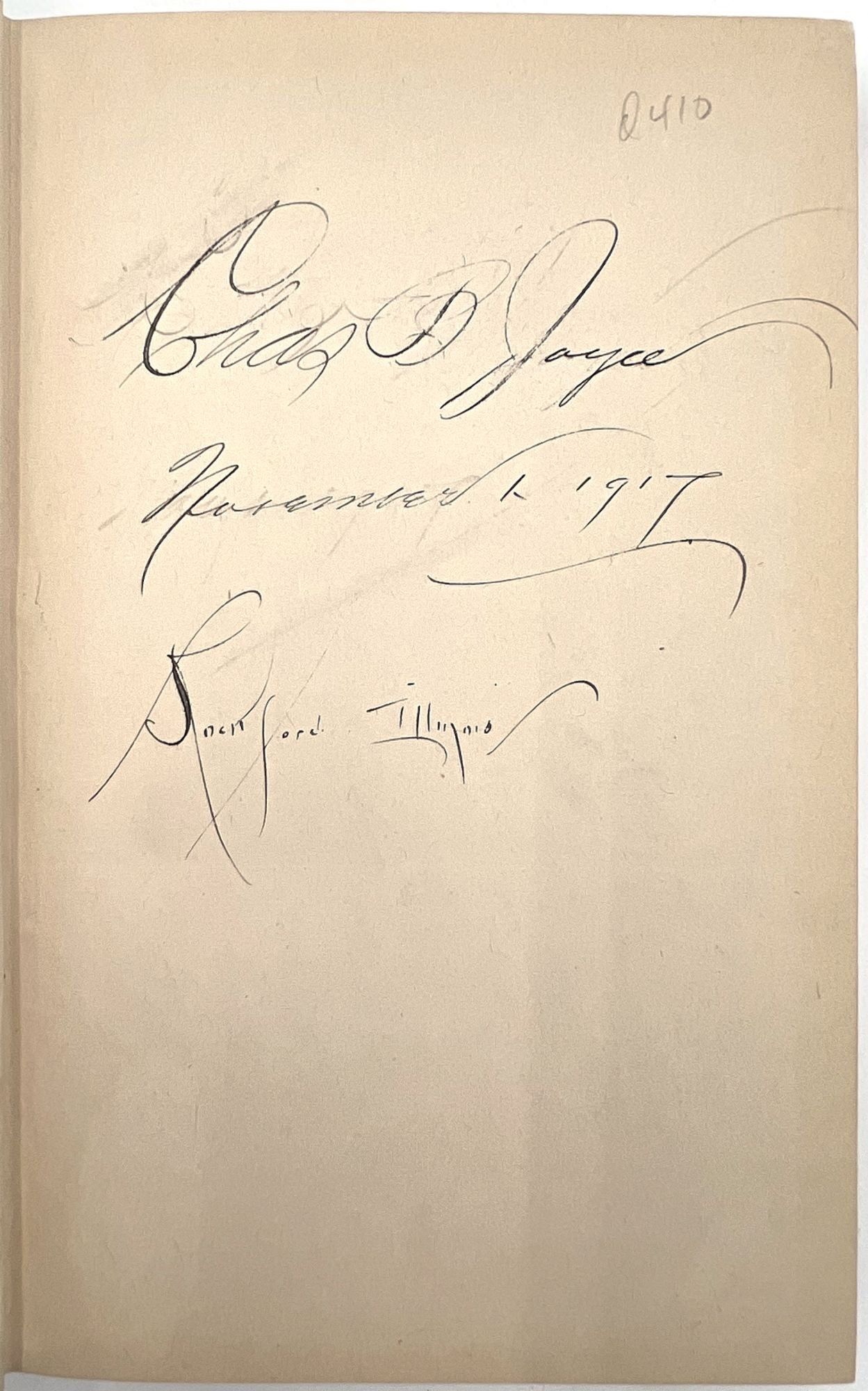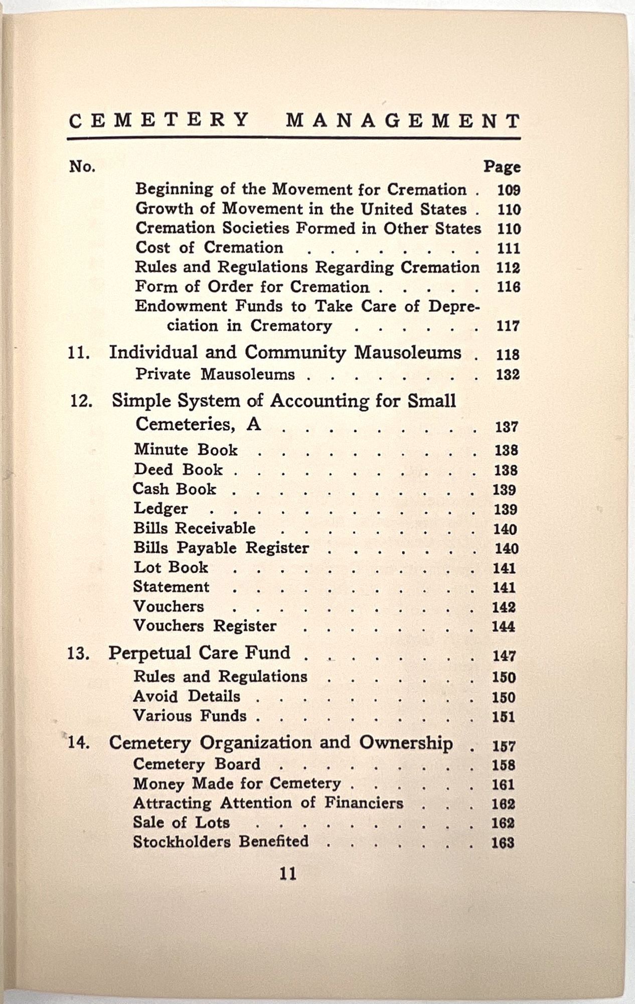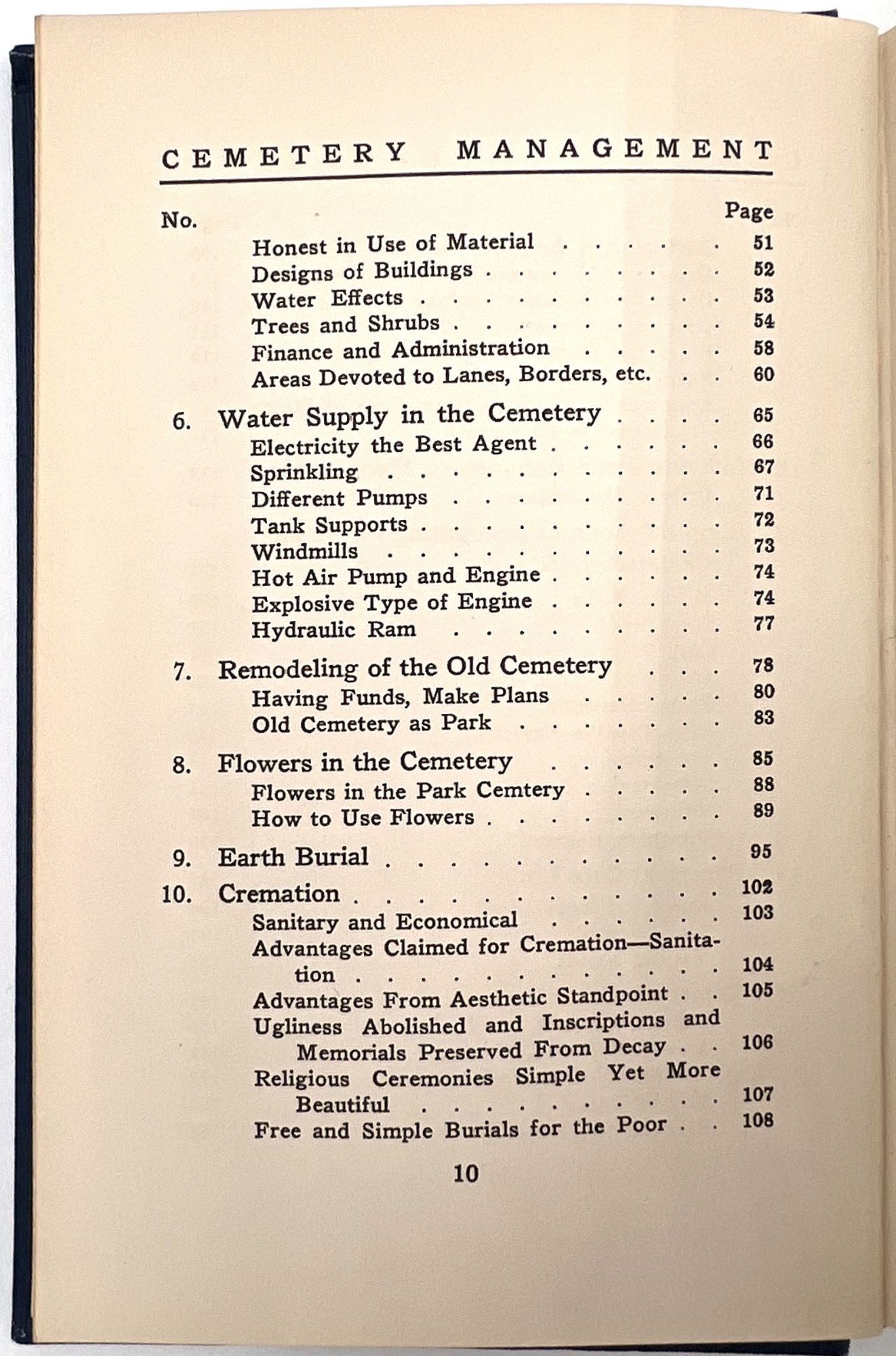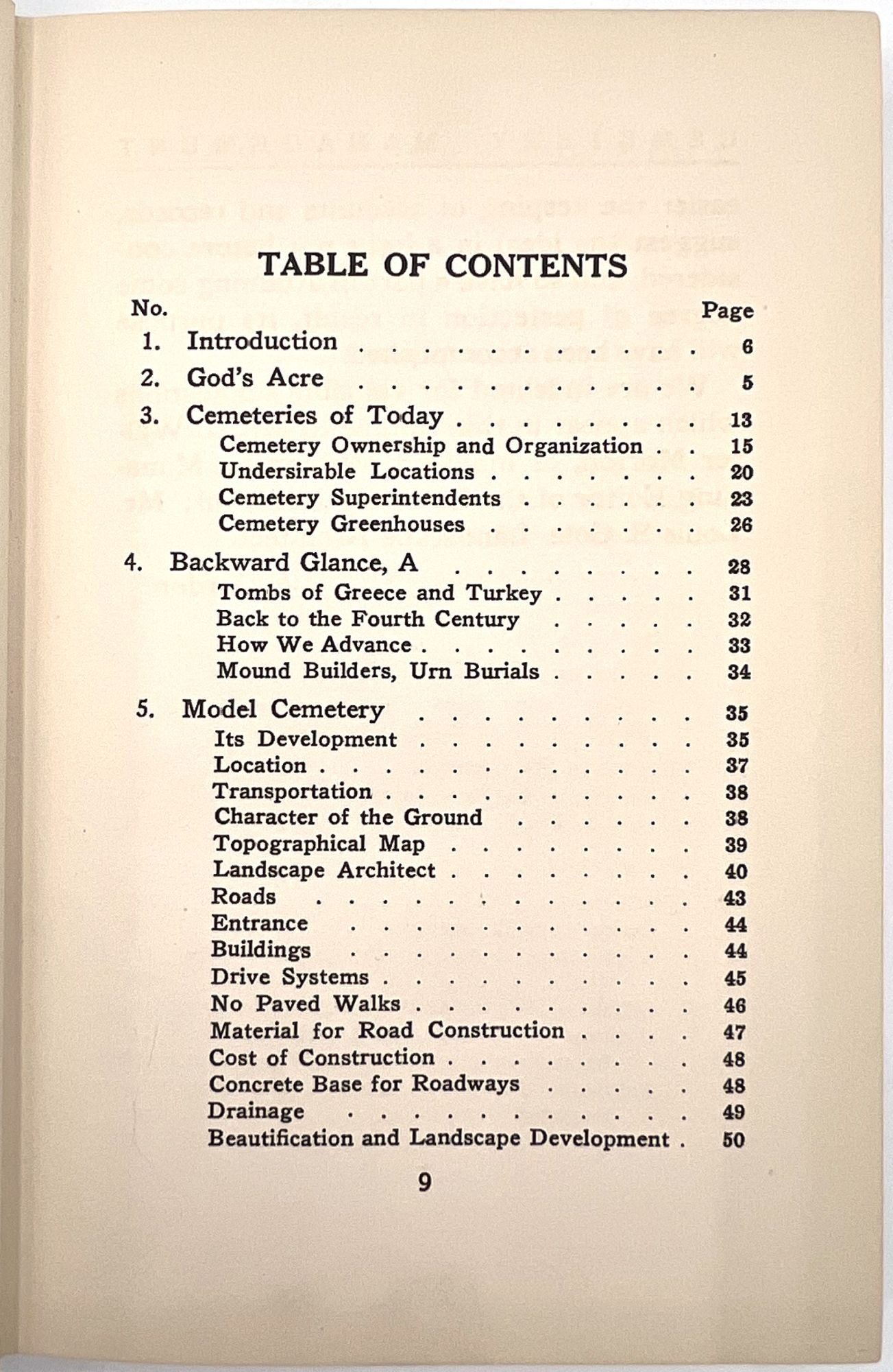 Chicago, Illinois: Cemetery Beautiful Publishing Co, 1915. Near-fine. Minor rubbing to extremities, upper hinge starting.. A scarce guide to cemetery management, covering the following topics: a history of cemeteries and interment; how to plan the perfect cemetery (location, topography, drainage, landscaping etc.); flowers; cremation; primate mausoleums; accounting for small cemeteries; perpetual care funds; organization and ownership; rules and regulations; and the use of automobiles in the cemetery. Single vol. (7.5" by 4.75"), pp. 204, original publisher's blue cloth stamped in gold on spine. Contemporary ownership inscription to front free endpaper ("Chas B. Joyce November 1 1917 Branford Illinois"). 3 copies on WorldCat only as of December 2023.
