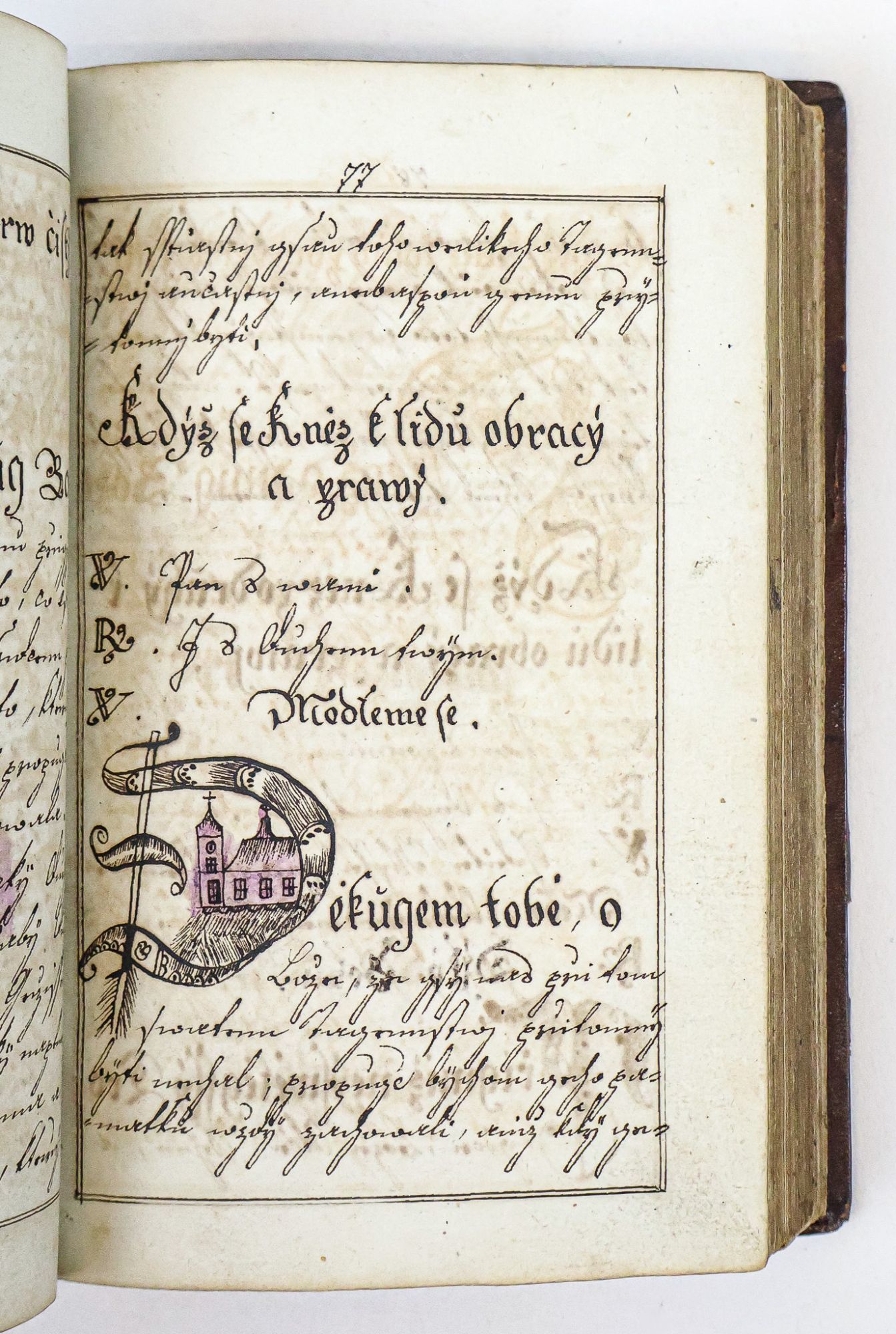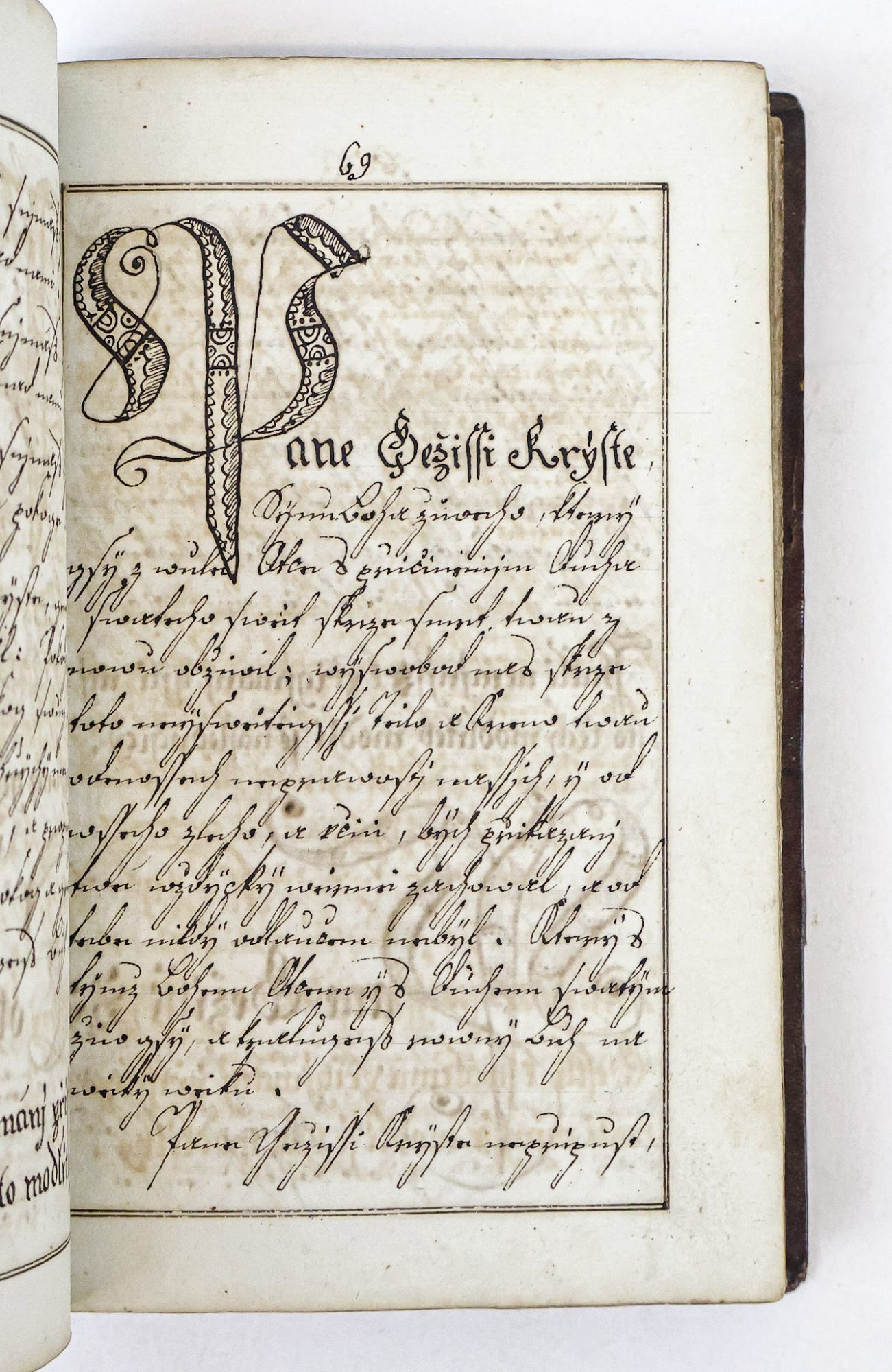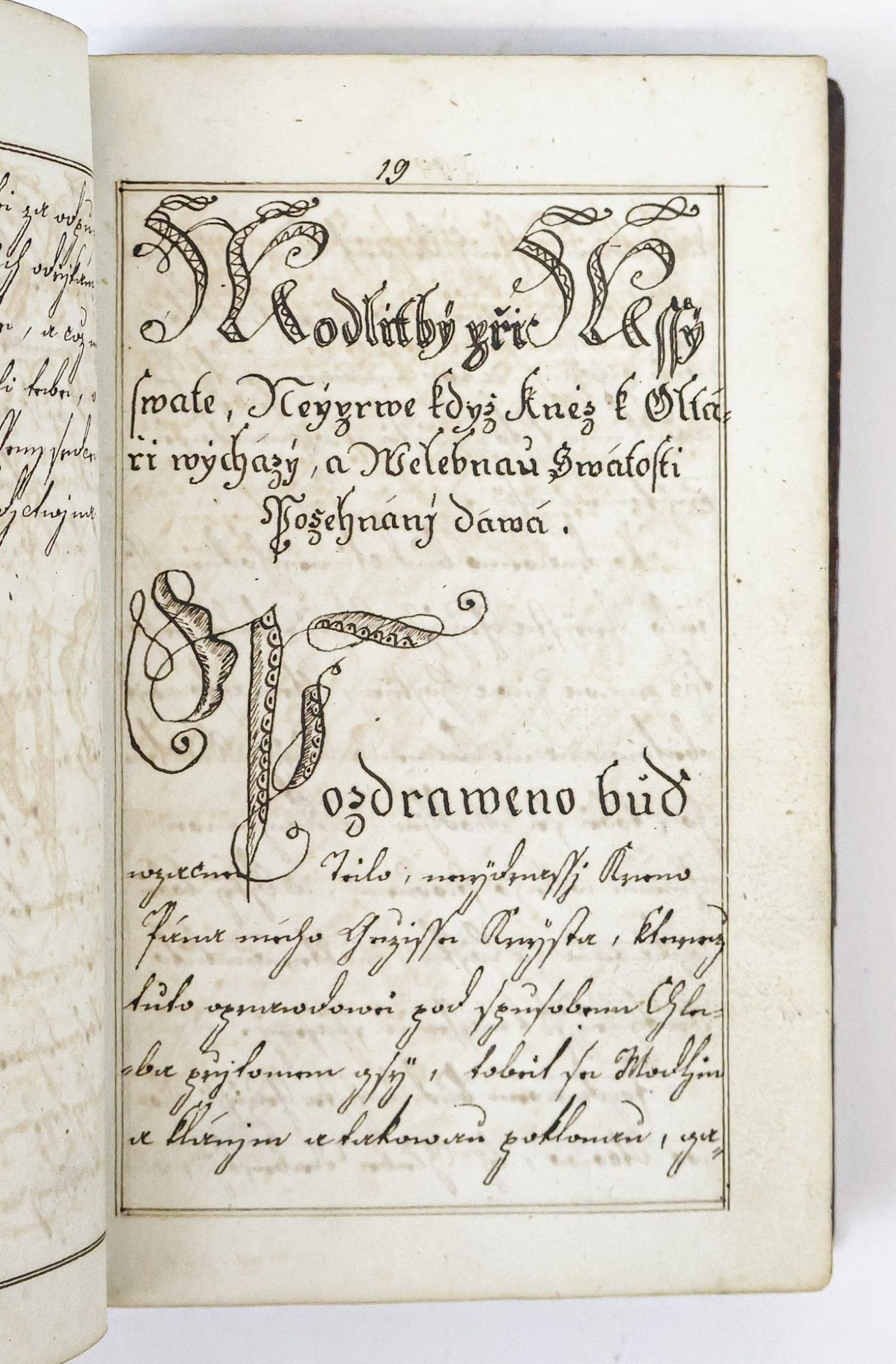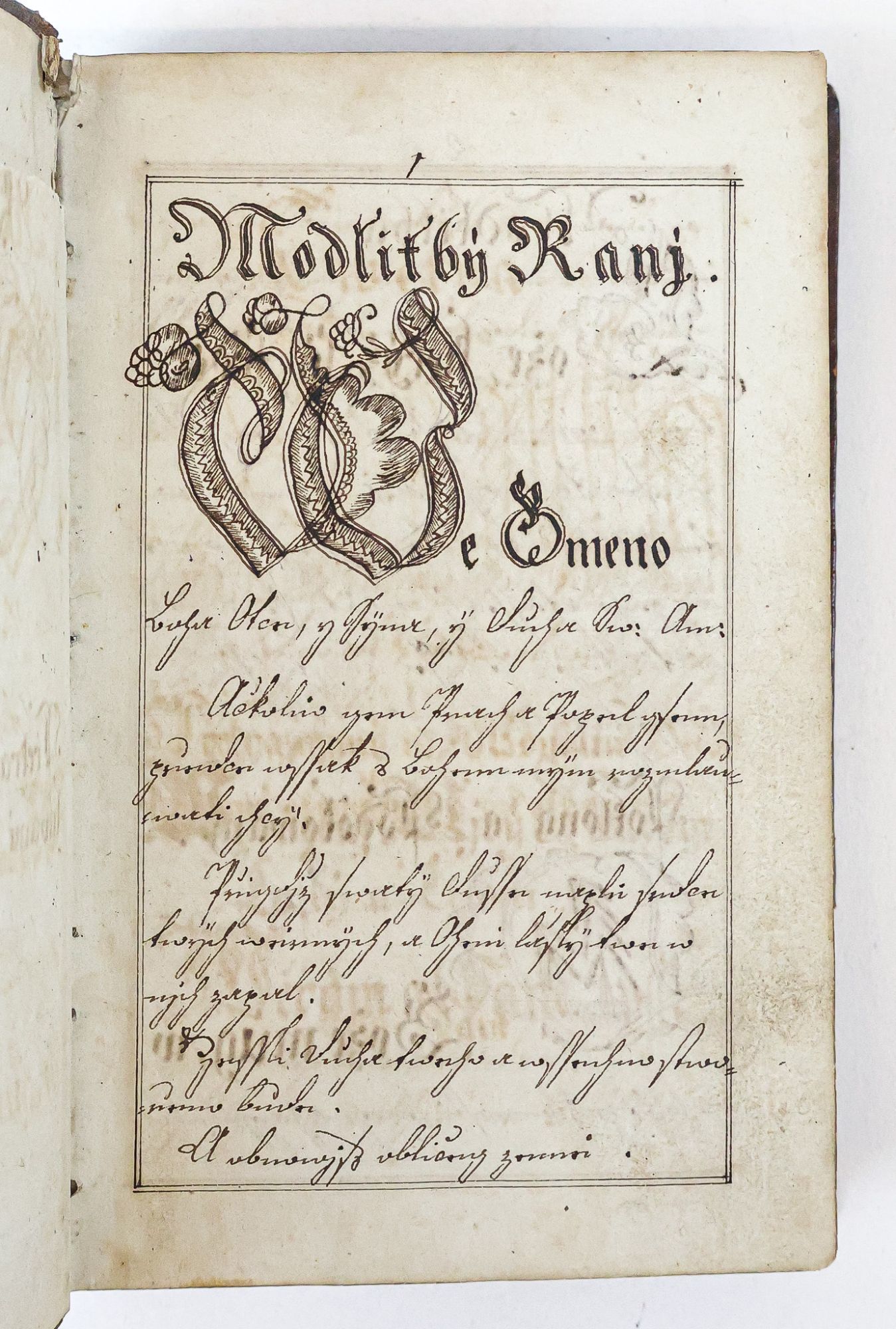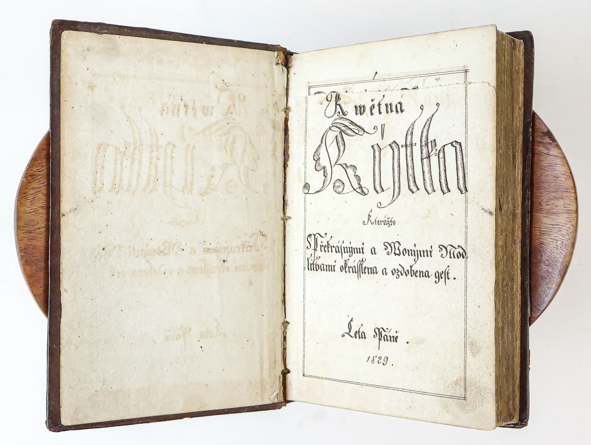 [Štědrákova Lhota] [Tschödrich]: [n.p.], 1829. Hardcover. Octavo, [4], 330 pages. In Good condition. Full brown calf, with tooling to front and rear boards. Boards show significant splitting to leather along front and rear joints, moderate wear to leather along joints, light bumping and wear to corners, and light wear overall. Text block has moderate age toning and some minor staining to edges, light age toning to pages throughout, and light plus offsetting to handwritten text. Top eighth of title page has been excised. Manuscript prayerbook, written in ink in early 19th-century Czech script. Each prayer / section prefaced with ornamental capital. Three 19th-century ownership inscriptions (two in ink, one in pencil) appear on front free end page. Pages hand numbered. Floral endpapers.