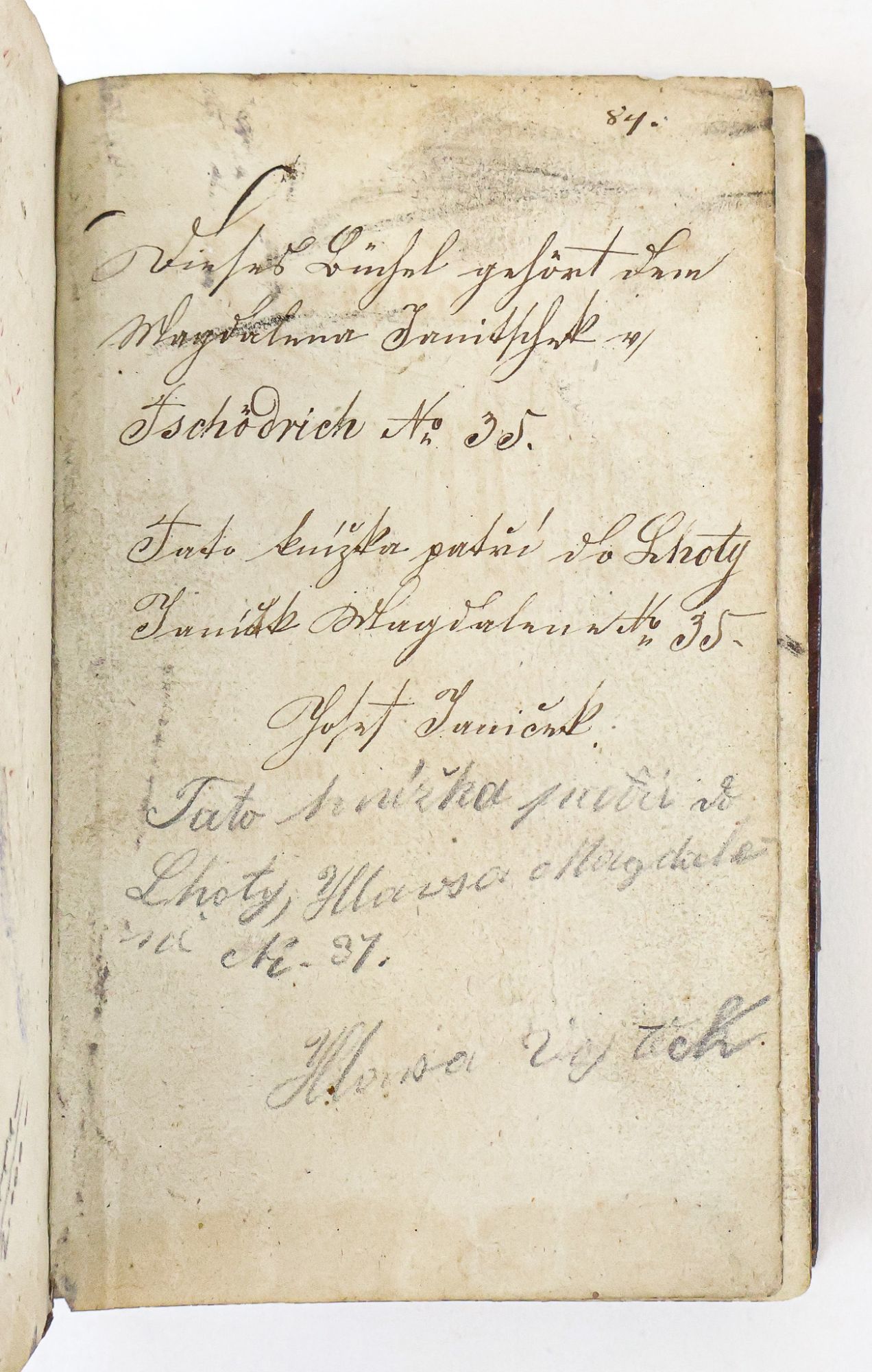 1: Diese Einfalt gehört der Magdalena Junitschke in Tschödrich No. 35. [Possibly Magdalena Janicek born in 1796 at #26 Štědrákova Lhota]. [Trans: This simple [book] belongs to Magdalena Junitschke in Tschödrich [house] No. 35.]