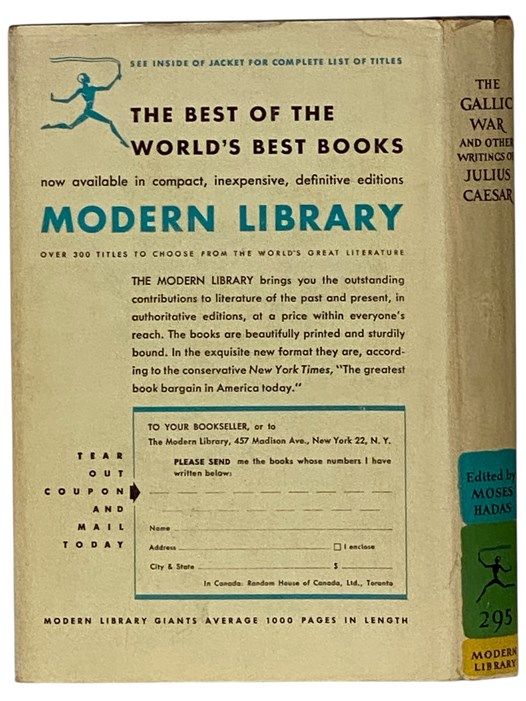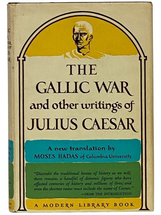 New York: The Modern Library, 1957. Reprint. Hard Cover. Very Good/Very Good. 7x4x0. 1957-59 printing of Toledano 295.1, binding/jacket style 8i, $1.95 jacket price, grey Rockwell Kent endpapers, 393 titles on jacket verso. Jacket lightly toned, ink name and date on verso of front endpaper. xix, 363 pp. Includes frontispiece map of Roman Empire and two-page map of Gaul. A collection of the Roman emperor's historical writings, translated and introduced by Moses Hadas, with a gazetteer of names following text. Includes: Introduction; Gallic War I-VIII; Civil War I-III; Alexandrine, African, and Spanish Wars; Fragments. "Julius Caesar (100 BCE - 44 BCE), the famous Roman politician and soldier, rose to fame and power in his conquest of the Celts of western Europe. His book Commentarii de Bello Gallico (Commentaries on the Gallic War, often called The Conquest of Gaul), was a propaganda piece (written in 53 BCE) justifying his military and political actions during a nine year campaign in Gaul (and a short jaunt into Britain). Although he clearly had much first-hand contact with Celts, some scholars believe that he also drew upon Posidonius. He was not interested in Celtic ethnography per se, but rather on the political and social matters of the elite which were relevant for Roman imperial interests. As Rankin has observed, "Caesar was not a historian: he was a political war-lord in need of good public relations material to confuse both friends and enemies in Rome about the true nature of his activities in Gaul." - Exploring Celtic Civilizations