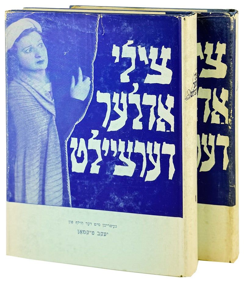 New York: Celia Adler Foundation / Shulsinger Bros. Linotyping & Publishing Co, 1959. Very Good/Very Good. New York: Celia Adler Foundation / Shulsinger Bros. Linotyping & Publishing Co., 1959. First Edition. Two octavo volumes (23.5cm); 688pp. Black and white photographs. Photo-illustrated dust jackets; blue cloth boards. Yiddish-language text throughout. Dust jackets show mild chipping with a few short tears along edges; general rubbing and sun-fading. Old damp-marks to board edges of both volumes, causing discoloration to cloth but no structural damage. Bindings sound. Glue residue to endpapers of volume II, else unmarked and still a Very Good set of this uncommon autobiography of "The First Lady of Yiddish Theater." Adler was known for creating leading roles in Yiddish versions of many classic plays, and was the first actor to portray a Holocaust survivor in her brother Luther's 1946 Broadway production A Flag is Born. Scarce.