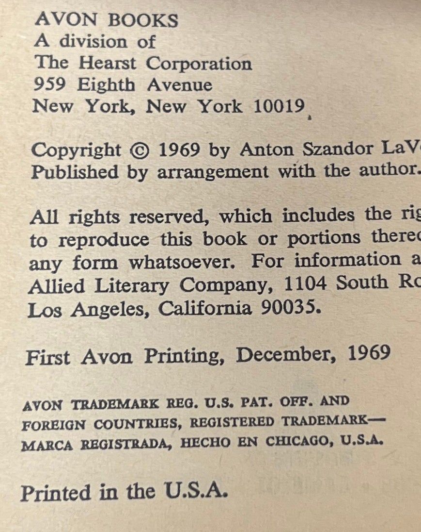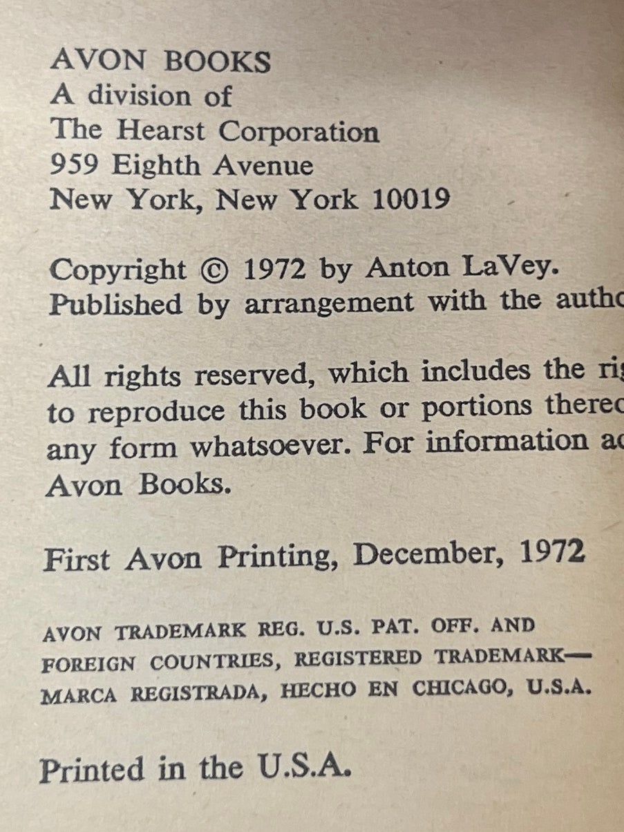New York: Avon, 1972. First Edition. Mass Market Paperback. Near Fine. Two volumes. Near Fine. Wraps lightly rubbed and bumped, a small scuff at the fore-edge of Rituals, a few faint spine creases on Bible. Firmly bound, former owner's initials and dates inside the front covers, clean otherwise. A nicely preserved set of these foundational texts of Satanism.