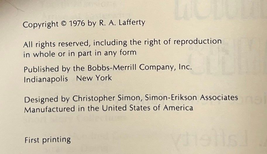 Indianapolis: The Bobbs-Merrill Company, 1976. First Edition. Hardcover. Very Good/Near Fine. Signed by Lafferty on the title page. Very Good in an about Near Fine jacket, unclipped ($6.95), generally toned, a few short creases and small chips. Purple cloth, faintly bumped, with gilt lettering on the spine. Square and firmly bound, a stain at the top edge, stray pen mark on the fore-edge, clean otherwise.