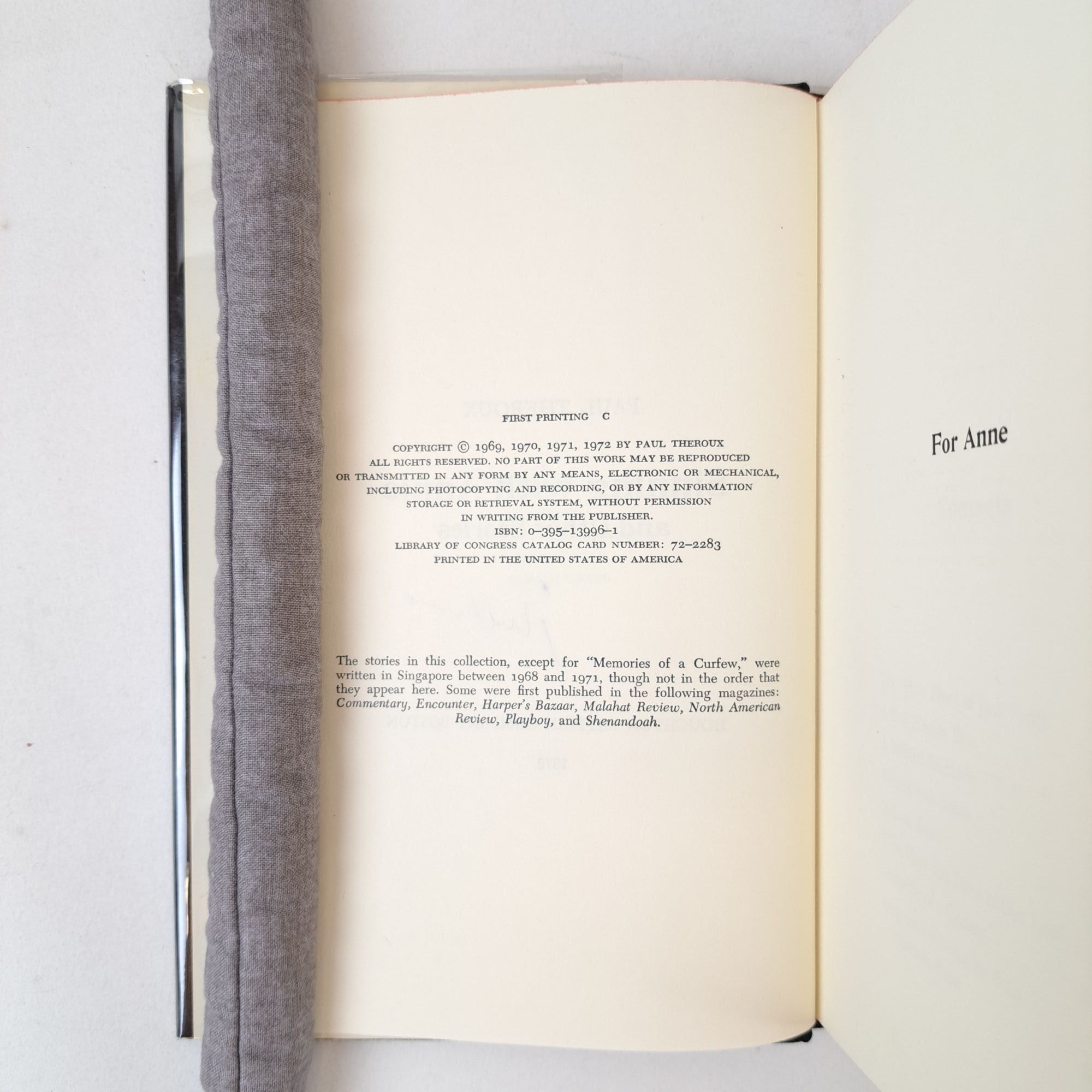 Boston, Massachusetts: Houghton Mifflin, 1972. First Edition, First Printing. Hardcover. Octavo, 210 pages. In Very Good minus condition with Very Good minus dust jacket. Spine is black with green and yellow lettering. Dust jacket protected by mylar covering, price uncut: "$5.95" on front flap, has mild creasing and shelving wear along extremities. Boards have mild shelving wear along extremities, mild mildew staining along front cover. Textblock head edge dyed orange and has mild sun-fading and dust-burning, fore edge has faint pencil streak pp.31-138; has soiled spot along fore edge of and previous owner's inscription on front free endpaper. Signed flat on title page by Paul Theroux. Shelved Room C. 1398926. Special Collections.
