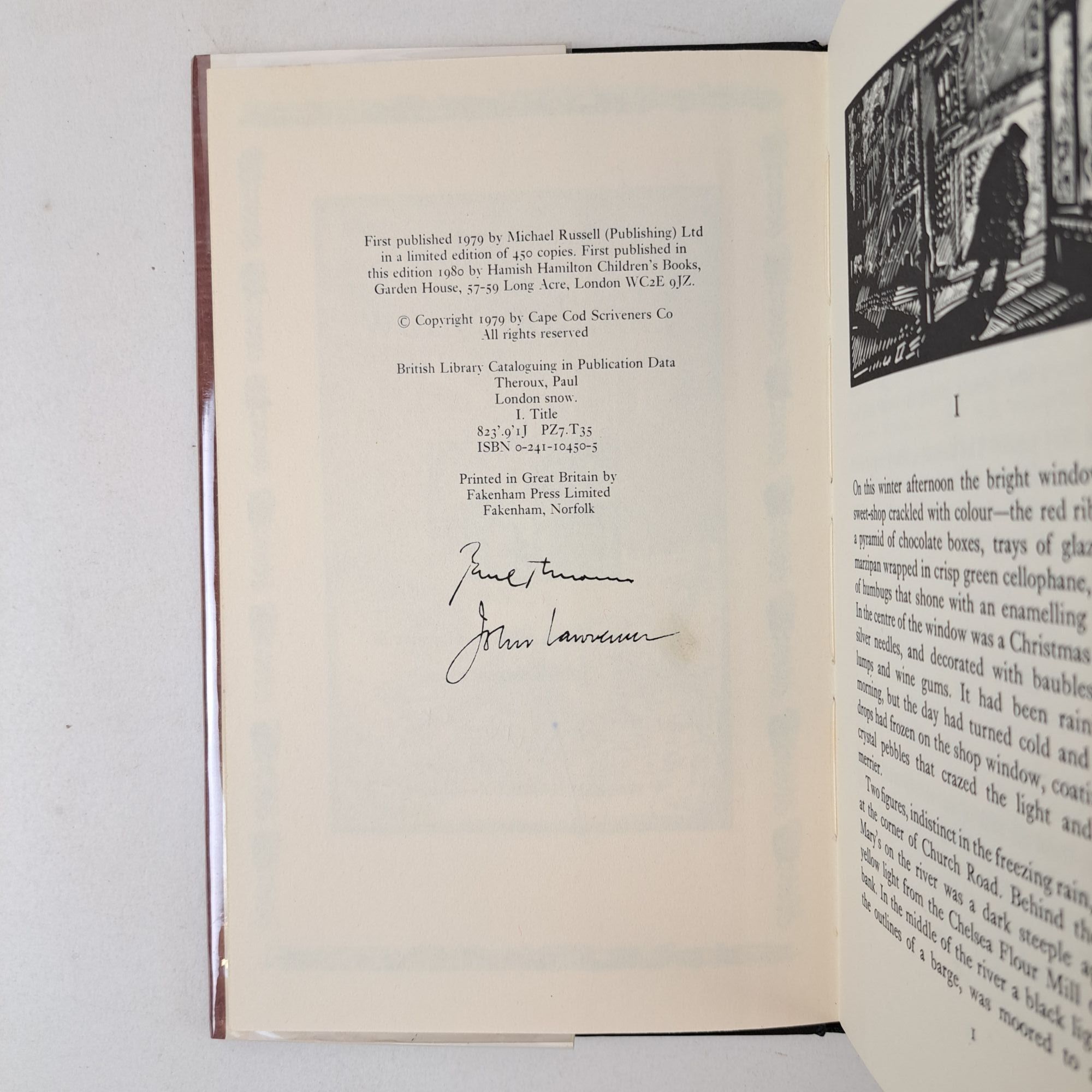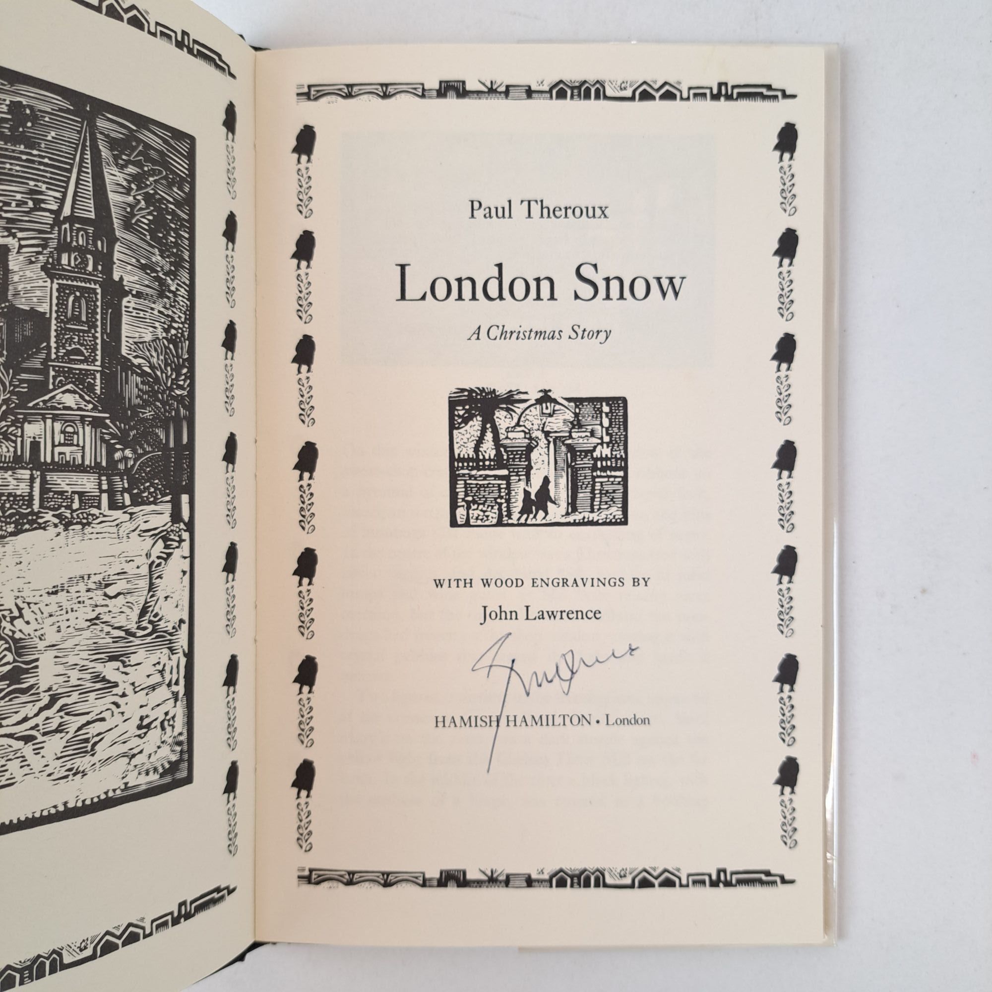 London, UK: Hamish Hamilton, 1979. First UK Edition. Hardcover. Small octavo, 50 pages. In Very Good condition with Very Good condition dust jacket. Spine is mauve with cream lettering. Dust jacket protected by mylar covering, price uncut: "£4.95" on front flap, covered with blue marker and pen (but still legible), has mild chipping to front head fore corner. Boards have mild creasing along spine head, tail, and to joints. Textblock edges mildly age-toned, head edge has mild foxing. Signed by Paul Theroux on title page and by Paul Theroux [Author] and John Lawrence [Artist] on copyright page. Shelved Room C. 1398929. Special Collections.