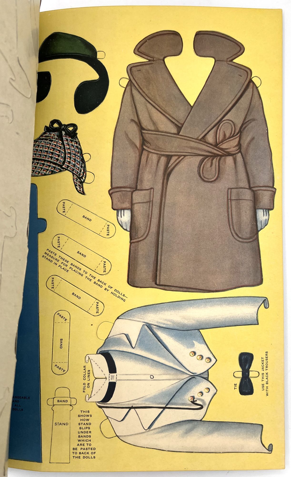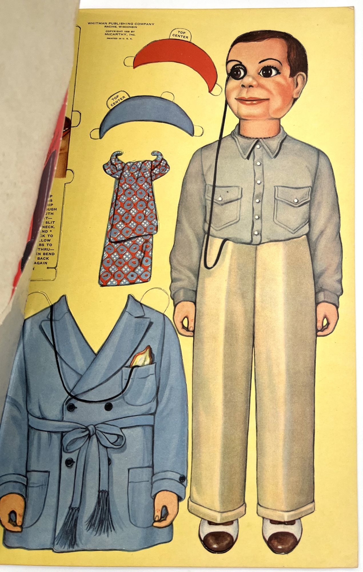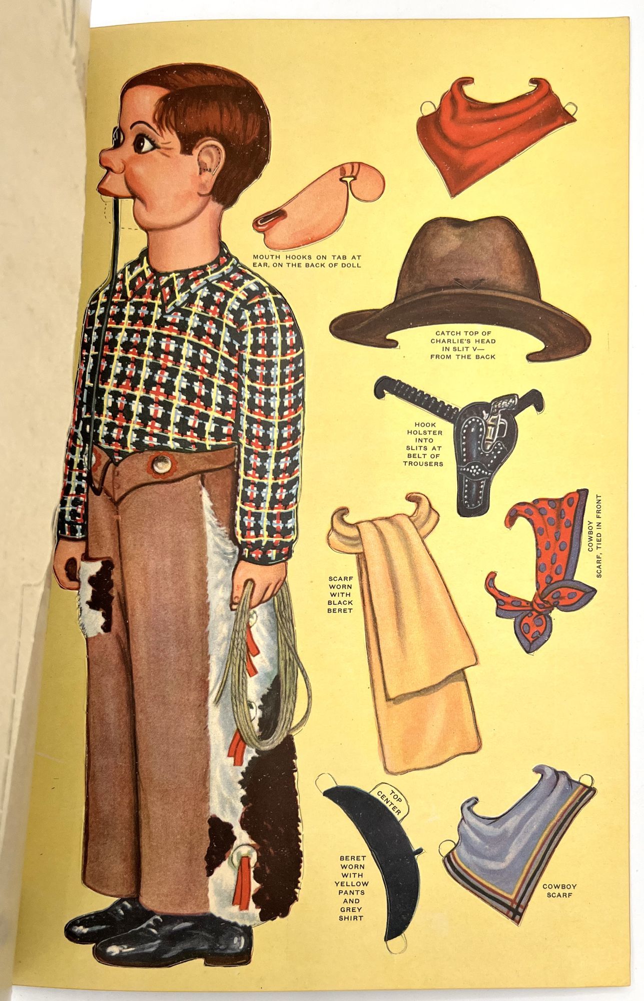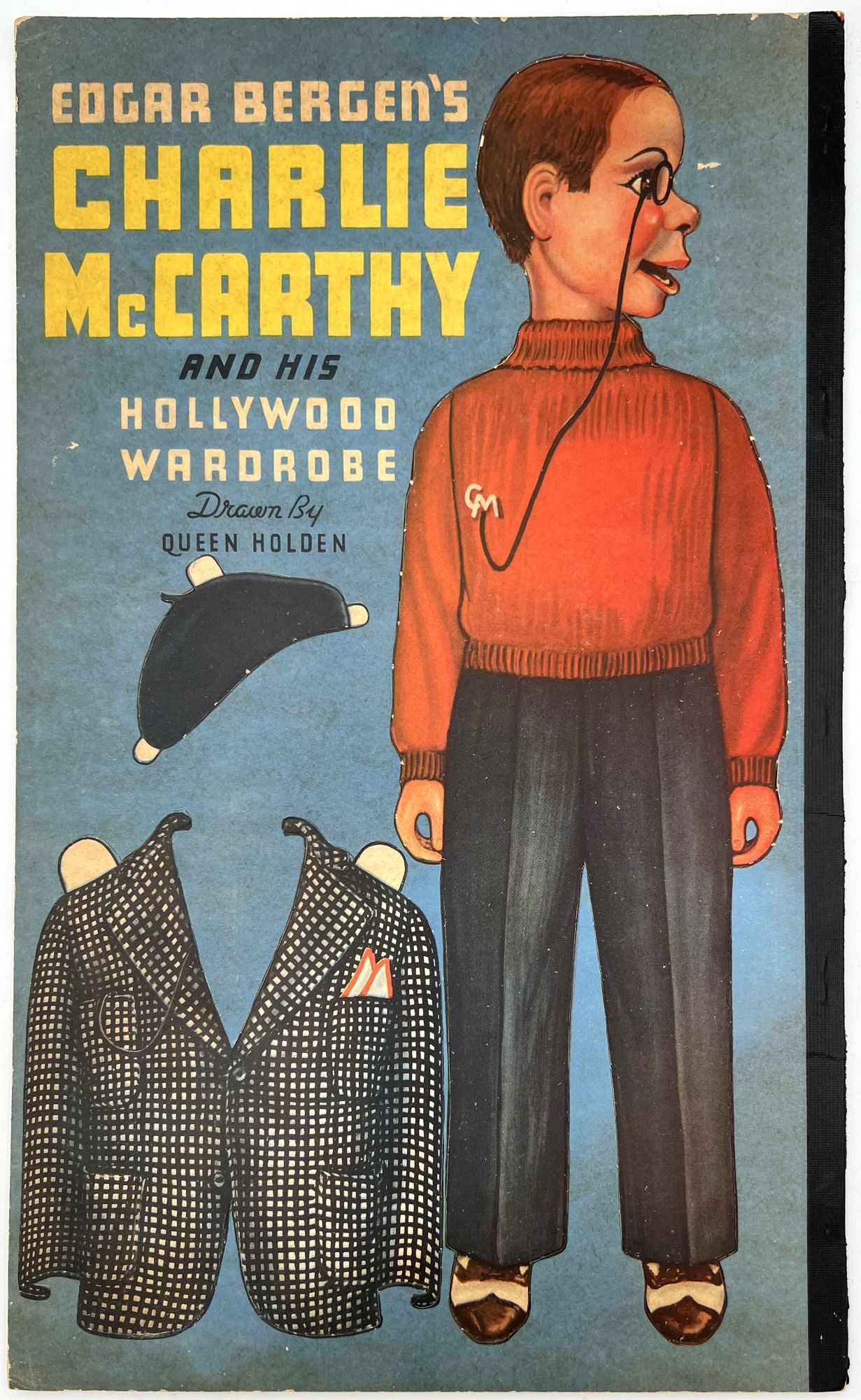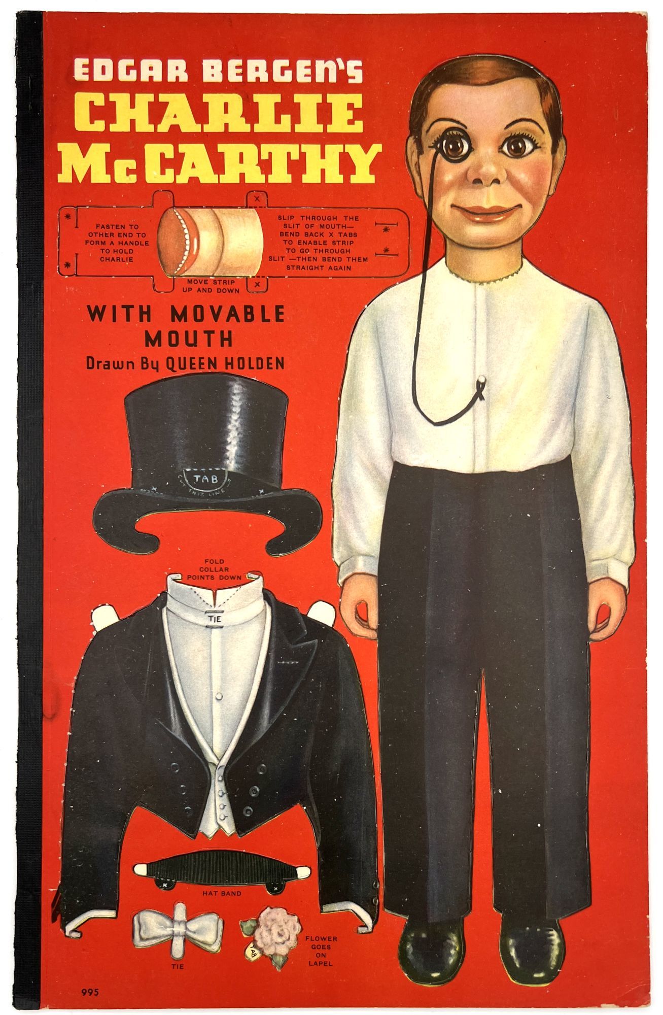 [Racine, Wisconsin]: Whitman Publishing Co, 1938. Very good. Short tear to bottom of spine. Ink stamp and sticker of later owner to inside of lower cover.. A complete, uncut copy of a paper doll book for children of a ventriloquist doll, "Edgar Bergen's Charlie McCarthy". What sets this paper doll book apart is that it has a movable mouth that can be attached to the doll. There is a second doll on the lower cover without the same feature. Inside the book are two more dolls (one with, one without a movable mouth) and one leaf with an additional outfit and accessories. In total there are four dolls and five leaves of card (16.75" by 10.75") bound at the left-hand edge with black cloth tape and staples. Edgar Bergen (1903-1978) was a ventriloquist and comedian known for popularizing modern ventriloquism.