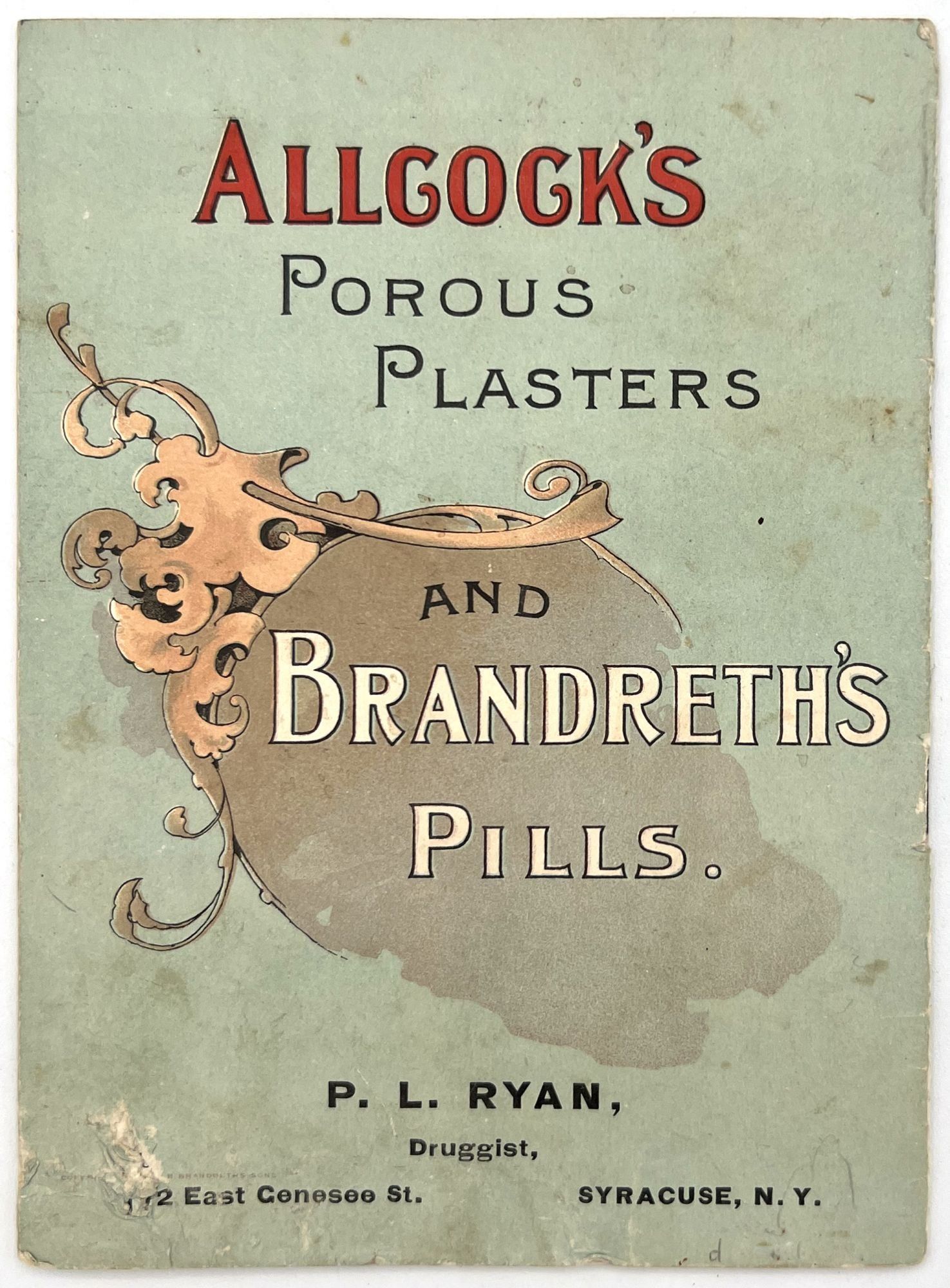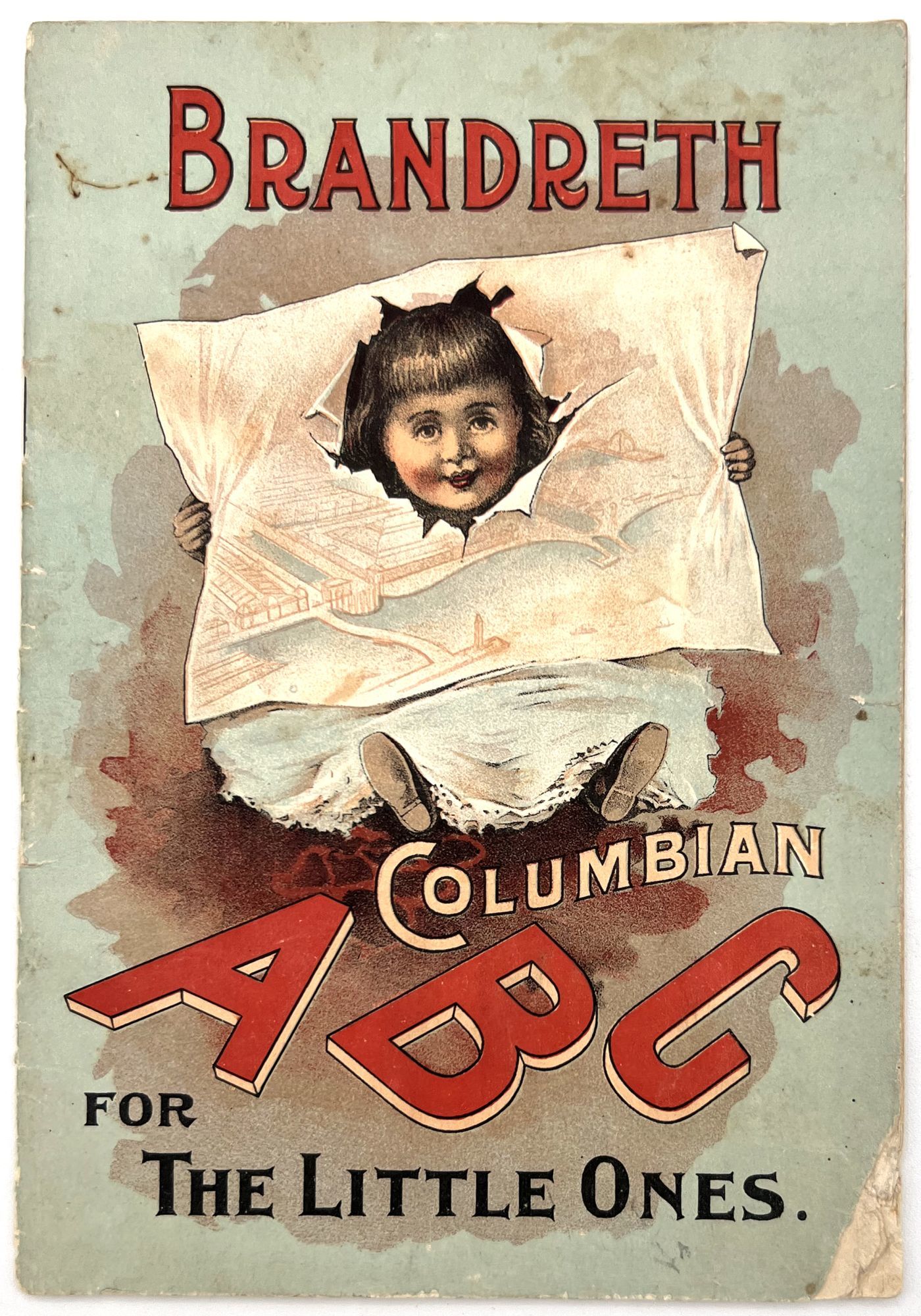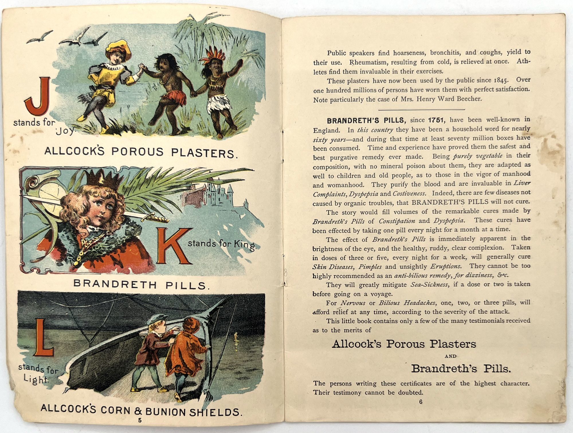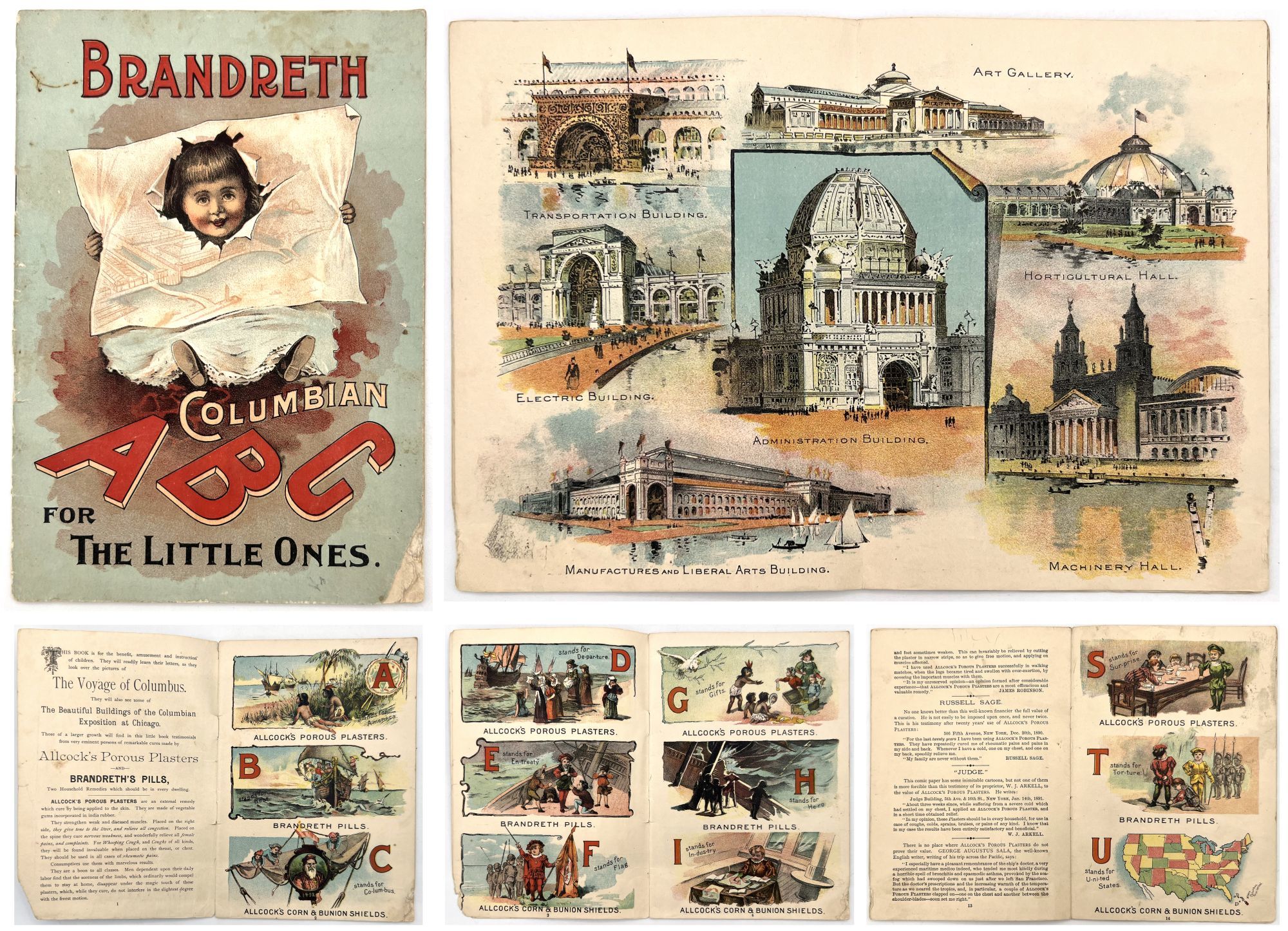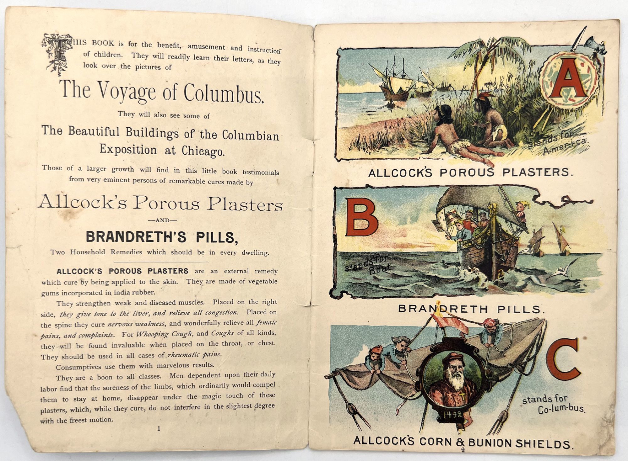 United States, 1893. Good. Light toning, dust soiling, a couple minor short tears, lower right-hand corner worn/torn. Child pencil scribbles to last leaf.. A color-illustrated ABC book for little readers, advertising family medicines and household remedies. The two main products advertised as Brandreth's Pills and Allcock's Porous Plasters. Each letter of the alphabet has a different color illustration of a significant moment in American history, highlight the Columbus expedition. Some examples: A stands for America, B stands for Boat, and C stands for Columbus. Note the interesting way in which Native Americans are depicted. Issued in tandem with the 1893 Columbian Exposition, and includes a two-page spread of the famous exhibition halls in the center of the book. Single vol. (7.25" by 5") , [1], 18, [1], illus., in original illus. self wrps with image of a baby ripping open a map on the front, sales agent information printed on lower wrapper. An excellent example of how specific interpretations of American History are presented to children through ephemera and advertising early in life.