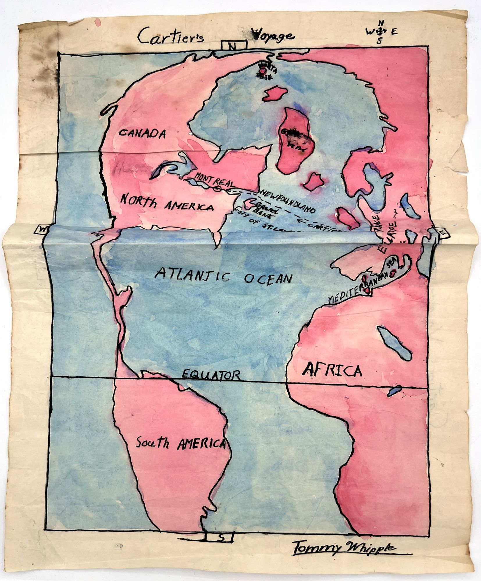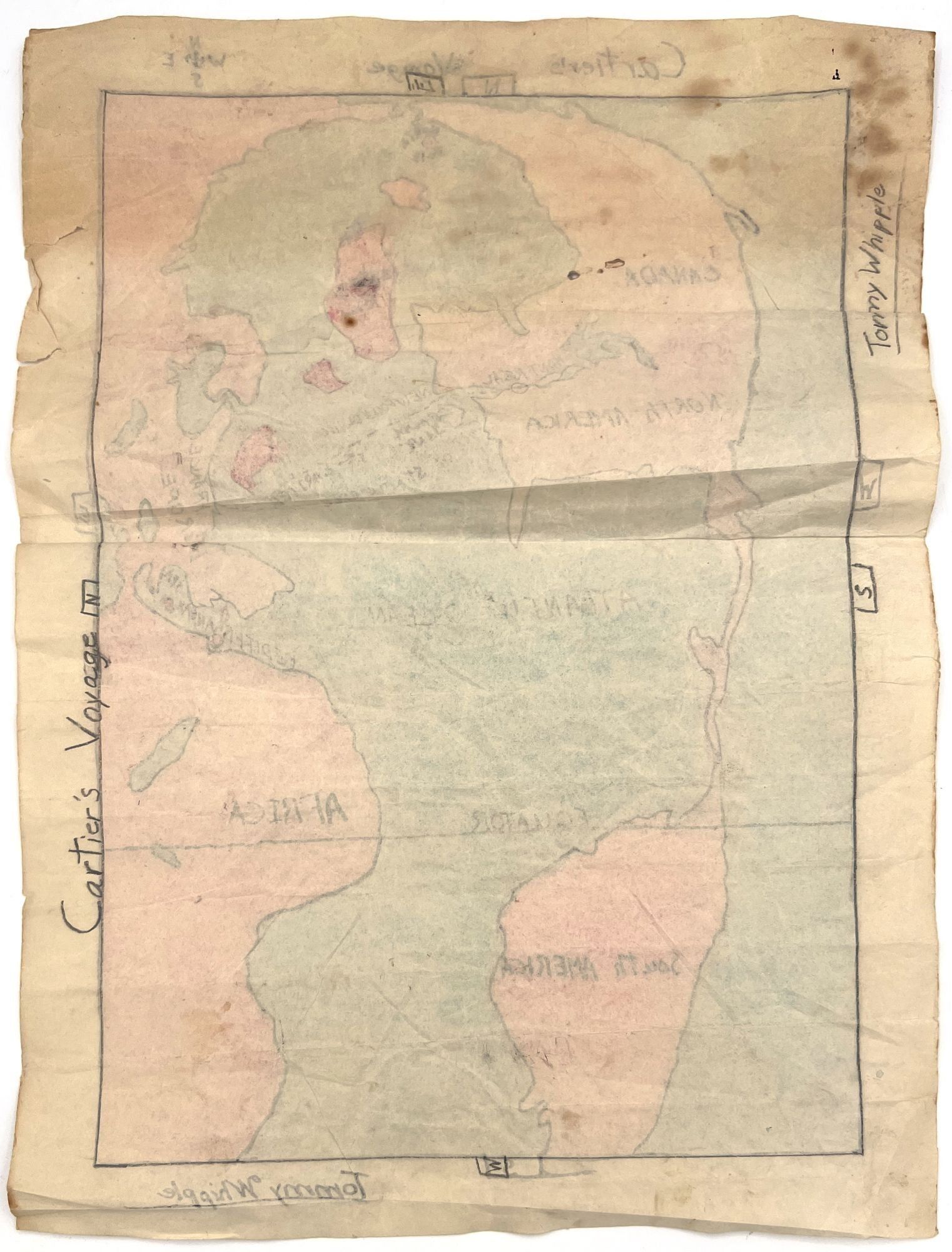 United States, 1950. Good. Water staining, toning, short tears.. A charming school cartography project signed at he bottom by "Tommy Whipple", aged 8 or 9. The project depicts the voyage of maritime explorer Jacques Cartier, the first European to map the Gulf of St. Lawrence. The student drew the map with pencil, then went over it with black ink and watercolor. Components included and labeled in the project: continents and countries; a compass rose; the Equator; the Atlantic Ocean; Cartier's journey, with his destination; and the North Pole. Measures approx. 18" by 13". Has sadly not been graded by the teacher. The perspective on the map is terrific from the eyes of a young person.