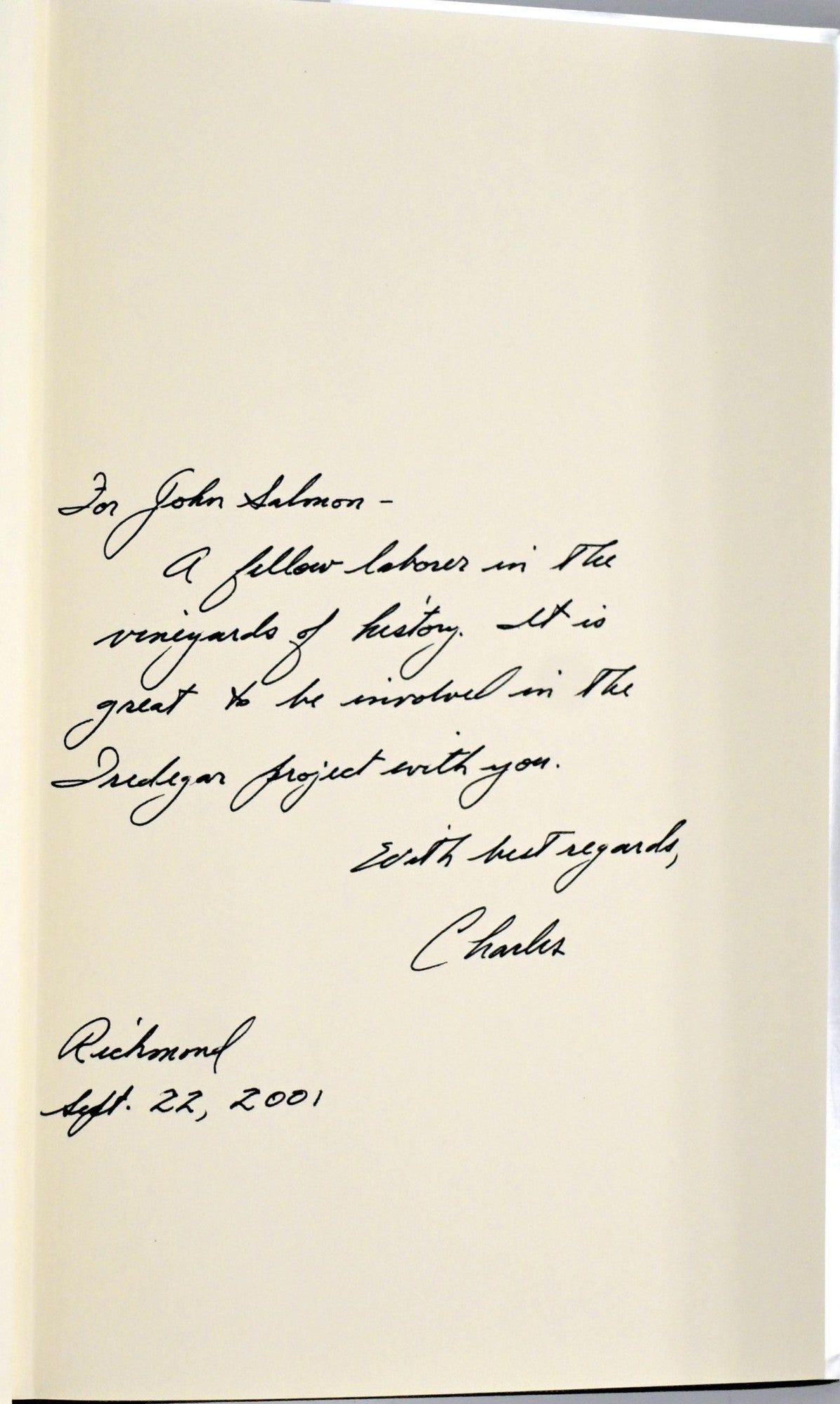 Charlottesville, 2001. Near Fine binding/Near Fine dust jacket. 8vo; in the publisher’s grey cloth binding; with tilting on the spine in gilt; in an unclipped jacket; x, 124 pages including the Index; some light scuffs to the jacket but overall a very nice copy.~~Inscribed by the author on the front end paper “For John Salmon - a fellow laborer in the vineyards of history. It is great to be involved in The Tredegar Project with you. With best regards, Charles”~~It is signed by the author on the title page. Near Fine binding / Near Fine dust jacket.